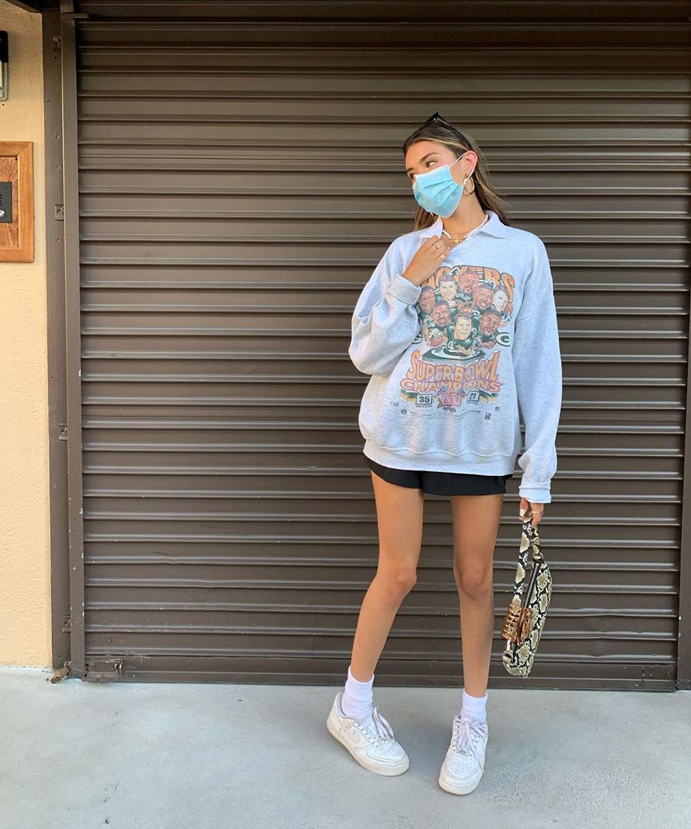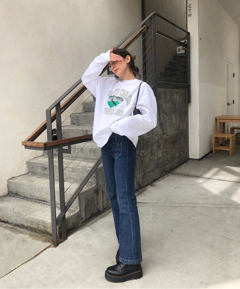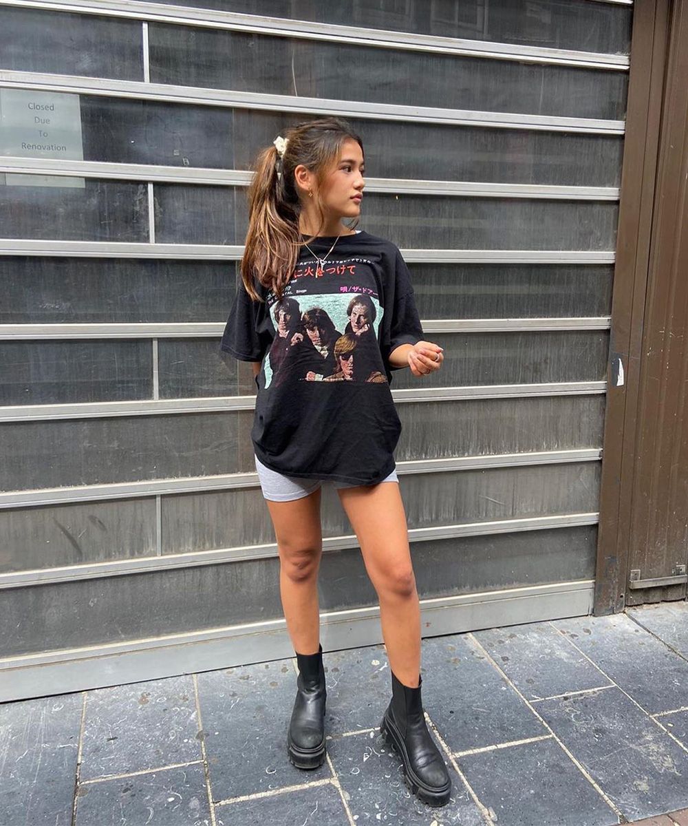 Rock band t-shirts, Dr Martens, tennis skirts and maxi sweatshirts with random prints, low-waisted jeans, (hyper) cropped t-shirts. All typical elements of the Y2K aesthetic, literally the year 2000, whose acronym is used to define the retro-futurist aesthetic of the time.