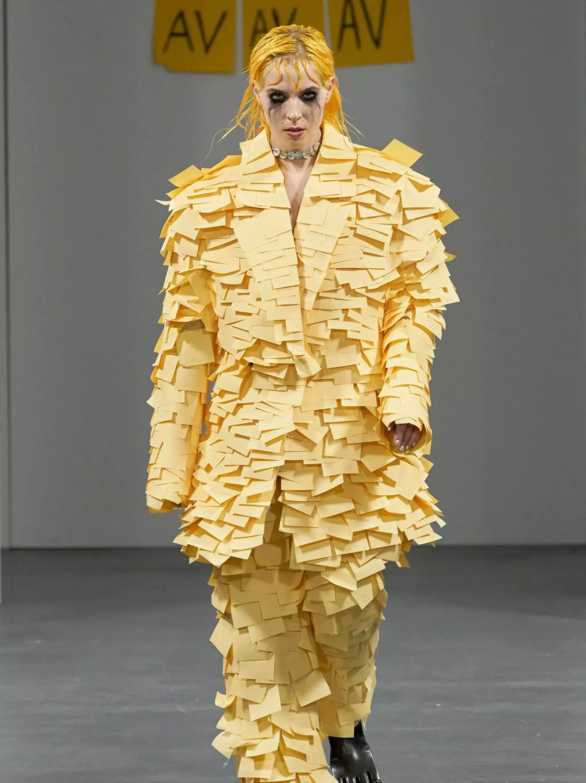 Looking for a last-minute idea? Then look no further than AVAVAV, who brought a range of unfinished dresses to the catwalk for their SS24 fashion show, accompanied by rocking make-up. There are two styles to choose from that we all have at home: the power suit made from Post-it notes and the dress made from tape. If you go for the outfit, let your artistic streak run wild and combine it with bold hair and black, smudged eye make-up with eyeliner dripping down to the cheeks.