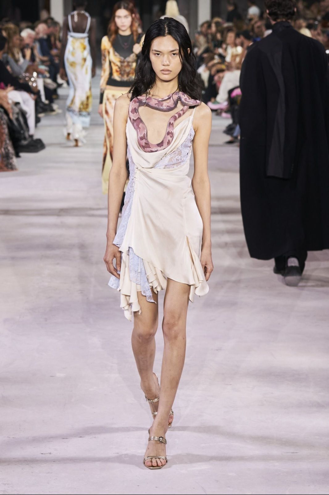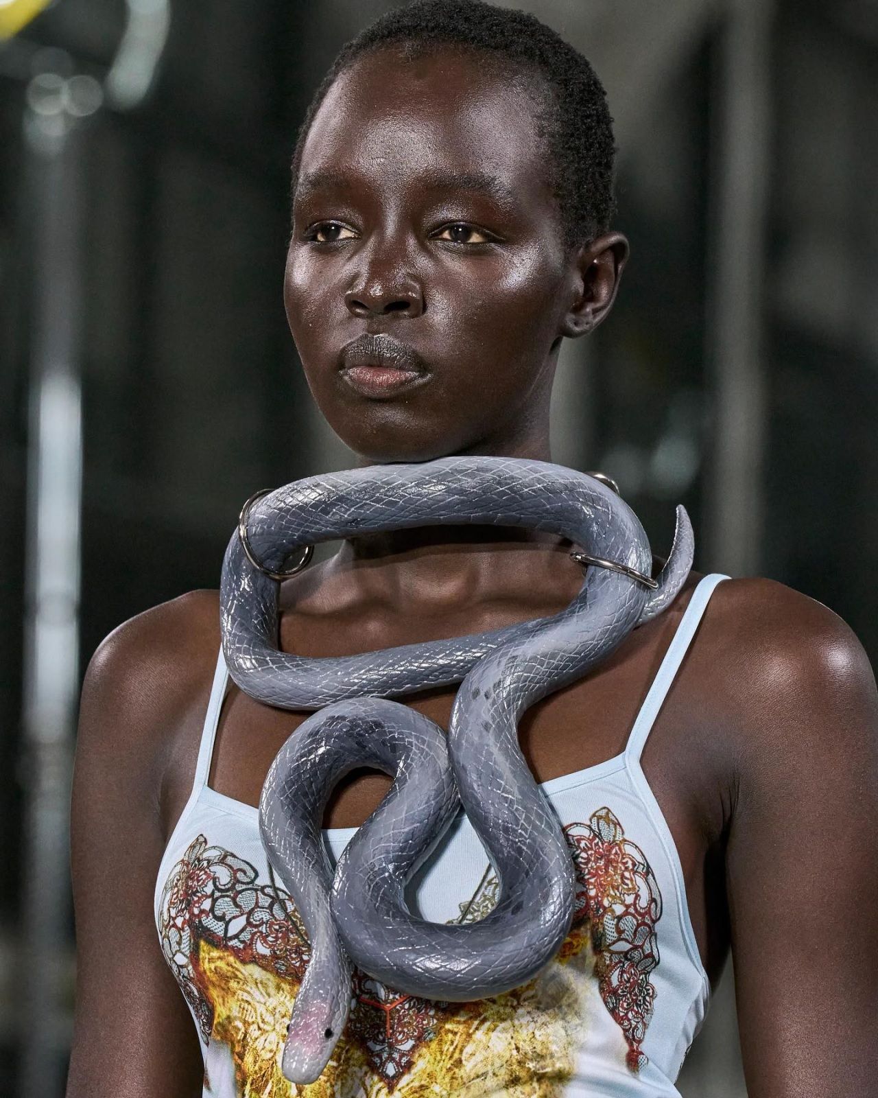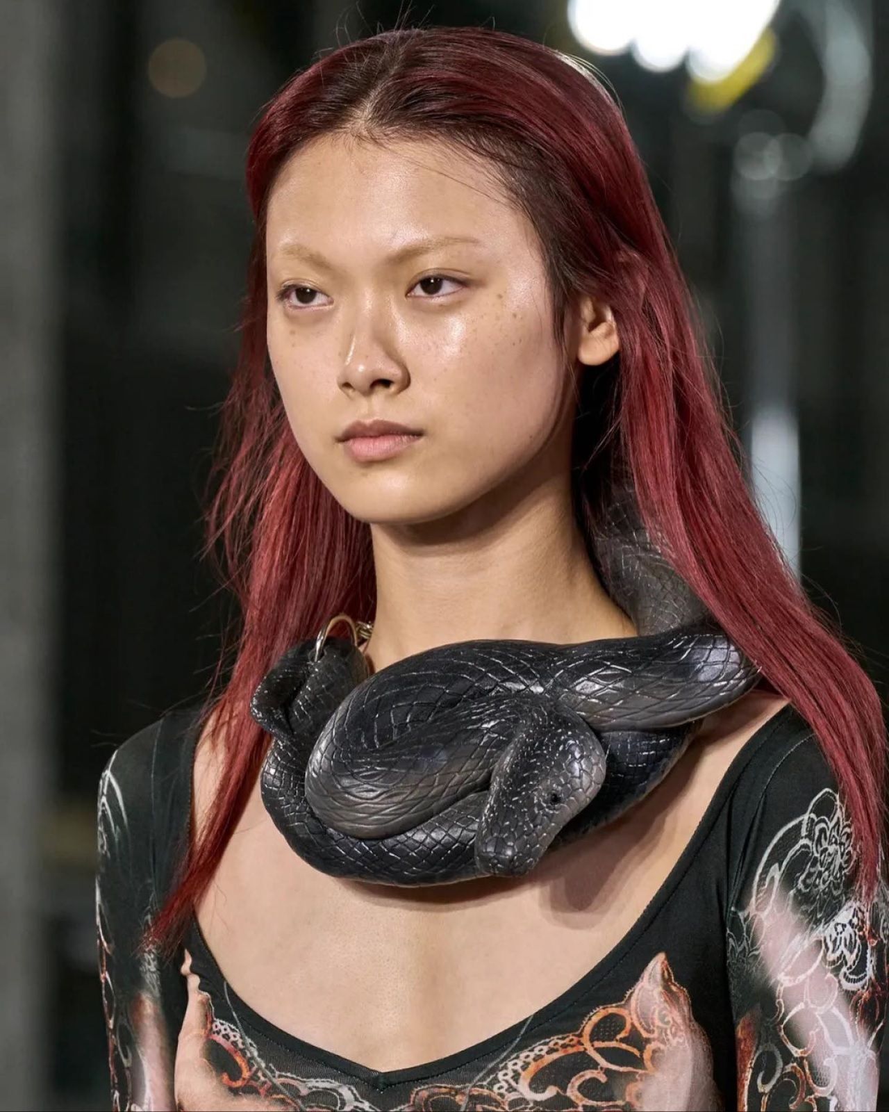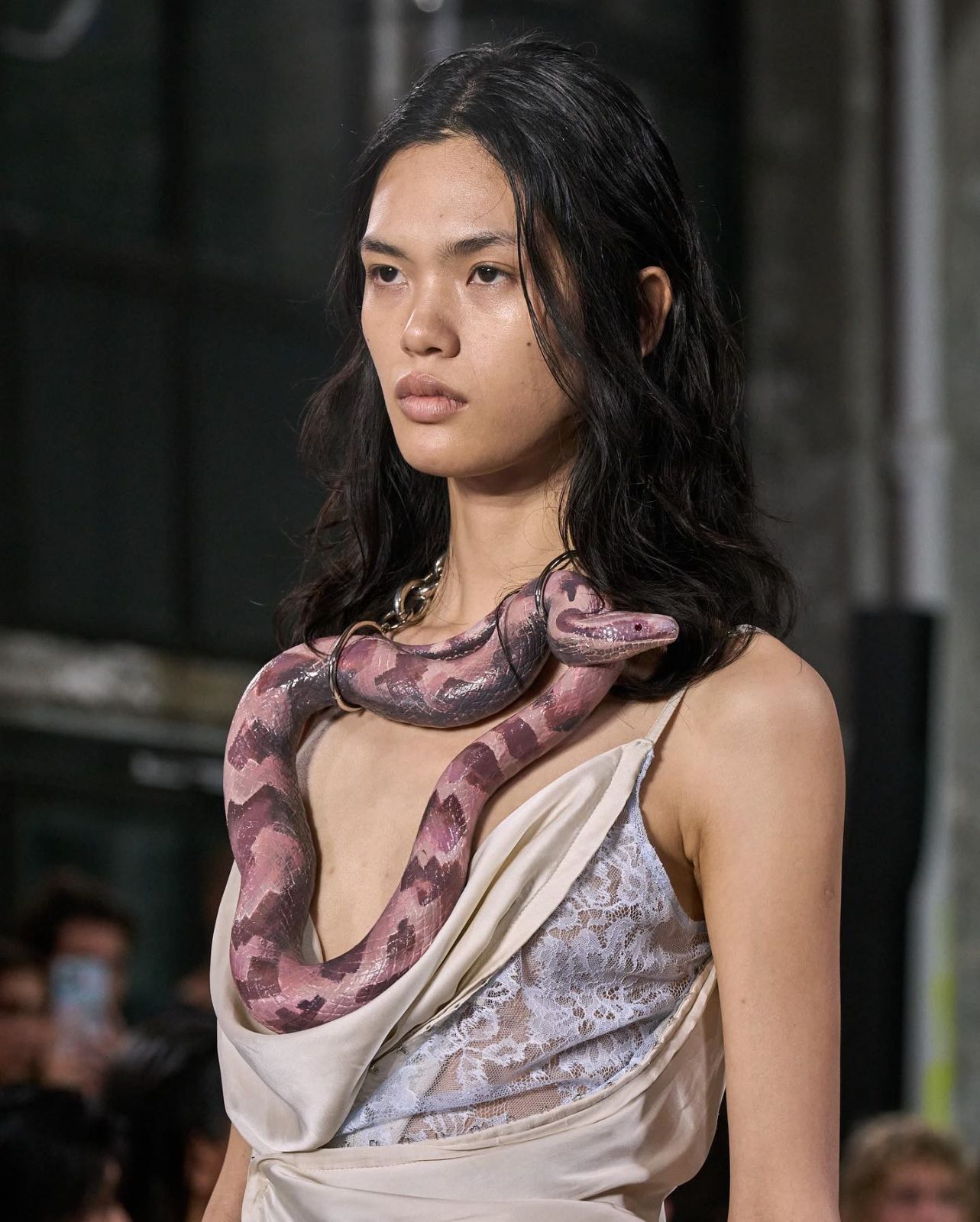 Here it's the accessories that make the look. Glenn Martens paired her slip dresses with very special necklaces: large snakes. Fake, of course, but pretty realistic. Once you find your favourite python and put it around your neck, you're ready for Halloween. Want a tip to add to the wow effect? Do it like the Y/Project models and do it without make-up and with glowing skin.