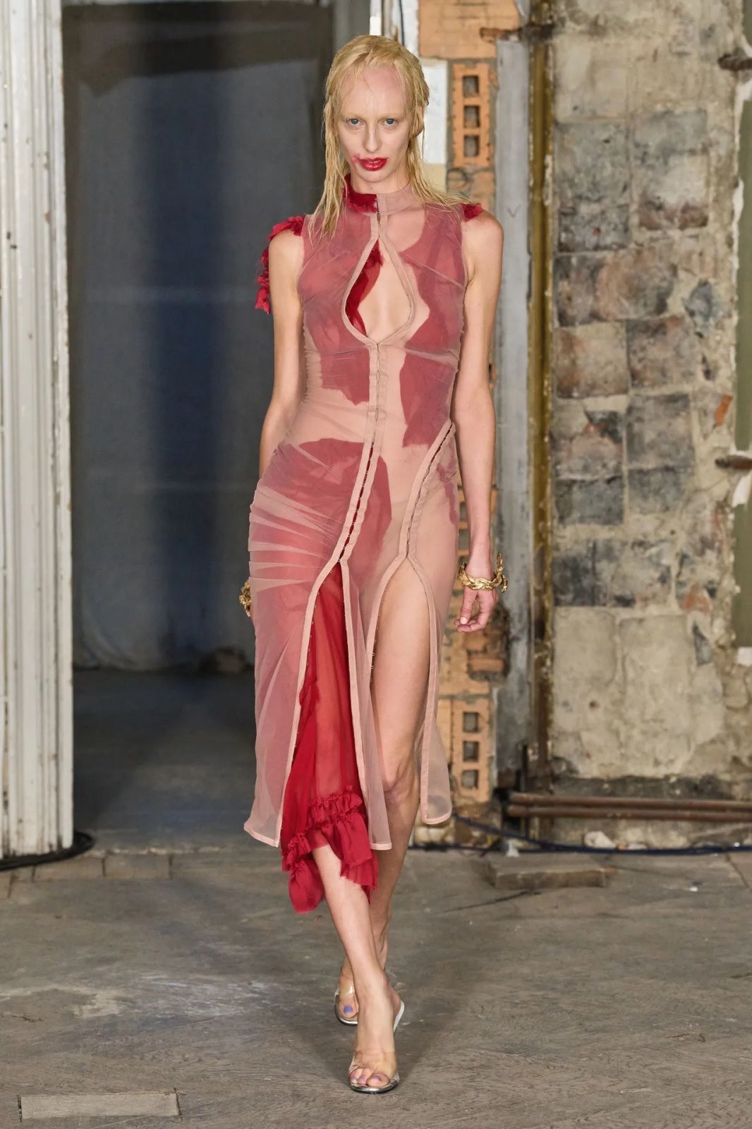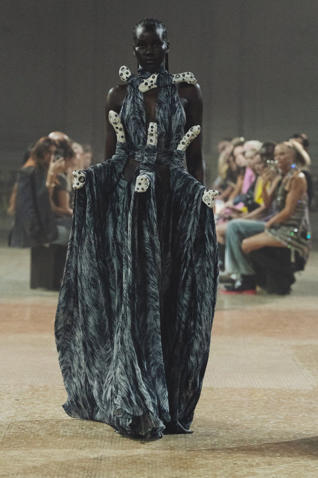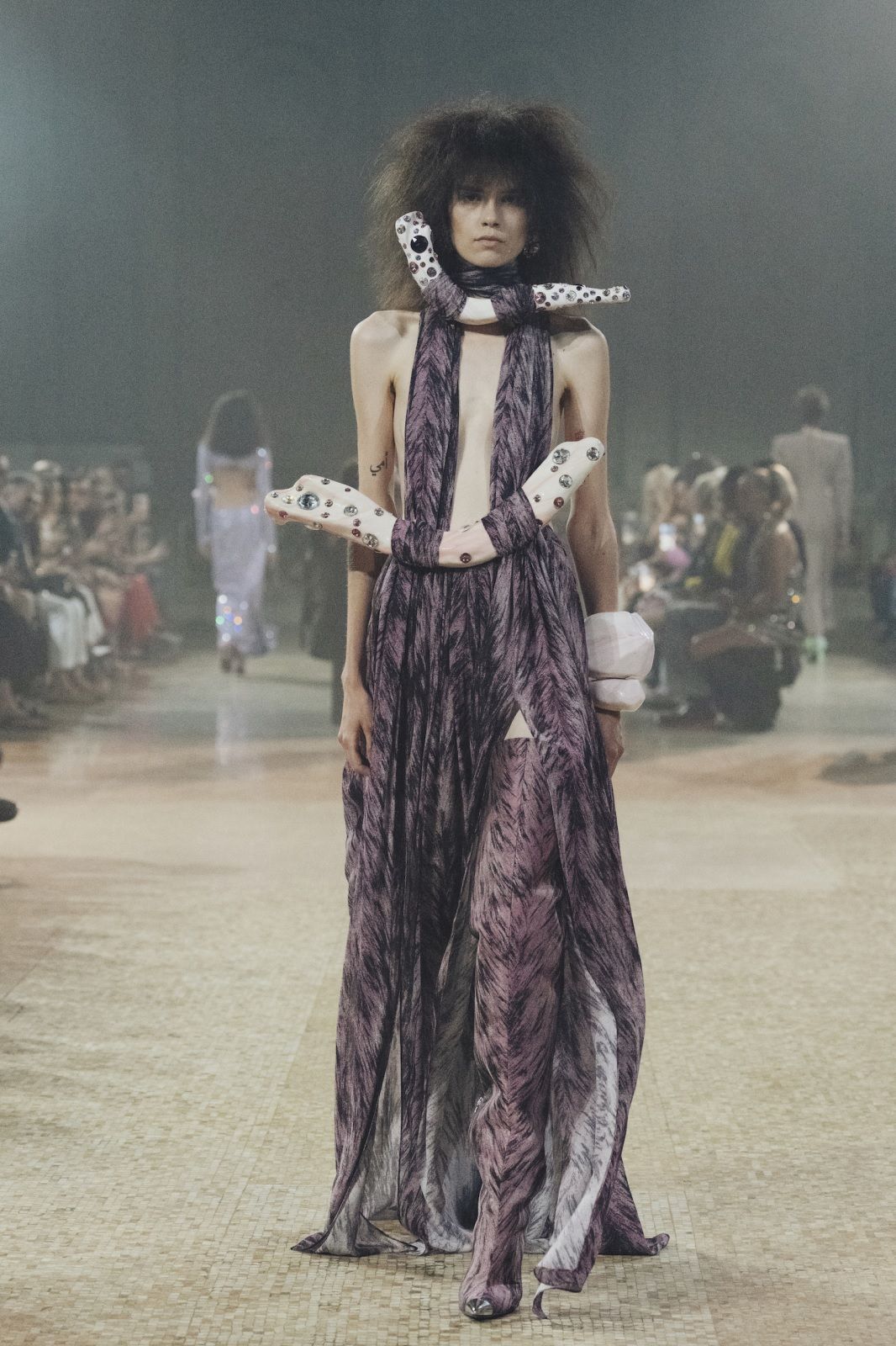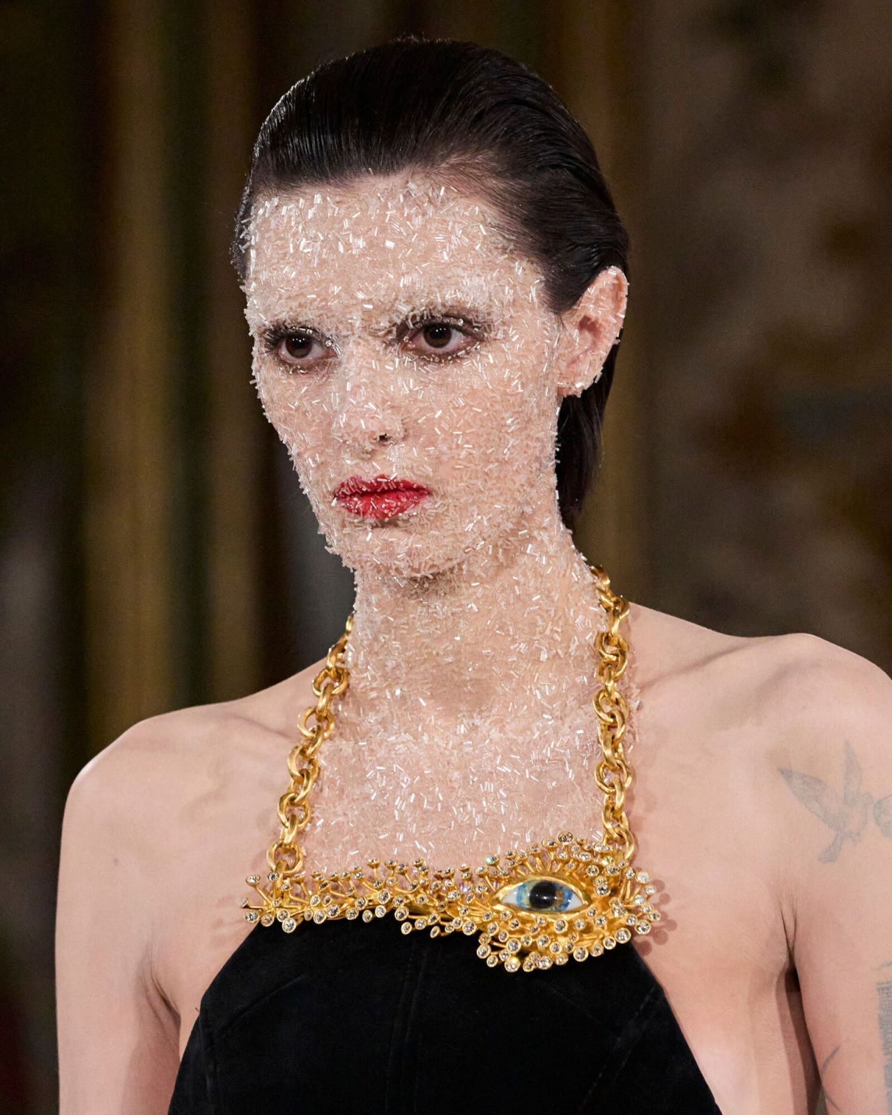 Here it's the accessories that make the look. Glenn Martens paired her slip dresses with very special necklaces: large snakes. Fake, of course, but pretty realistic. Once you find your favourite python and put it around your neck, you're ready for Halloween. Want a tip to add to the wow effect? Do it like the Y/Project models and do it without make-up and with glowing skin.
