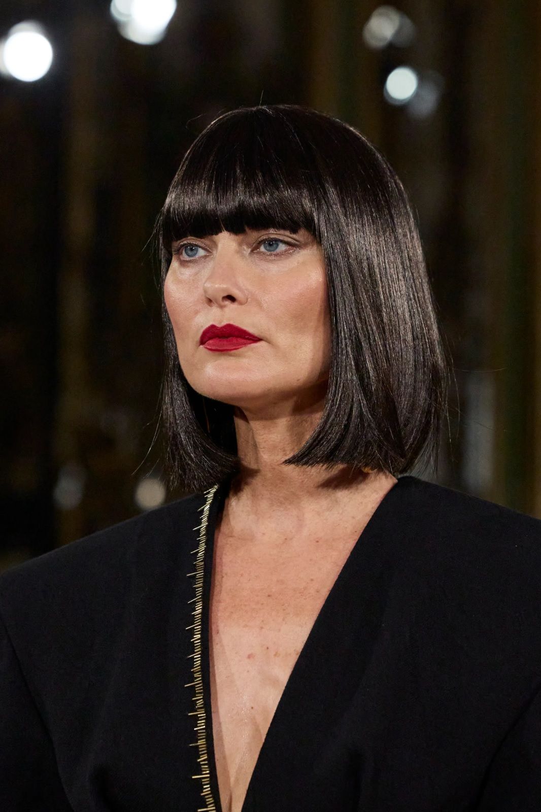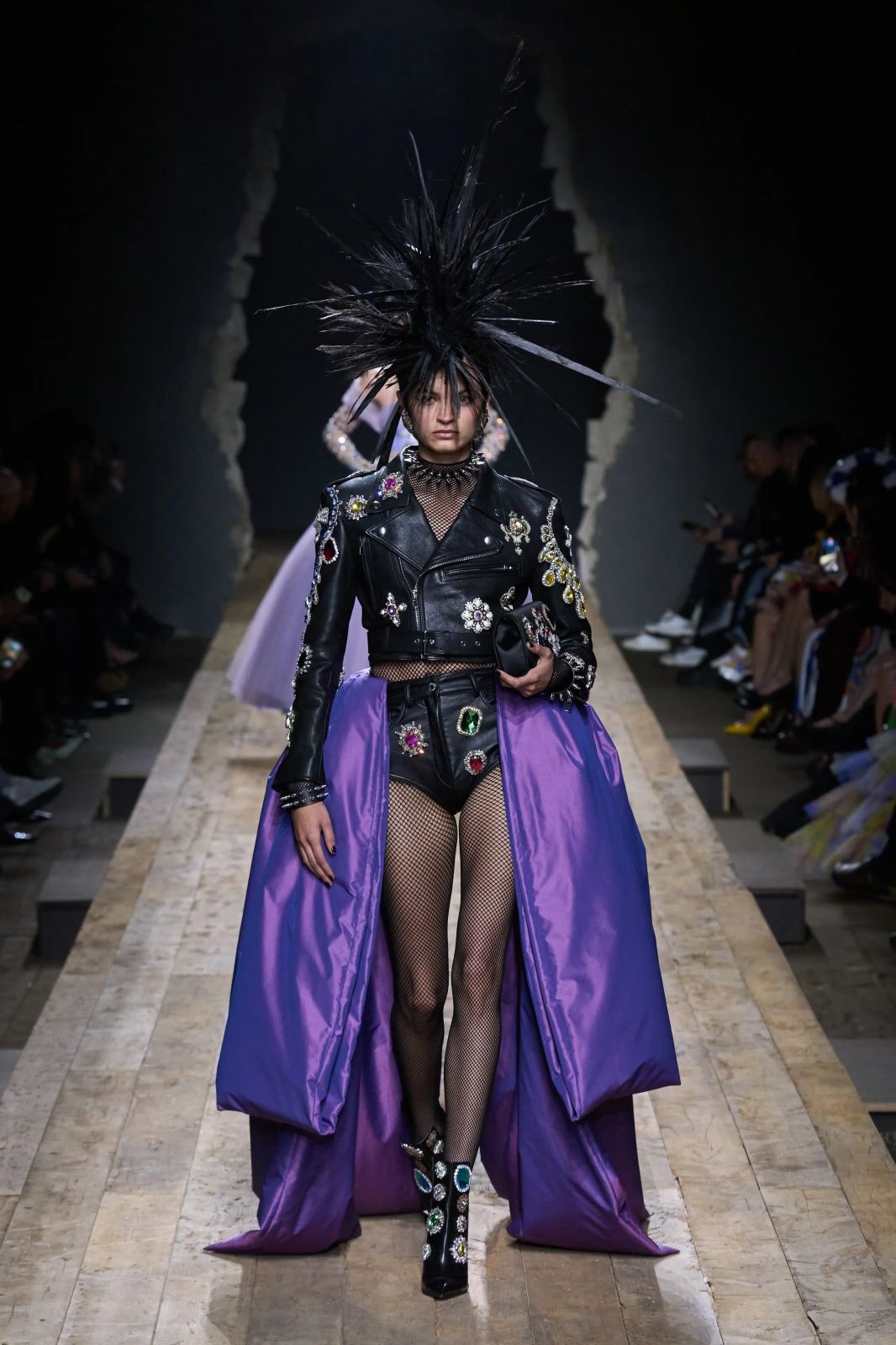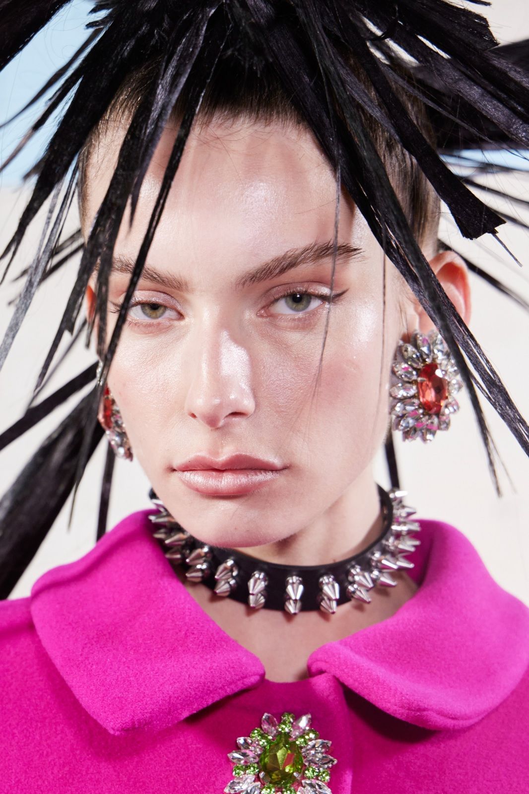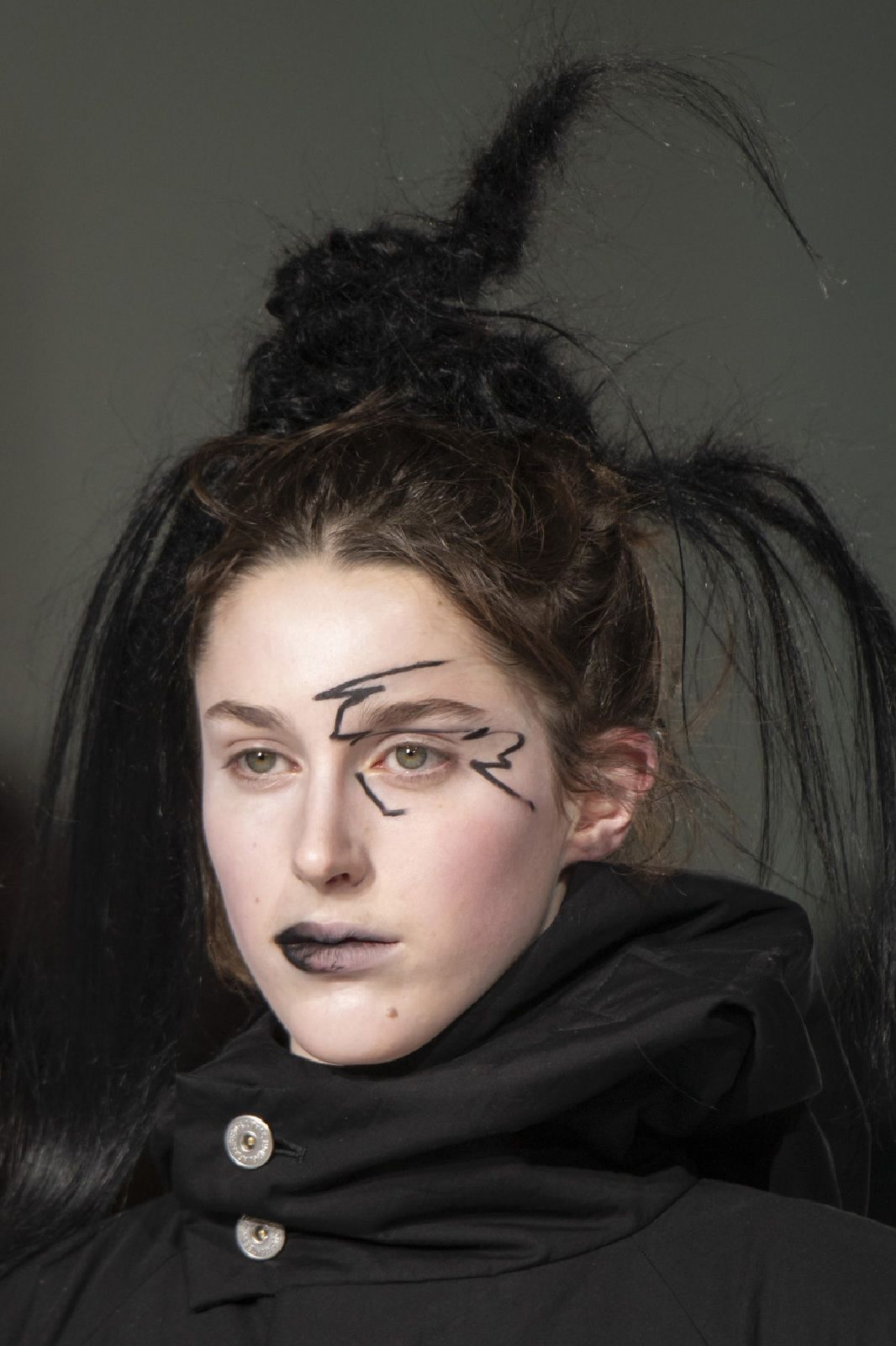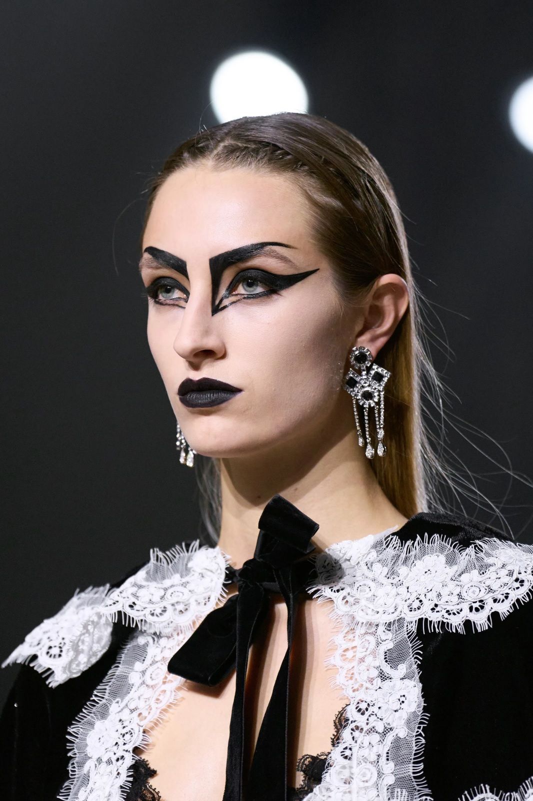 Are you undecided about your Halloween costume? Moschino's aristo punk girls are a good idea, with their 80s dresses, maxi jewellery and wigs reminiscent of 1960s London punks. To style them, the beauty team used a combination of hairspray and straighteners. The focus of the make-up was on the rocking eyes, which were accentuated with liquid eyeliner and a suggested comma in the style of the crests.