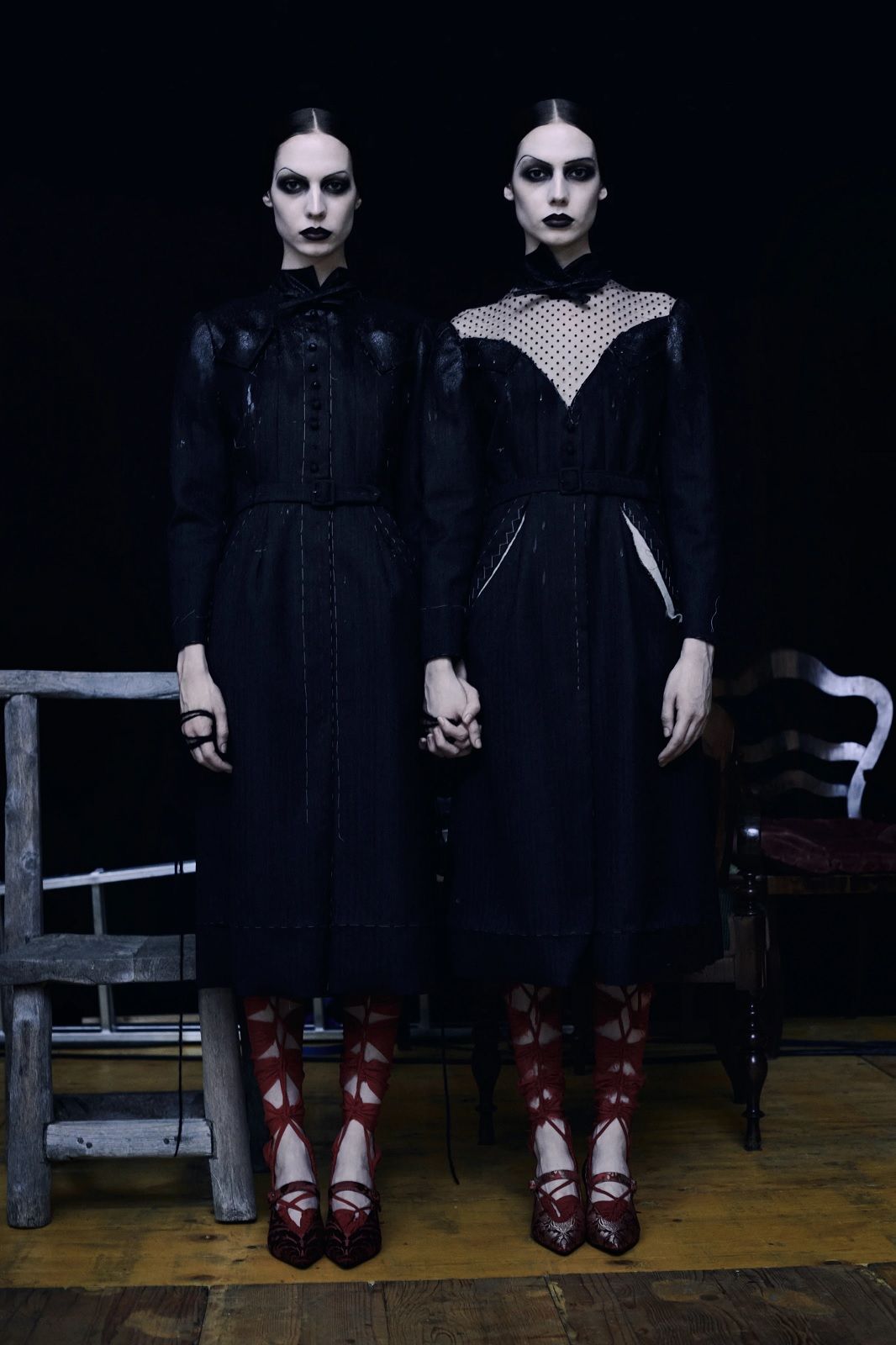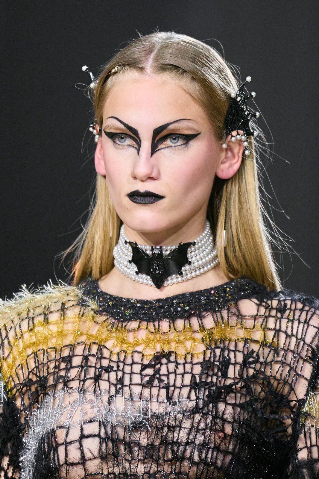 Corsets, crinolines and fin dé siecle shapes meet punk. The make-up made of graphic signs around the eyes and black lipstick applied only partially is perfect for Halloween.