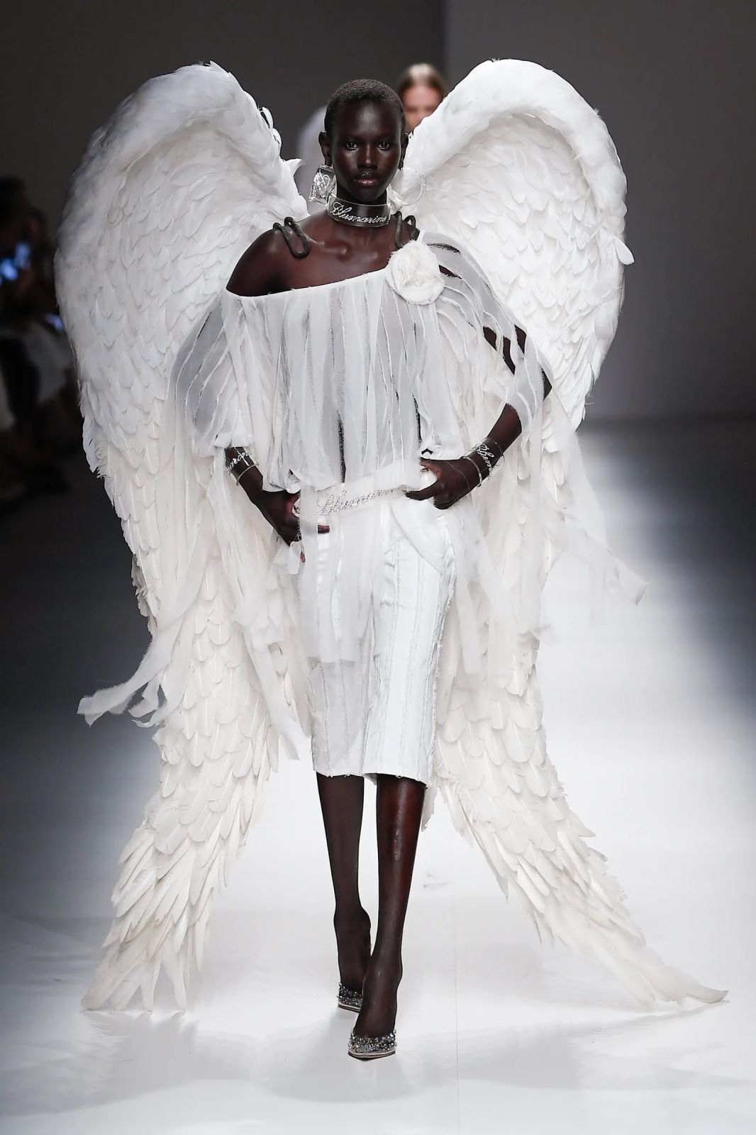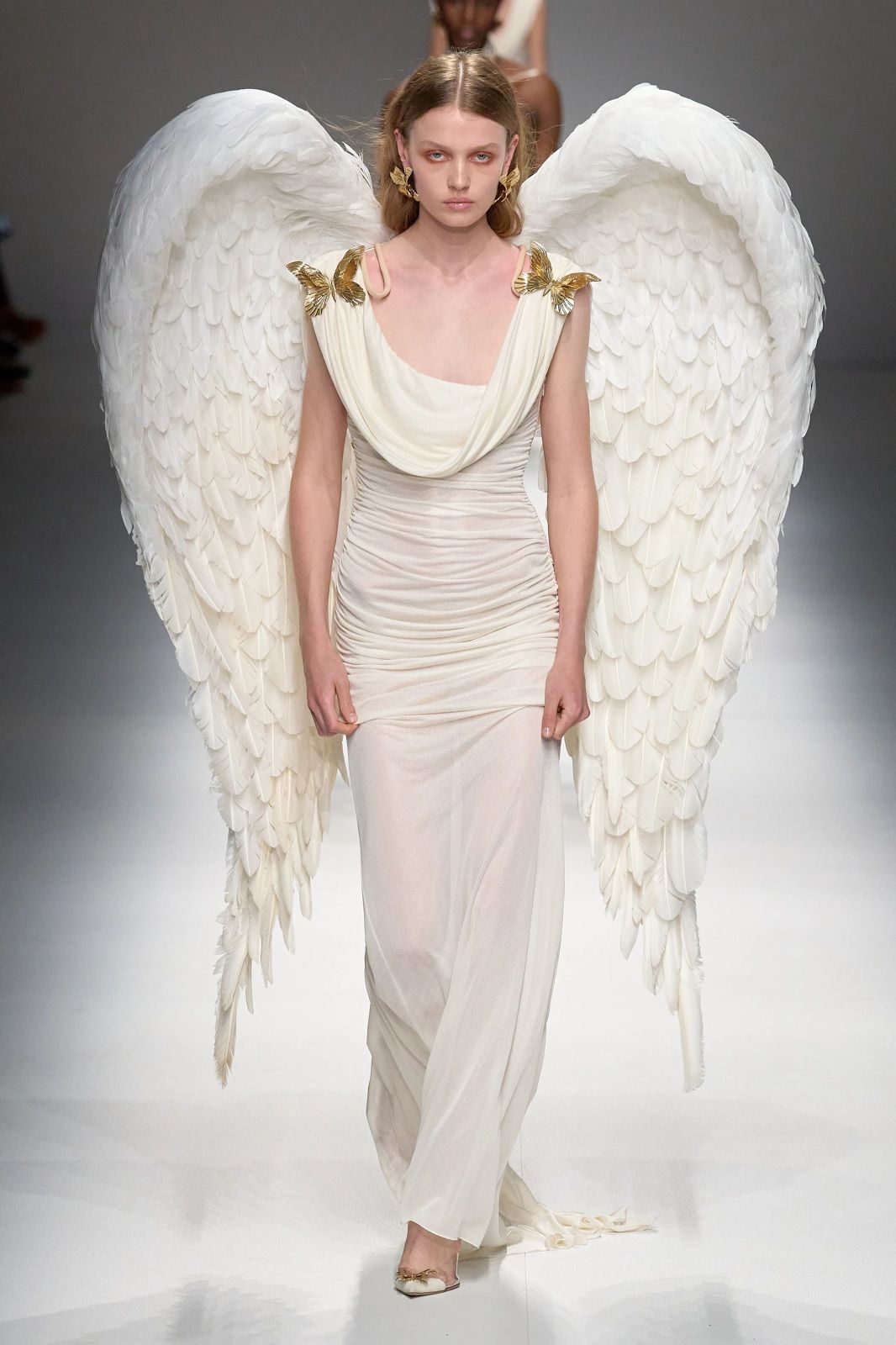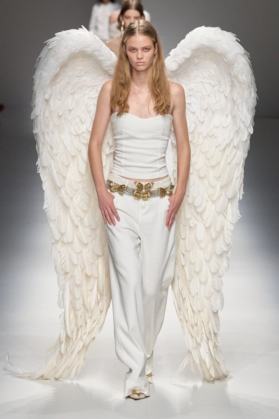 Nicola Brognano brings a host of sinful and sensual fallen angels to the Blumarine catwalk. They have big wings on their shoulders and are dressed only in white, with touches of gold and little butterflies. Turning into one of them for Halloween is not difficult. Just find the wings, wear an all-white outfit and smudge some red eye shadow around the eyes.