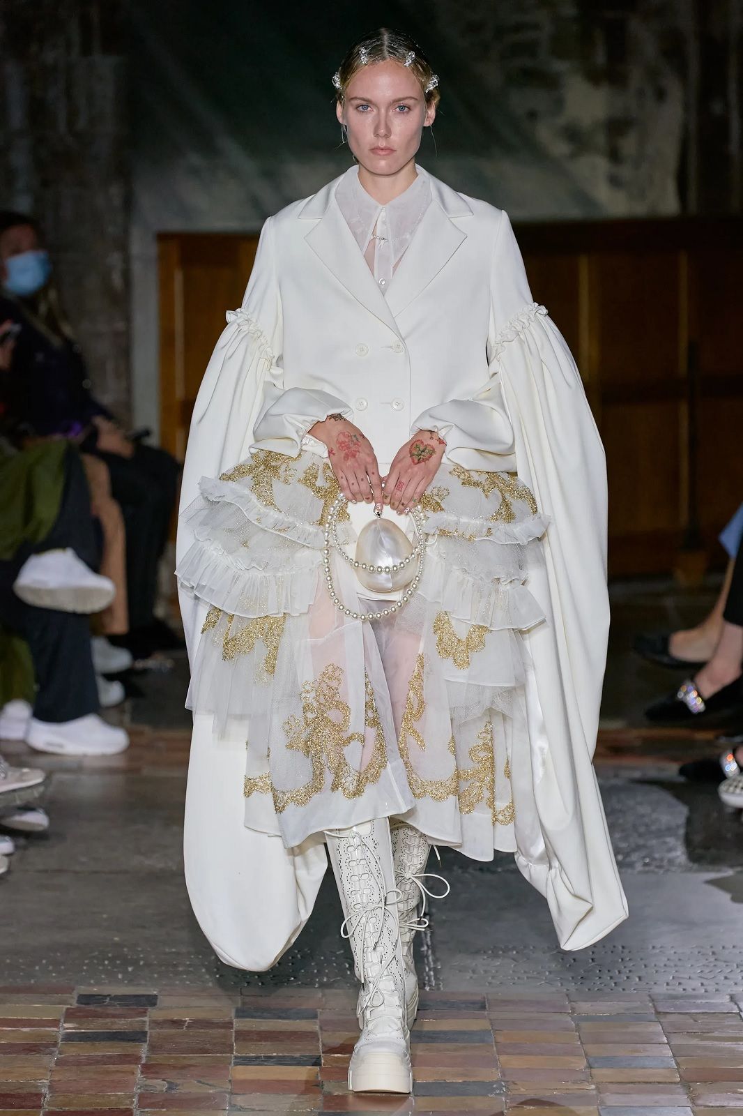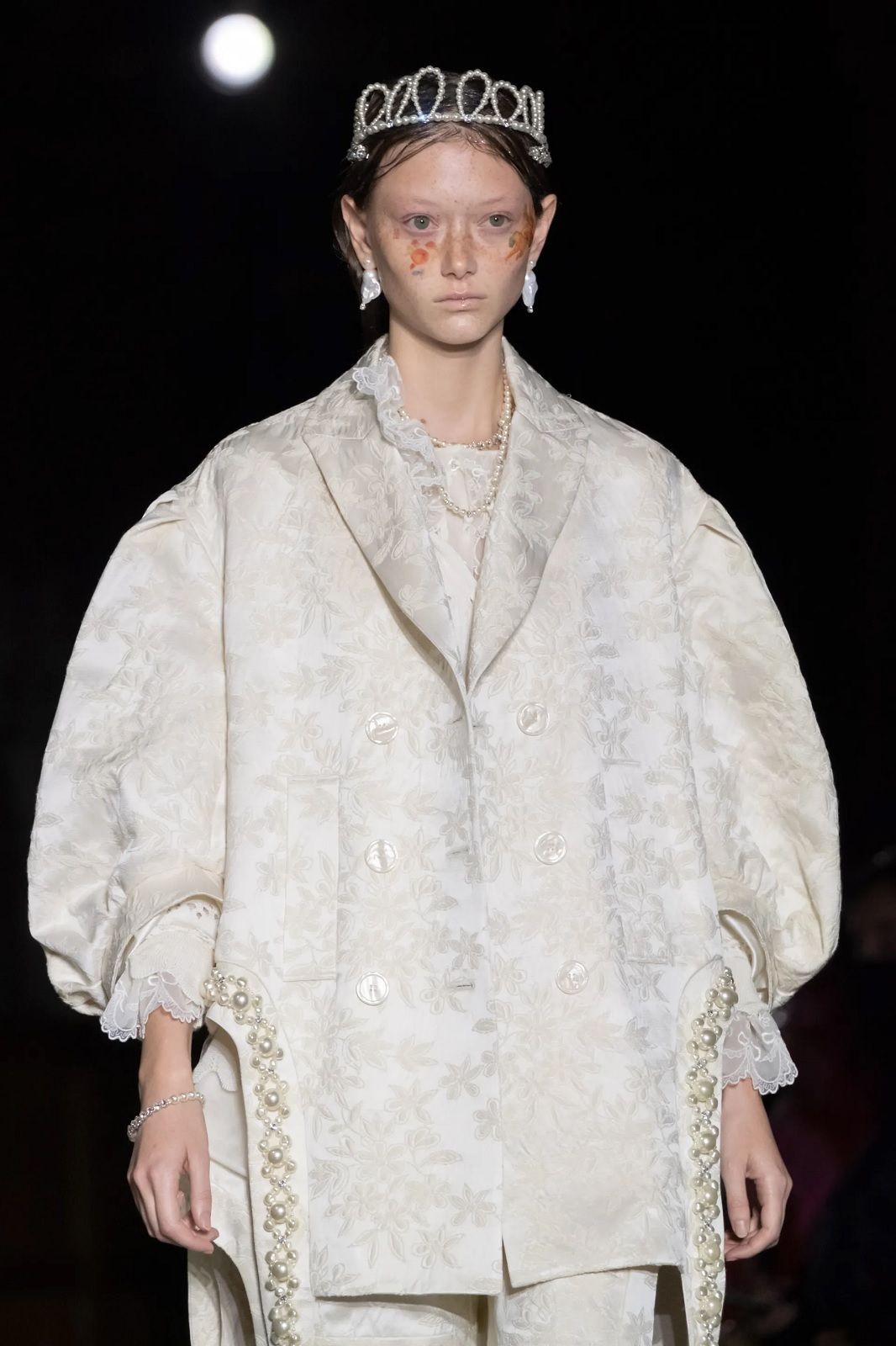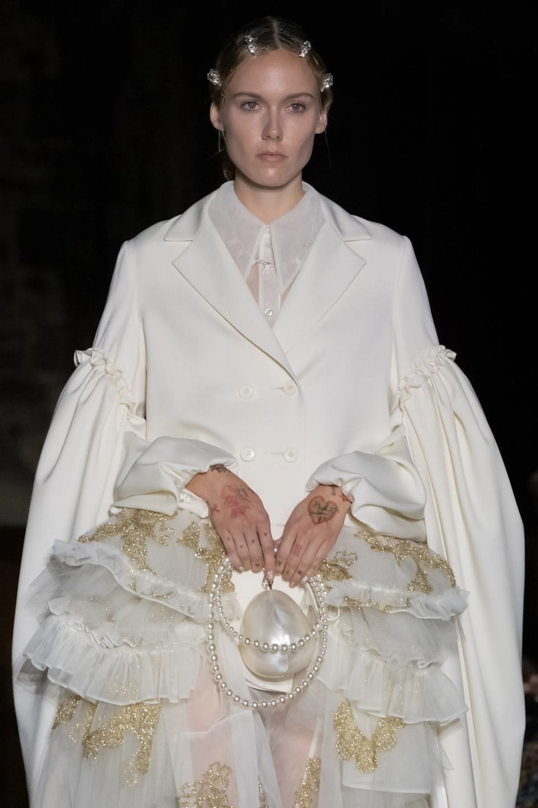 In the creation of her latest collection, Simone Rocha took inspiration from her recent maternity, turning all the pain, joy and sleepless nights into a series of dresses with exaggerated hips, full of lace and studded with jewels and pearls. The key item is the collar, oversized and embroidered, recalling both the Edwardian style and the baptism or first communion dresses. The look is completed by crystal tiaras, handbags, hairpins full of pearls and hair gathered in scenographic braids.