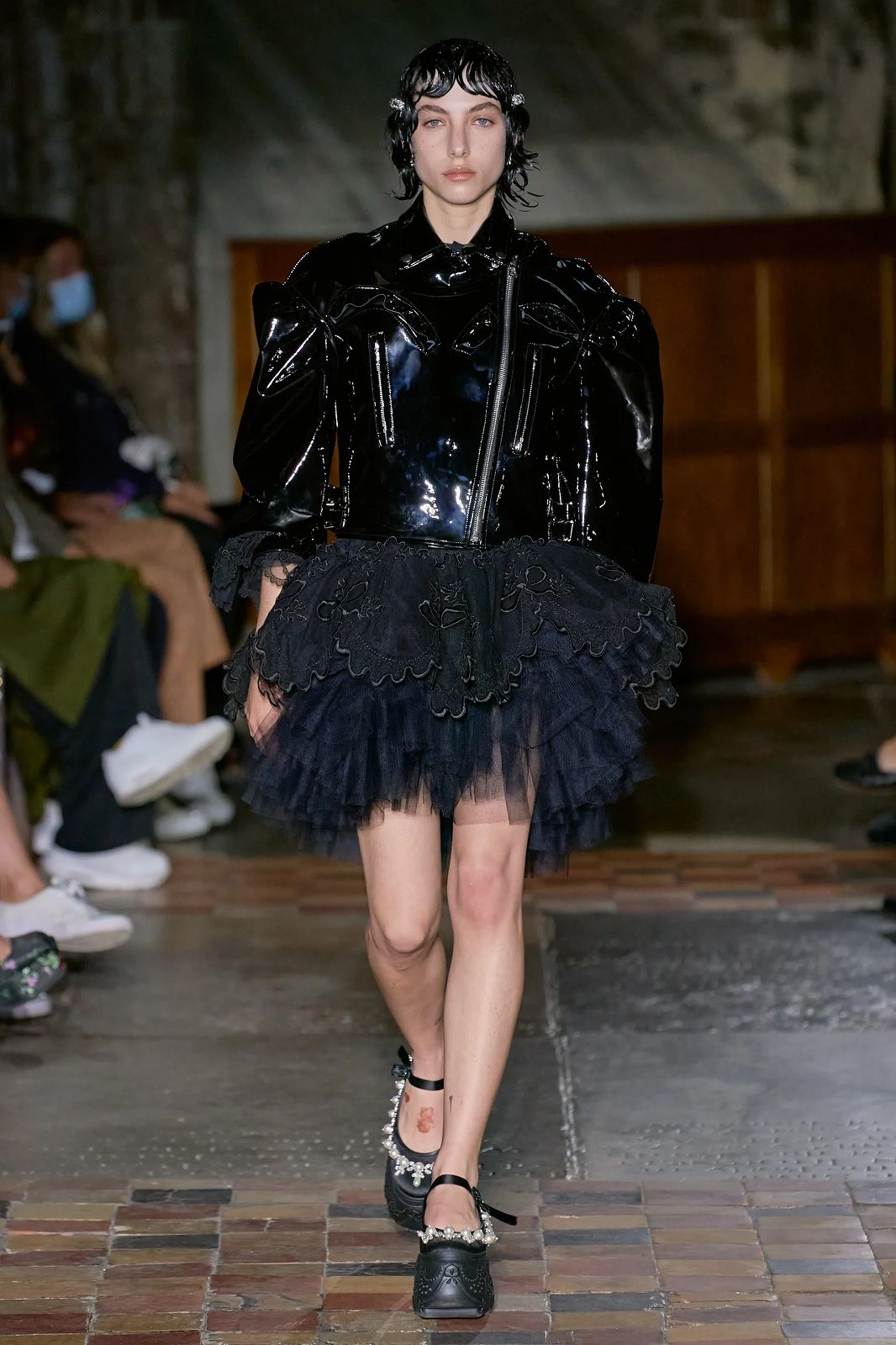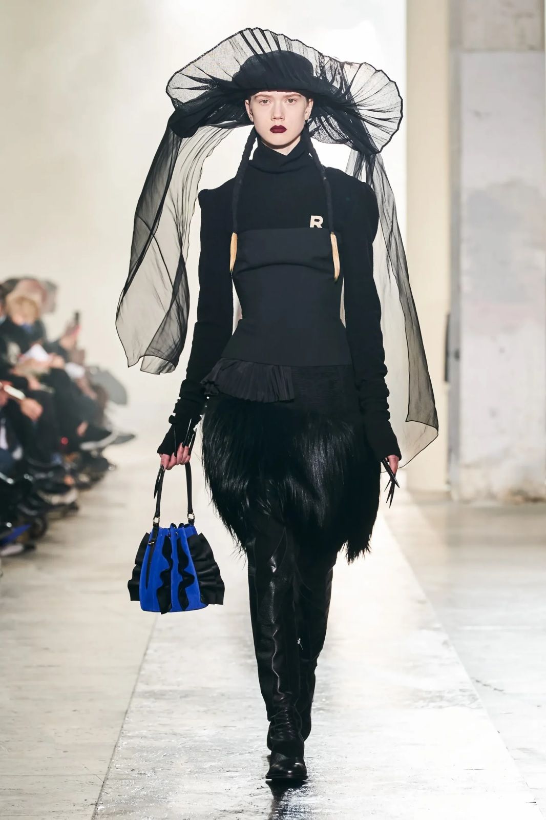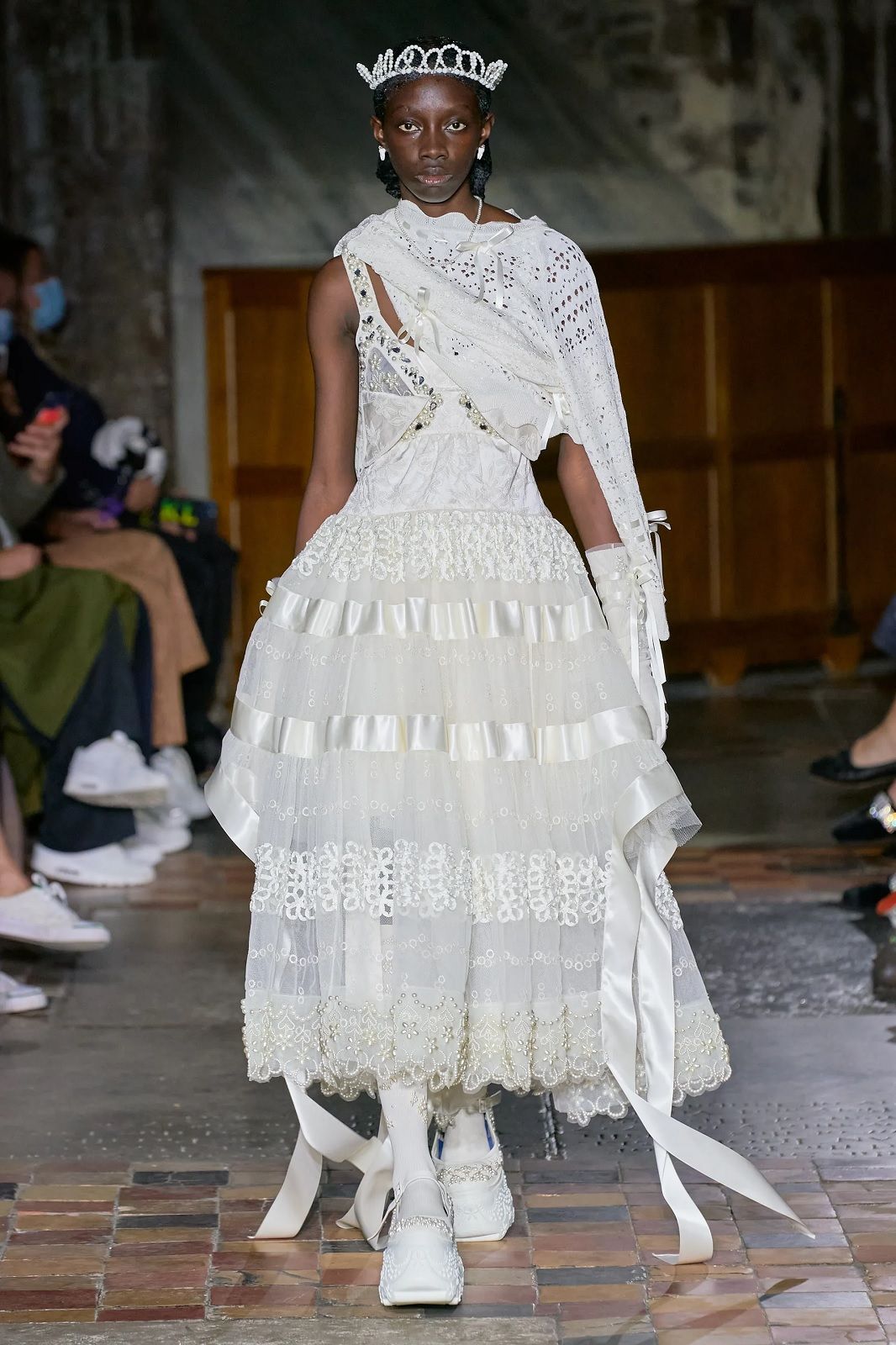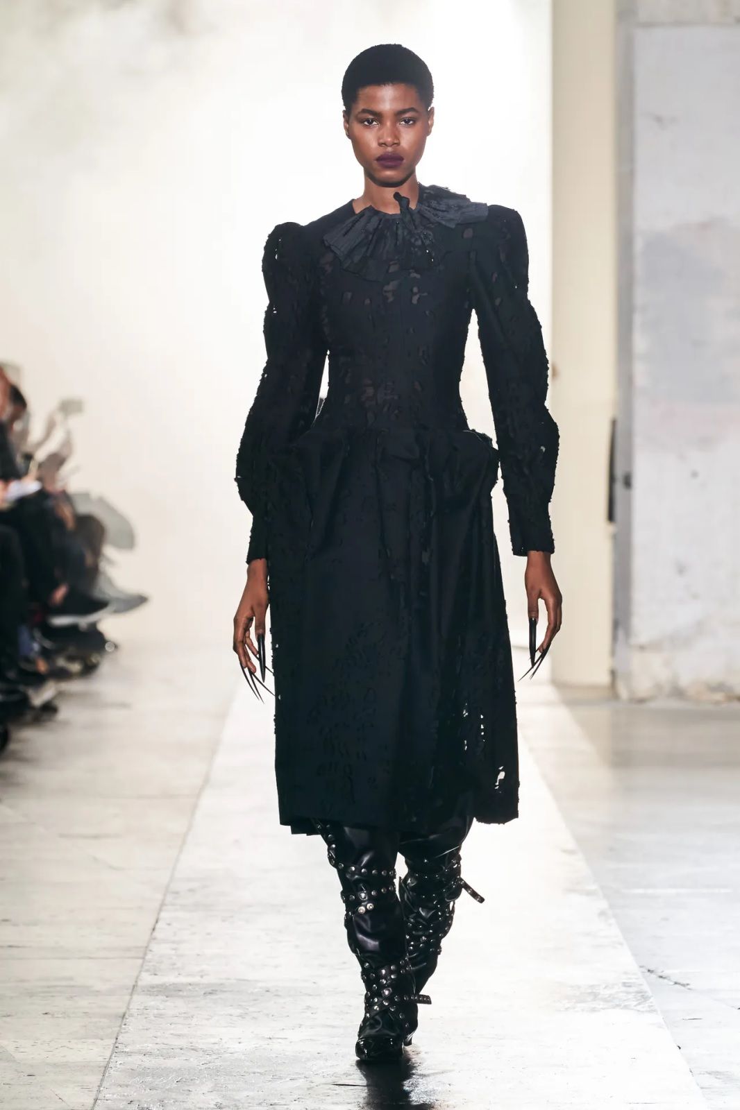 In the creation of her latest collection, Simone Rocha took inspiration from her recent maternity, turning all the pain, joy and sleepless nights into a series of dresses with exaggerated hips, full of lace and studded with jewels and pearls. The key item is the collar, oversized and embroidered, recalling both the Edwardian style and the baptism or first communion dresses. The look is completed by crystal tiaras, handbags, hairpins full of pearls and hair gathered in scenographic braids.