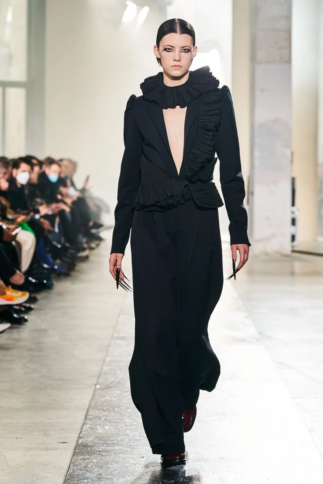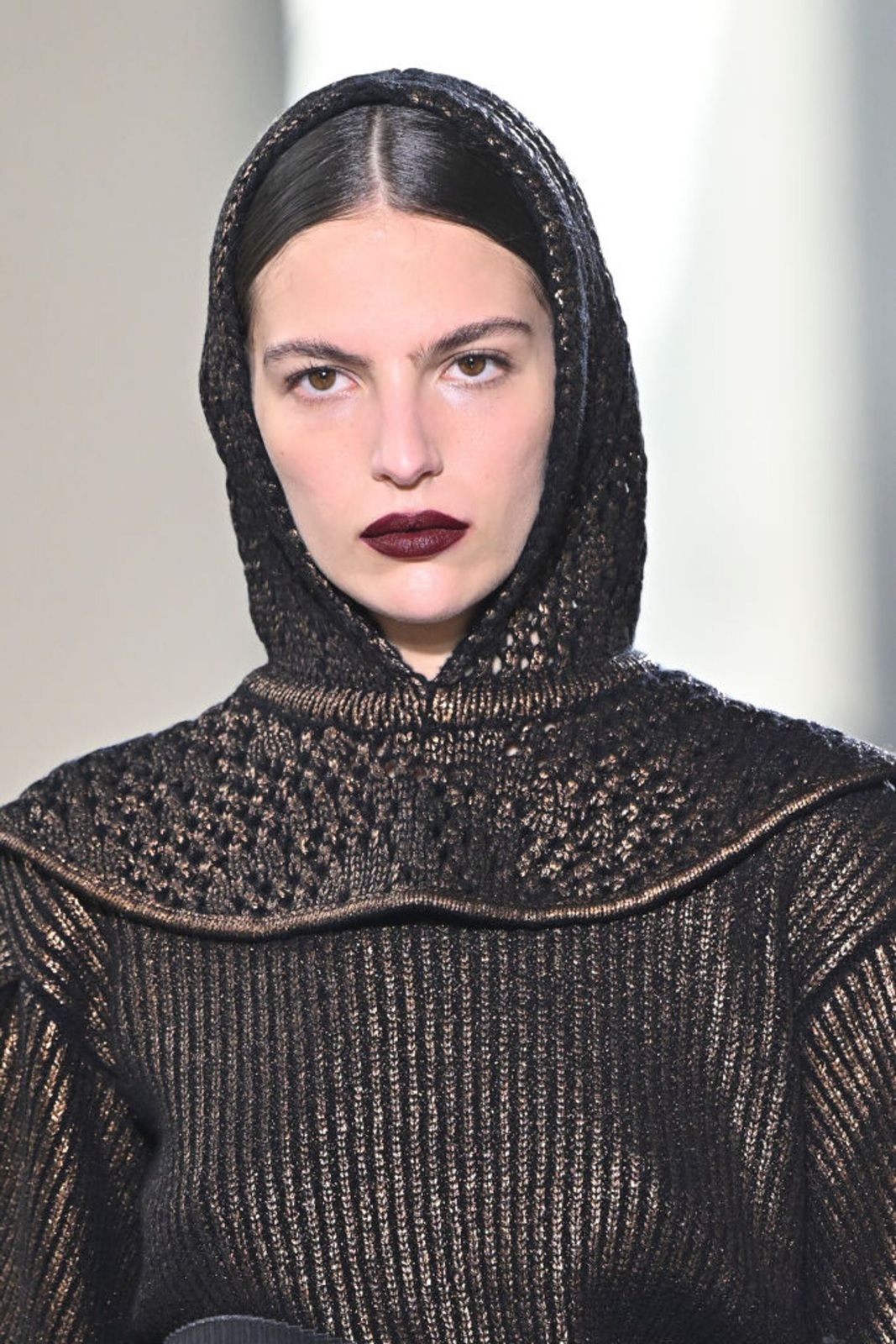 Dark times for Rochas' mediaeval-inspired collection, with padded shoulder dresses, jumpsuits with ruffled turtlenecks and long-sleeved tops that evoke the look of a knight in shining armour. Black dominates, even in beauty. Gothic chic is provided by a pale, dewy complexion, black eye shadow framing the eyes, a wine-red mouth and extra-long, curved nails painted raven black to look like claws.