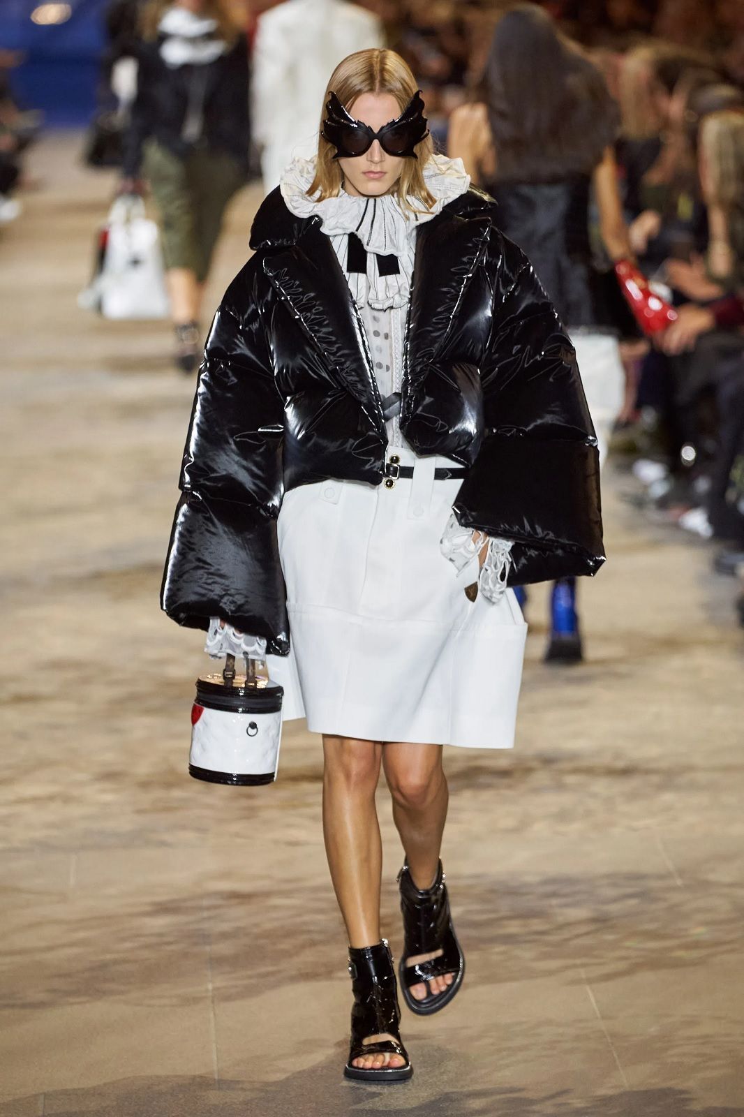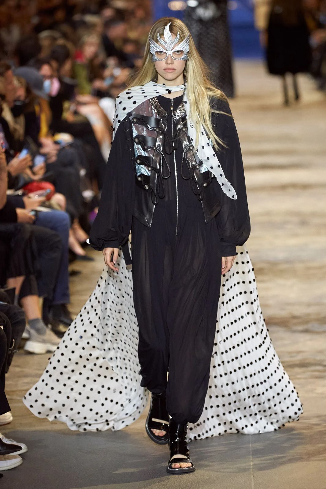 Nicolas Ghesquière brought to the runway a mash-up between Marie Antoinette, cult silent movies and the Ziegfeld Follies. Louvre's Passage Richelieu was turned into a sort of portal for time travel in which crinolines and lingerie, 1920s dresses and tuxedo jackets, leather trench coats and denim coexisted. The inspiration for Louis Vuitton's new collection is the same one that suggested to Guesquière the costumes for the HBO series Max Irma Vep, an adaptation of the 1996 film of the same name starring Maggie Cheung that was itself a remake of Les Vampires, a 1916 silent horror classic. Why not re-watch both movies in an LV SS22 style outfit on Halloween night?