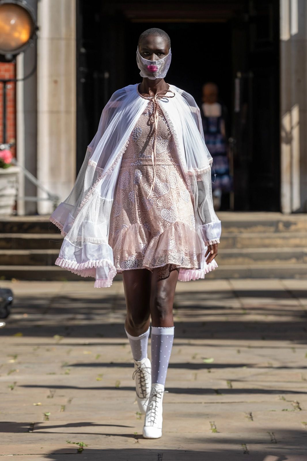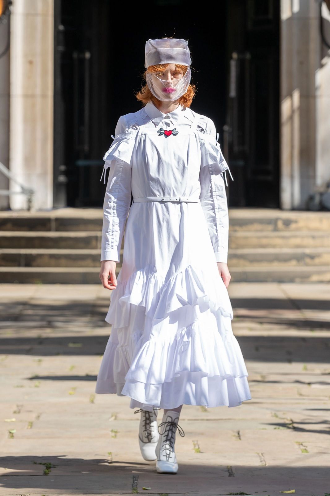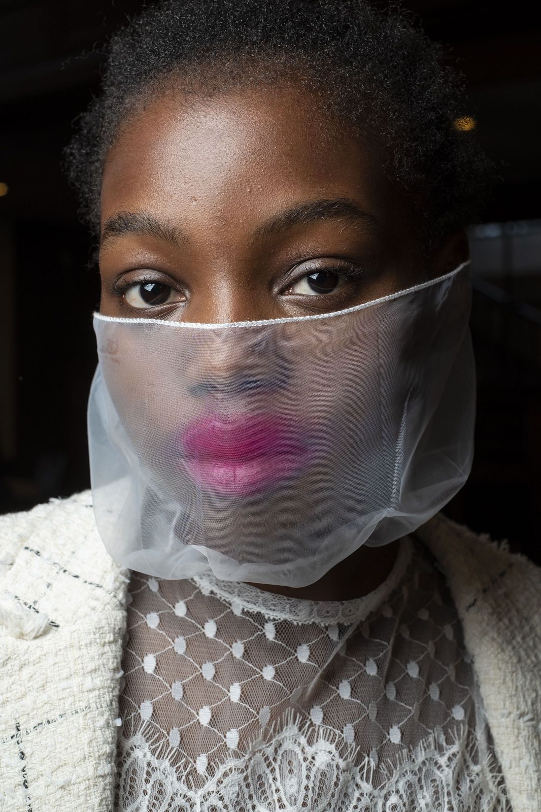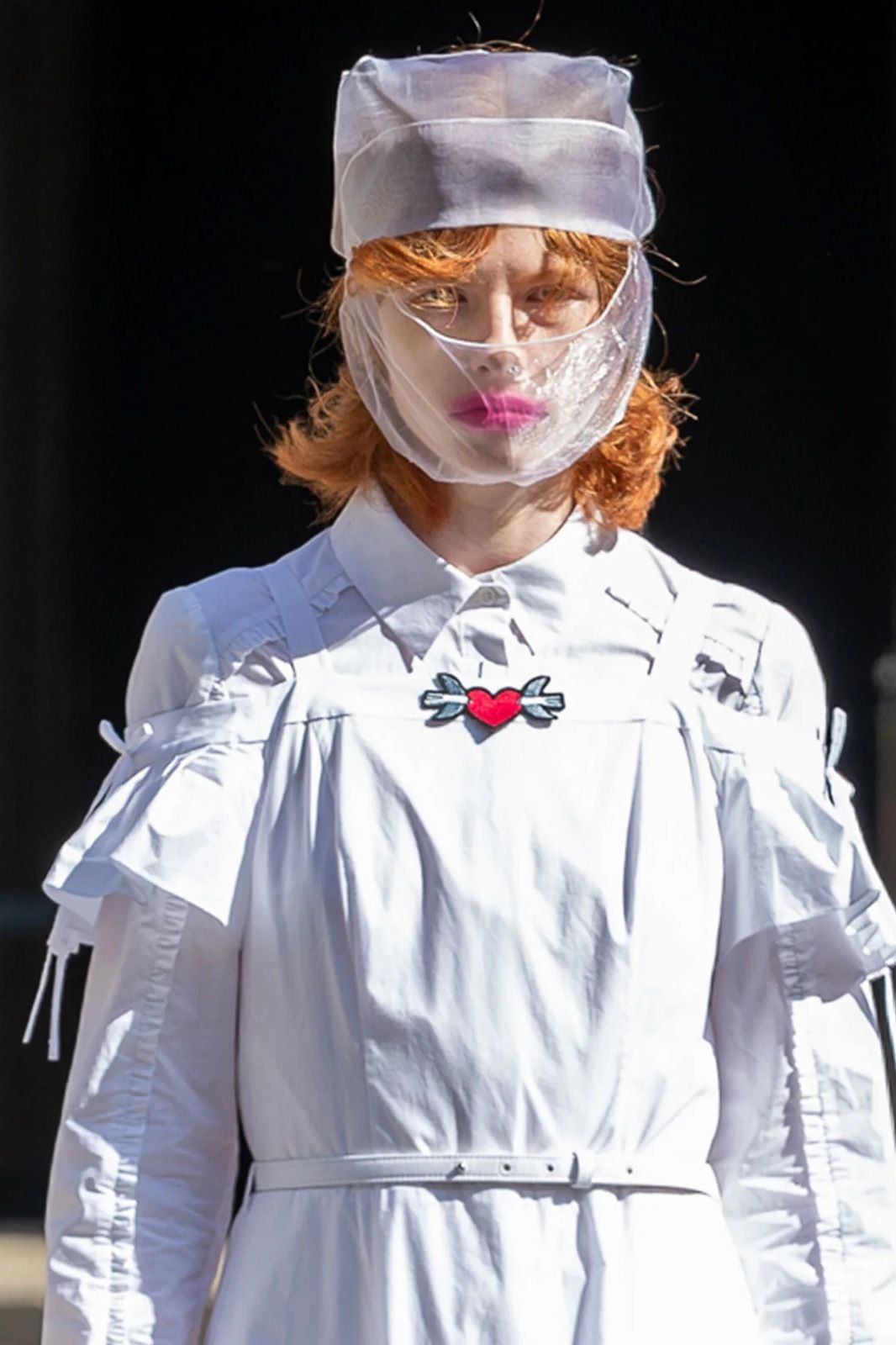 Bora Aksu is inspired by the nurses of the First World War. The result is surprisingly romantic, with transparent dresses, full of ruffles and embroidery. Choosing to replicate one of these SS21 looks for Halloween can be a good idea to exorcise the fears we are experiencing and insert the use of the mask in style. Aksu has proposed it in sheer fabric, to let you see the lips painted in blue and fuchsia, but, if you want, you can choose to wear the surgical mask and print it on a simple lipstick kiss.