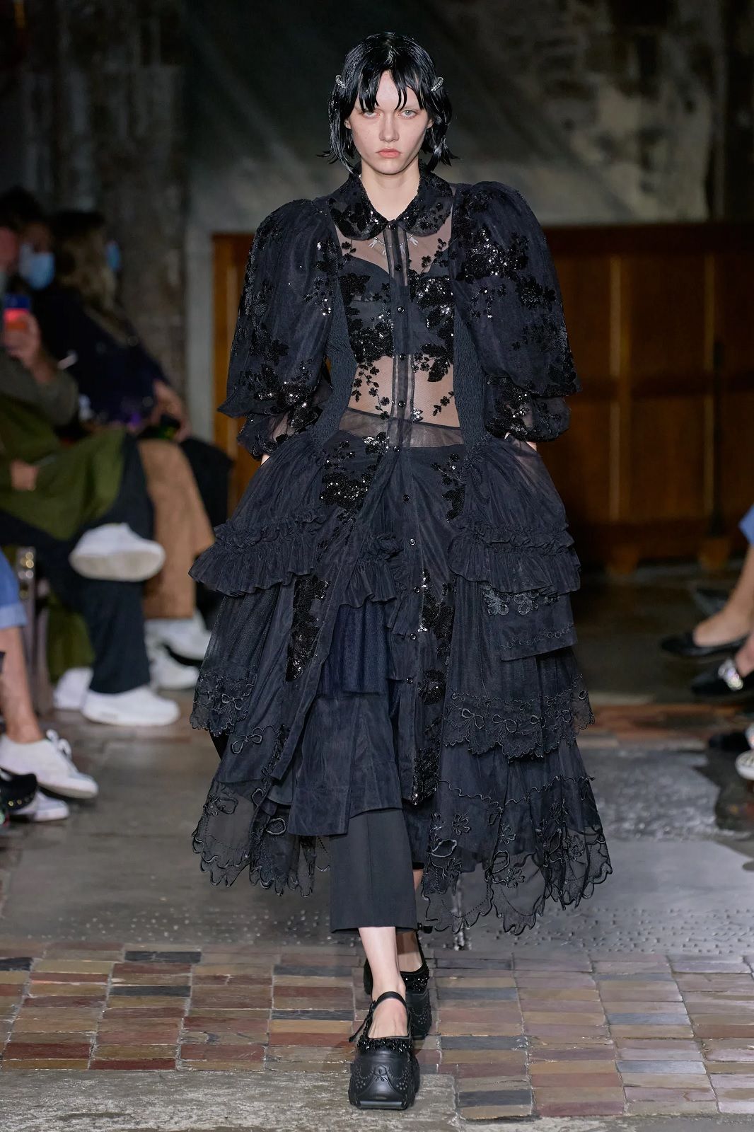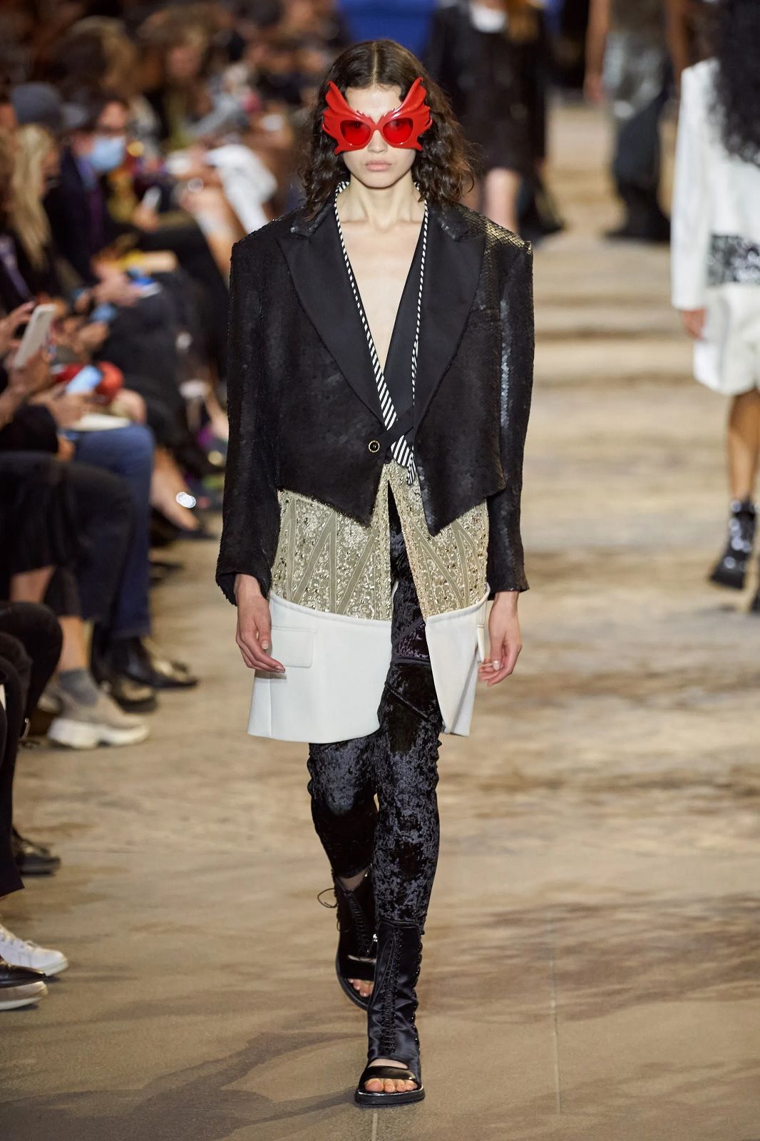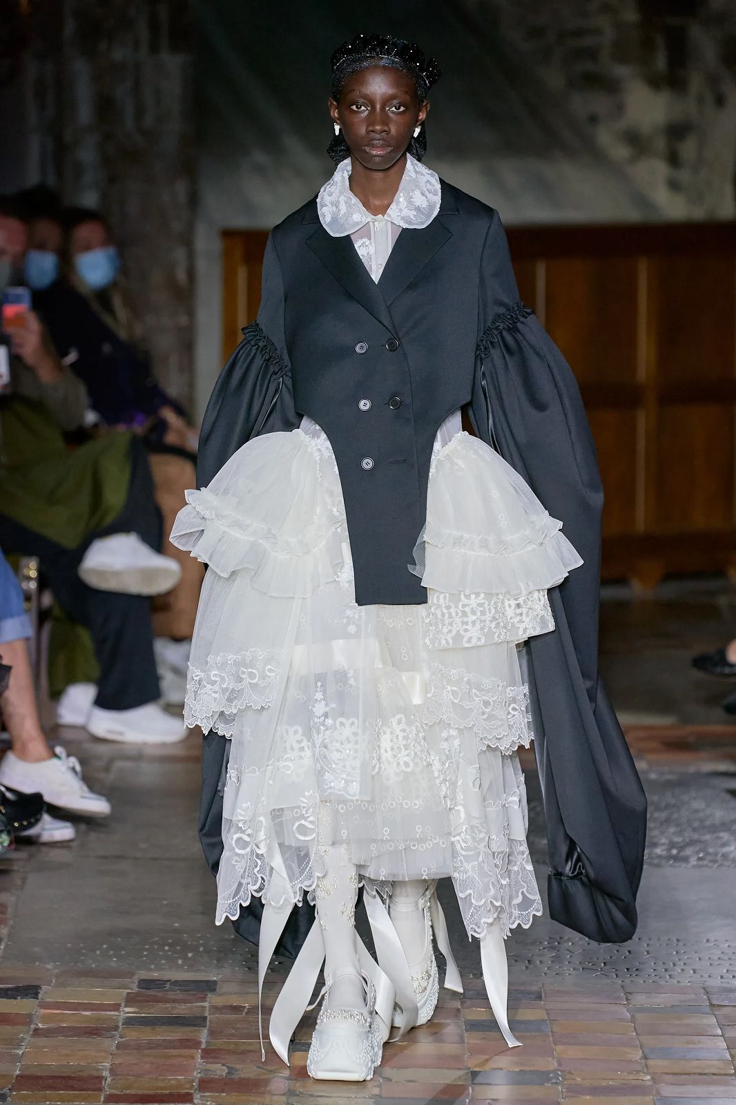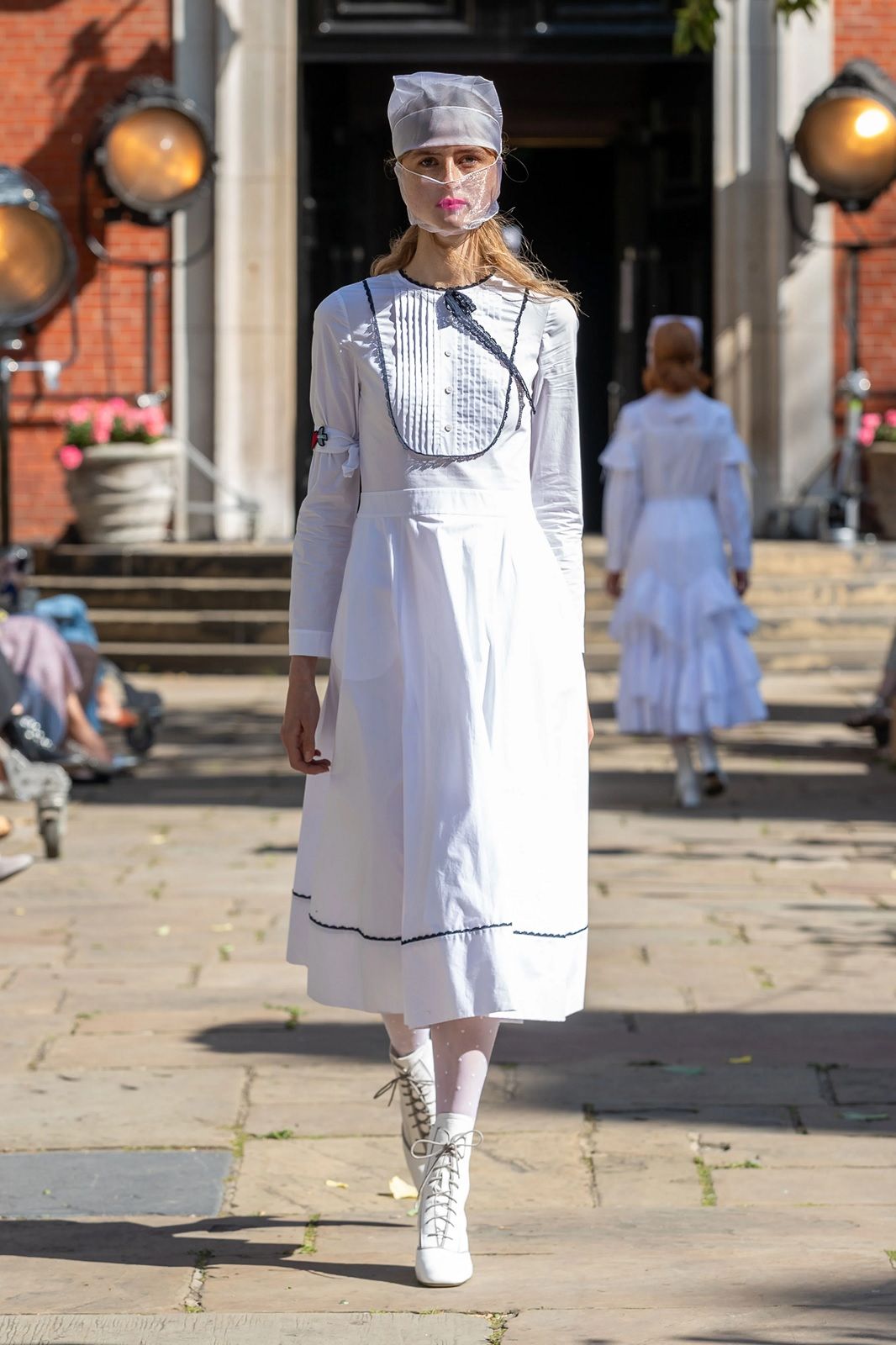 Bora Aksu is inspired by the nurses of the First World War. The result is surprisingly romantic, with transparent dresses, full of ruffles and embroidery. Choosing to replicate one of these SS21 looks for Halloween can be a good idea to exorcise the fears we are experiencing and insert the use of the mask in style. Aksu has proposed it in sheer fabric, to let you see the lips painted in blue and fuchsia, but, if you want, you can choose to wear the surgical mask and print it on a simple lipstick kiss.