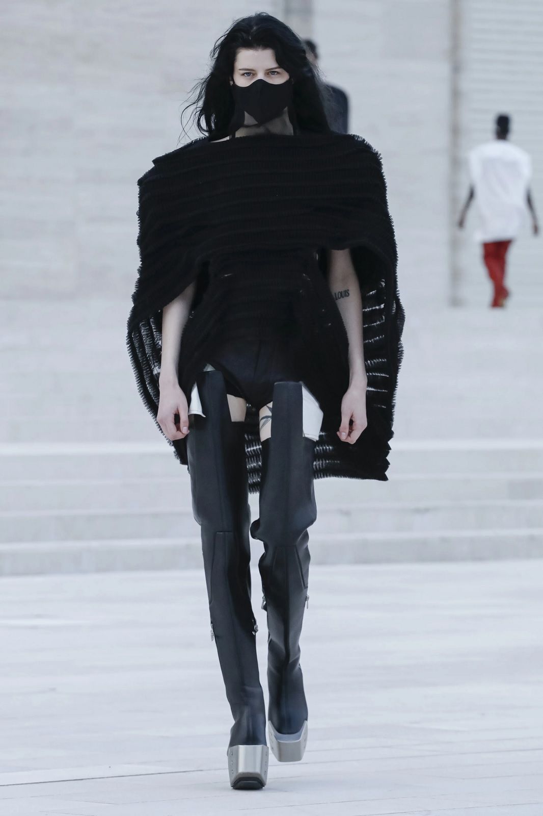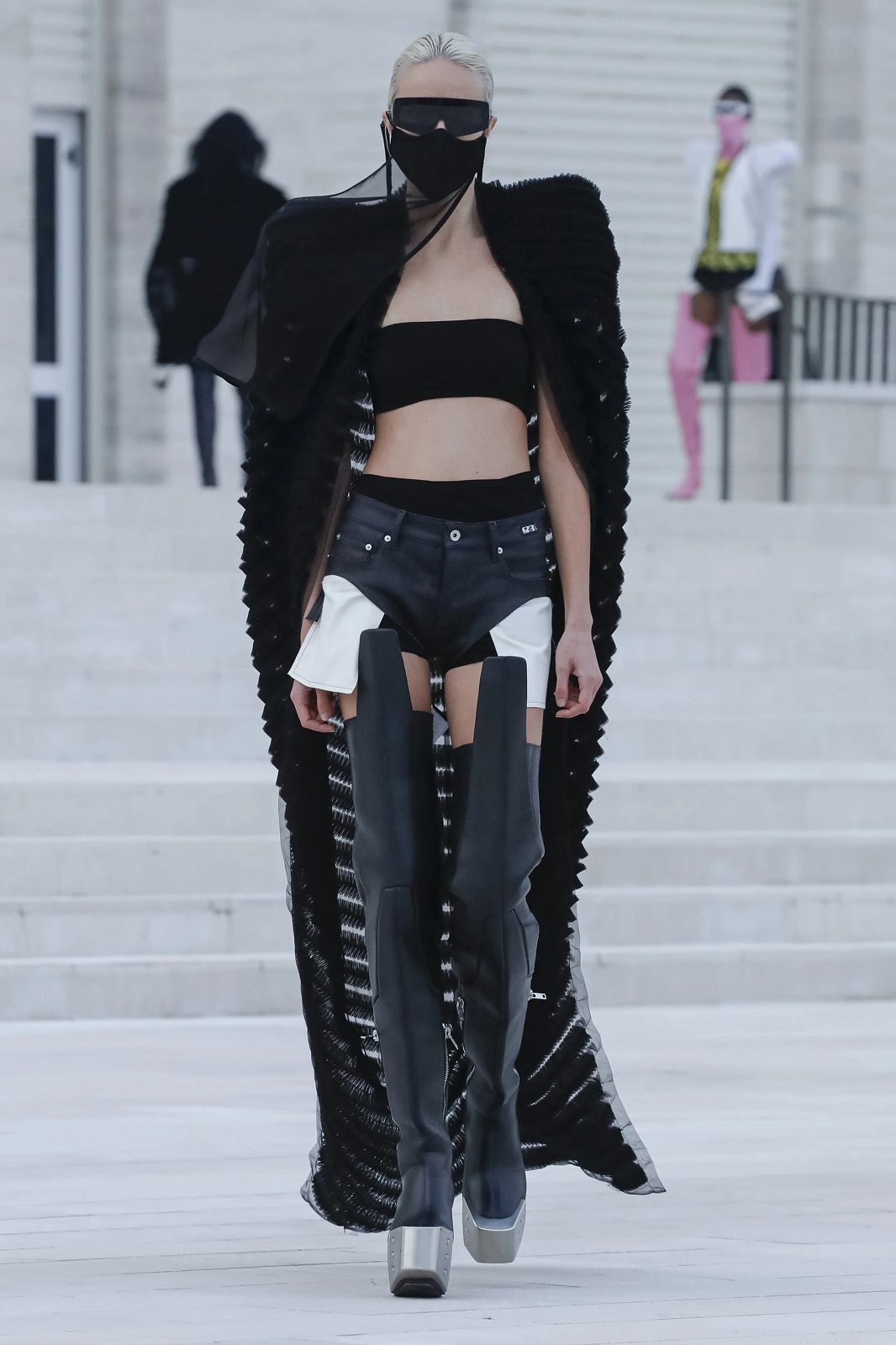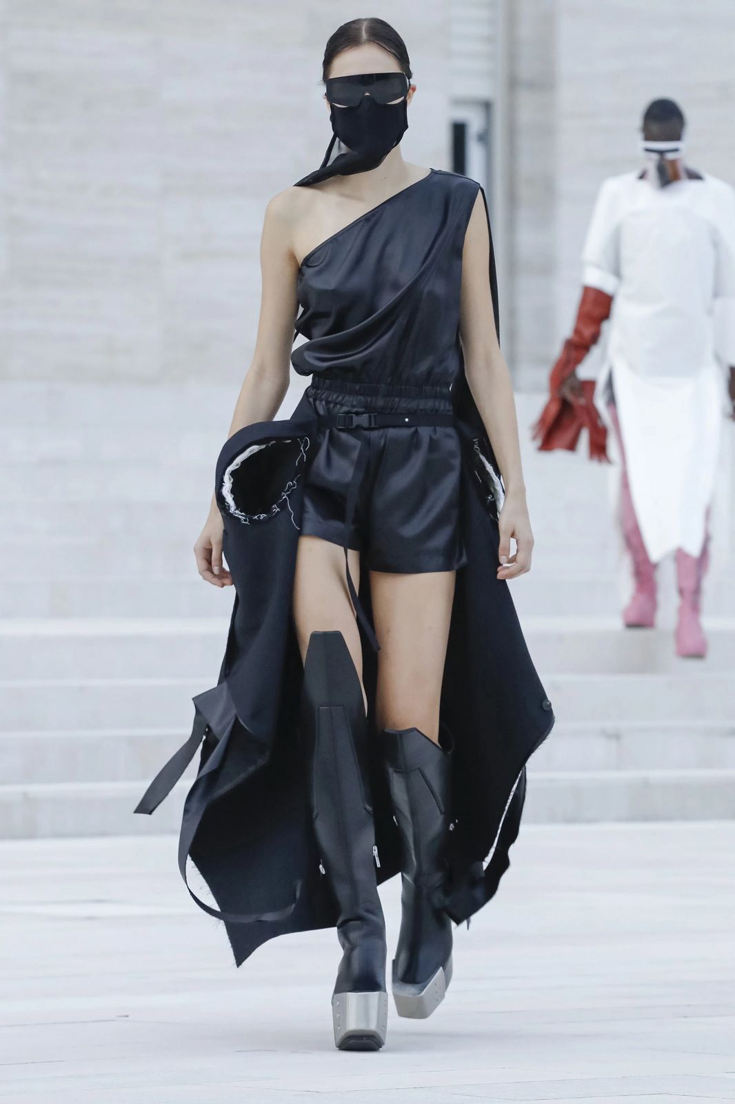 In a live streaming show from Venice, Owens presents his "Cyber warriors" in cotton poplin jackets, capes, leather garments, frayed shorts, veils, boots and masks. An elegantly dark hybrid between Metropolis and Mad Max.
