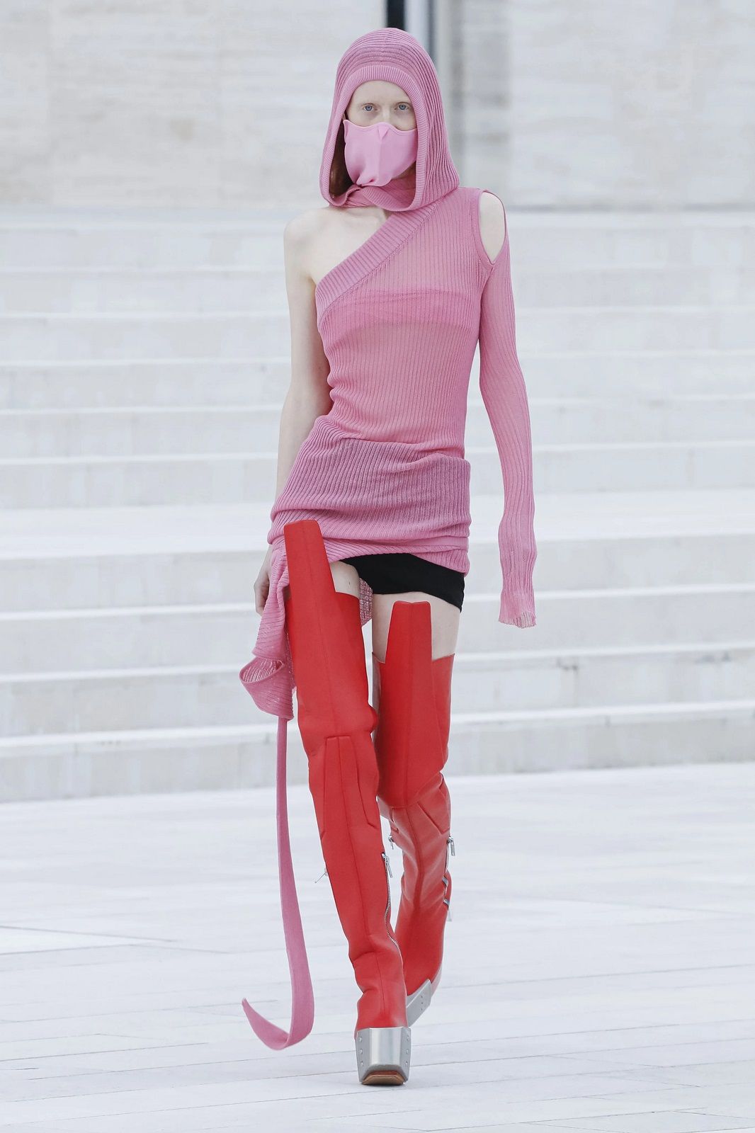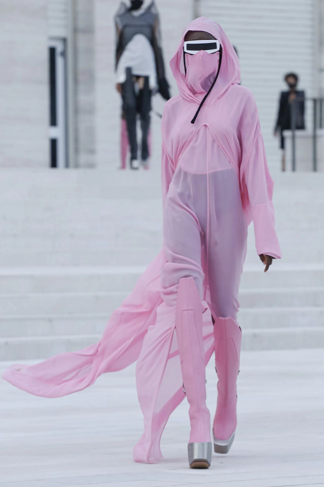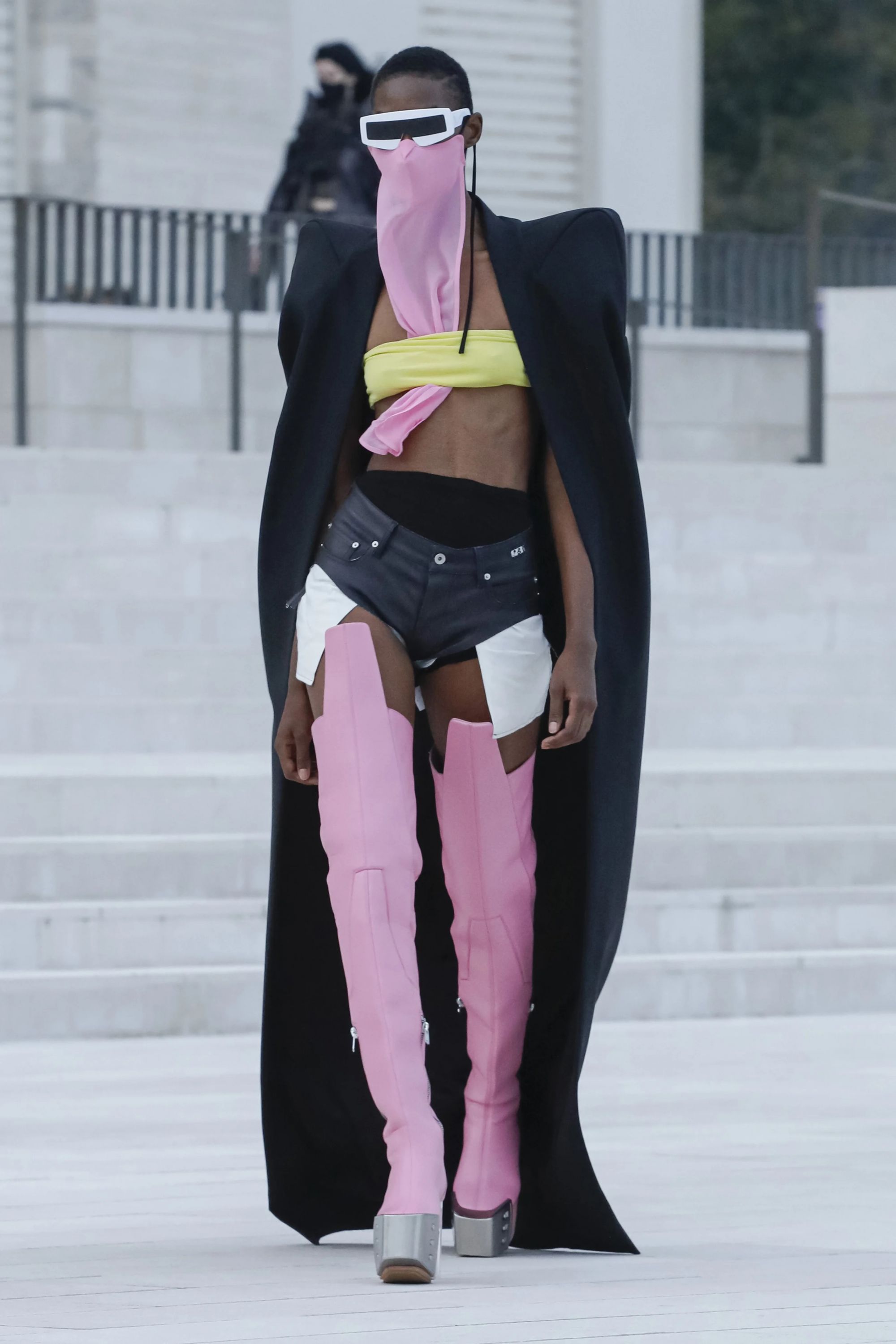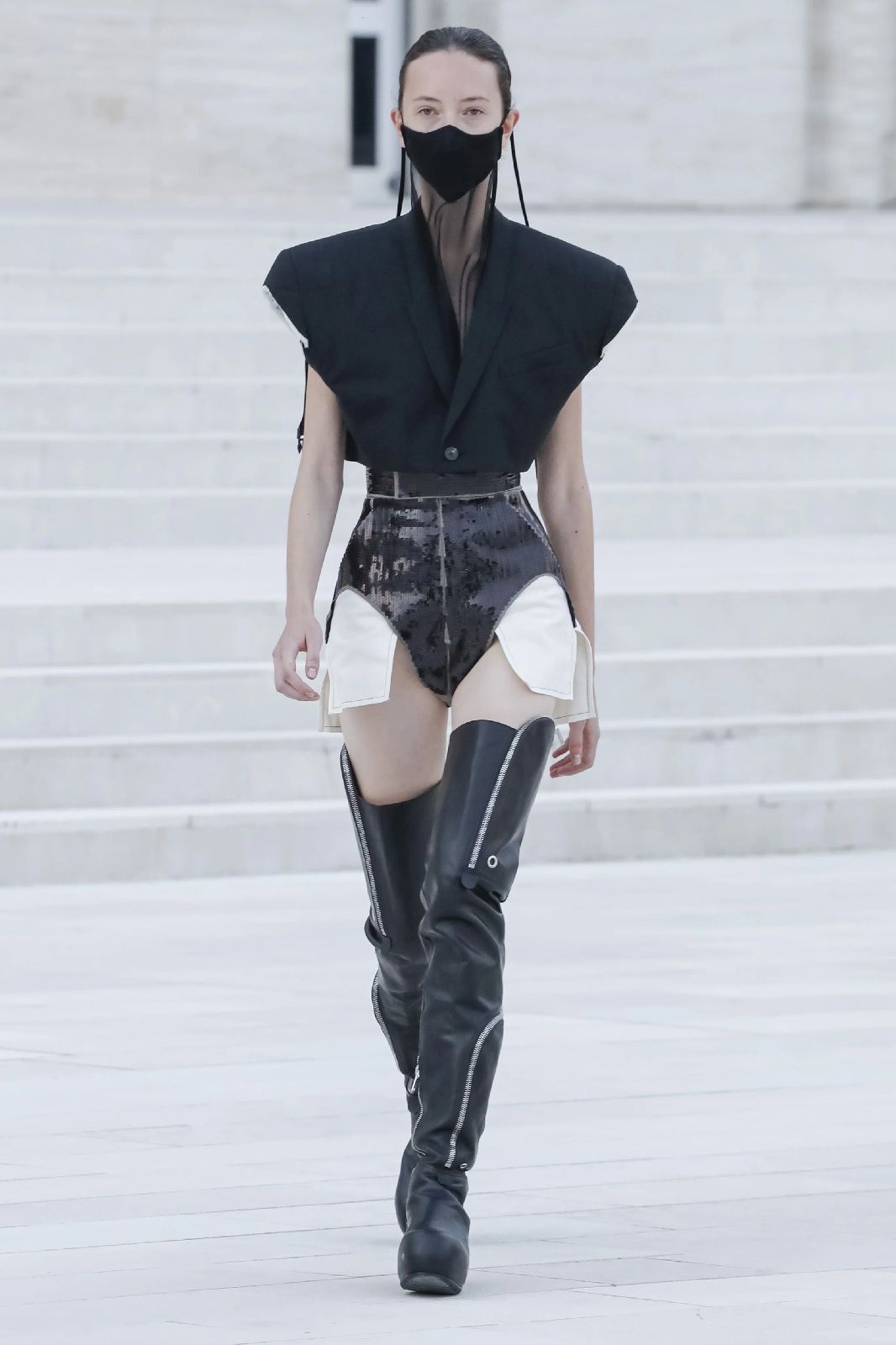In a live streaming show from Venice, Owens presents his "Cyber warriors" in cotton poplin jackets, capes, leather garments, frayed shorts, veils, boots and masks. An elegantly dark hybrid between Metropolis and Mad Max.