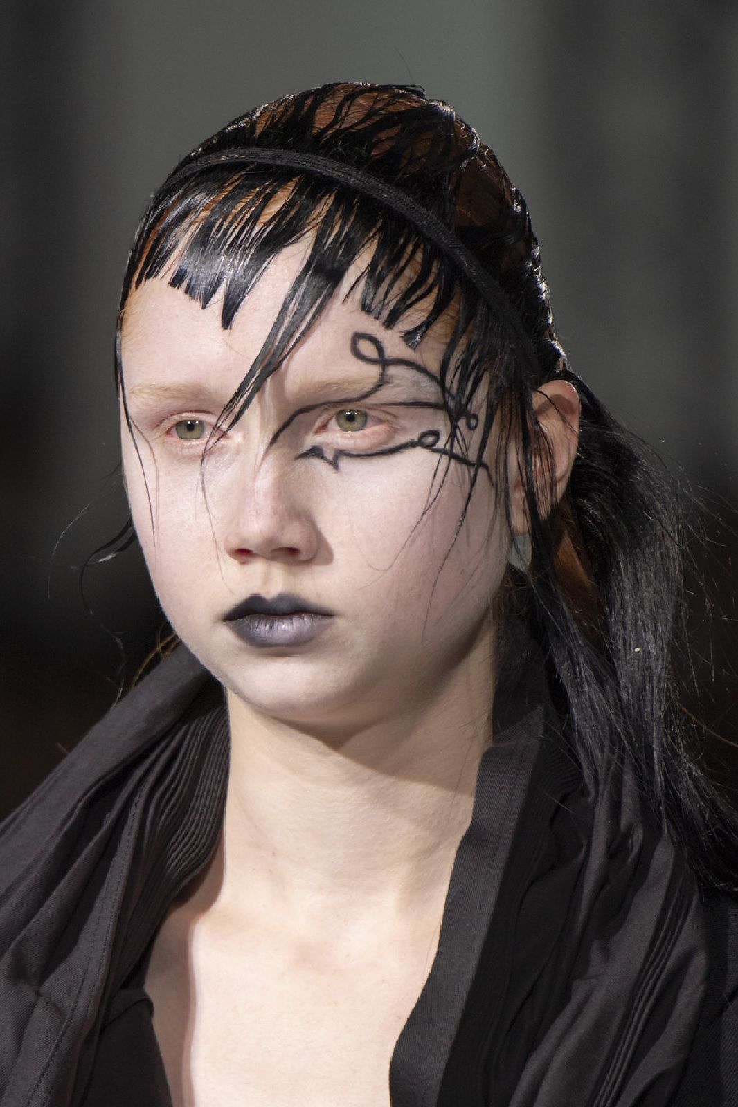 The Mulleavy sisters bring a gothic fairy tale to the catwalk, its sombre atmosphere well reflecting the inspiration for the Rodarte collection: Anjelica Huston's Morticia Addams for the dresses and hairstyle and Siouxsie Sioux for the make-up. The make-up is the most interesting element to copy. James Kaliardos used tape and an eyebrow pencil to create the shapes, then applied NARS Climax liquid eyeliner to fill in the colour. He combined the graphic eyeliner with a matte black or blue lipstick.