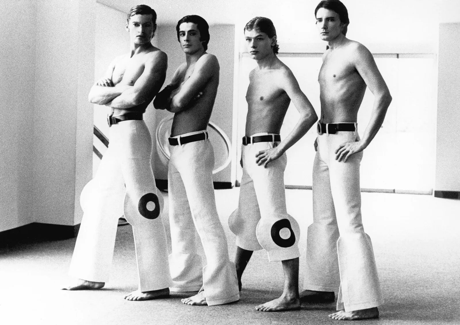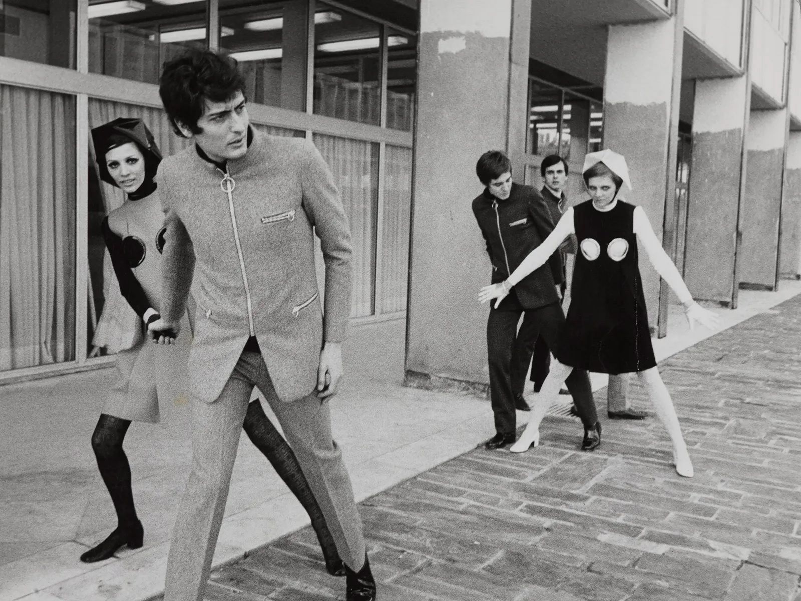 In 1960 Cardin went on to break the industry by bringing 250 students from Parisian universities to the catwalk wearing Cylindre, the first-ever menswear ready-to-wear collection. The designer immediately won over everyone from the Beatles to the Rolling Stones with his innovative menswear consisting of slim-fit suits, mandarin collars, low-waisted pants, fitted jackets with high armholes and geometric shoulders.
