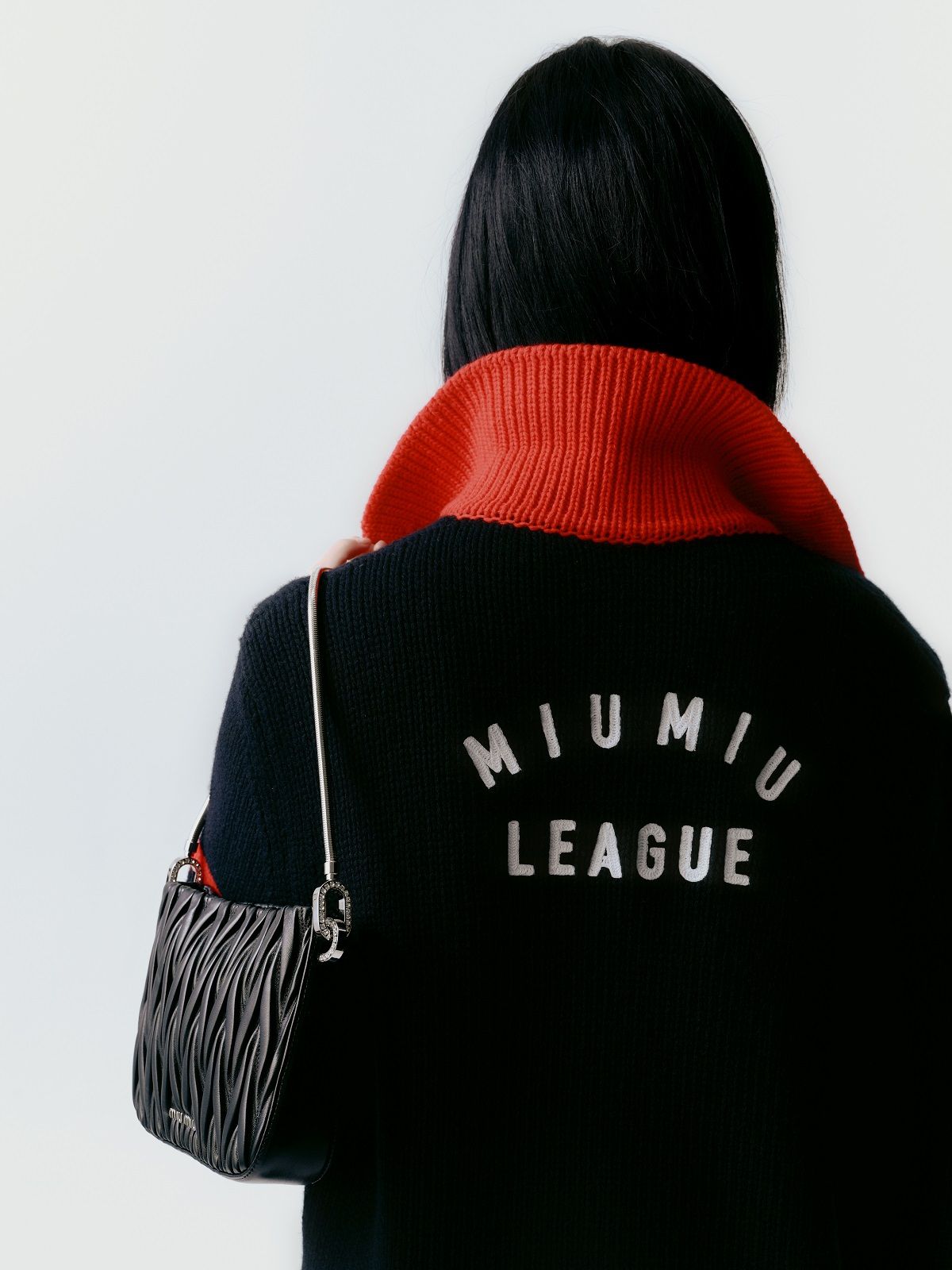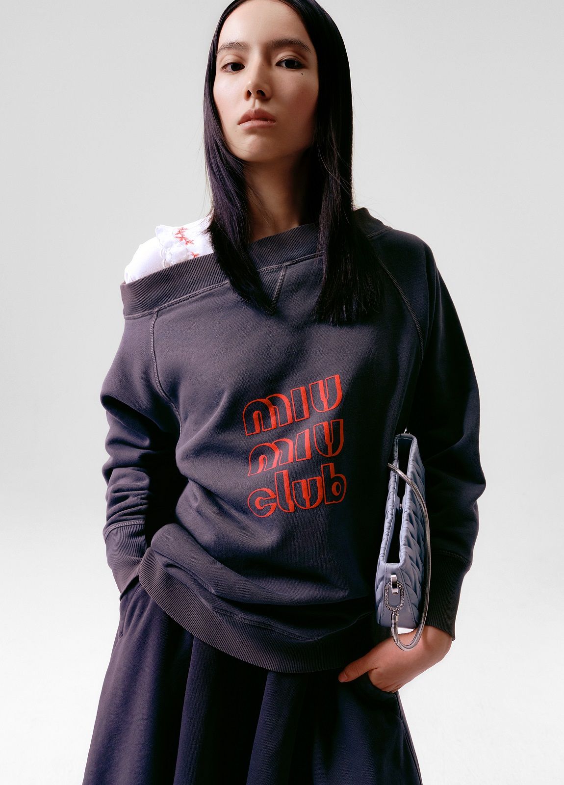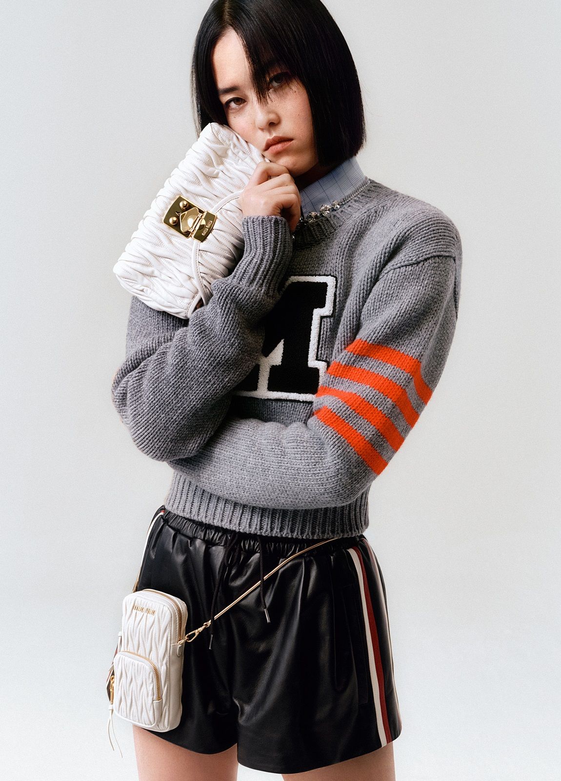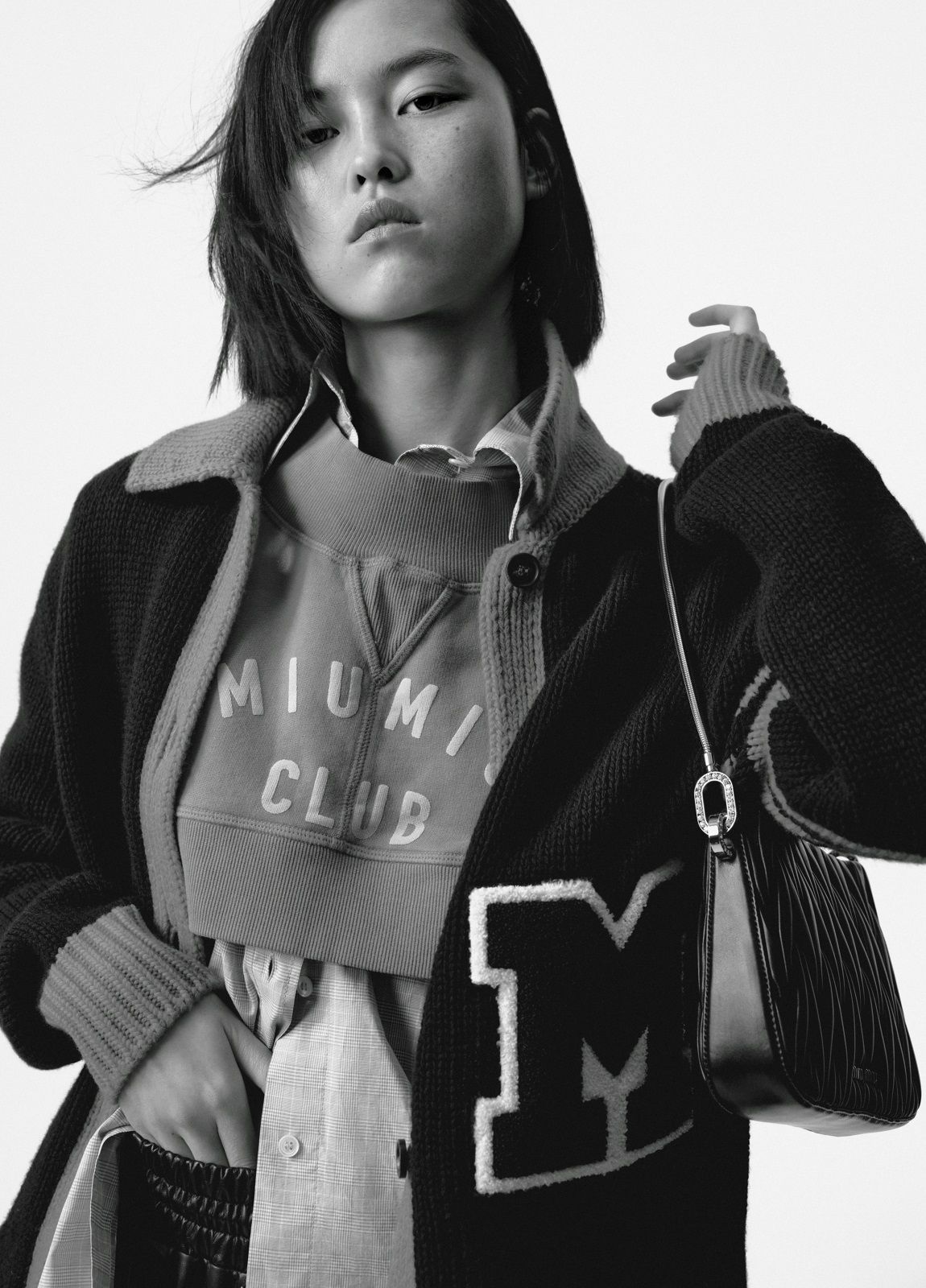 Actress Qiu Tan, teen idol Yifan Zhang, along with models Gu Xue and Yuru Zhang, make their debut as the faces of the brand wearing a mix of tailored pieces, sportswear and college style. Sweatshirts, wool crop sweaters, leather jackets, shorts, miniskirts and tops emblazoned with "Miu Miu Club" are spiced up with accessories. The Miu Belle and the Mini bag with their matelassé texture, the sneakers embellished with jewel details, the glittery slingbacks and the sparkling crystal necklaces give the looks a touch of femininity and irresistible exuberance.