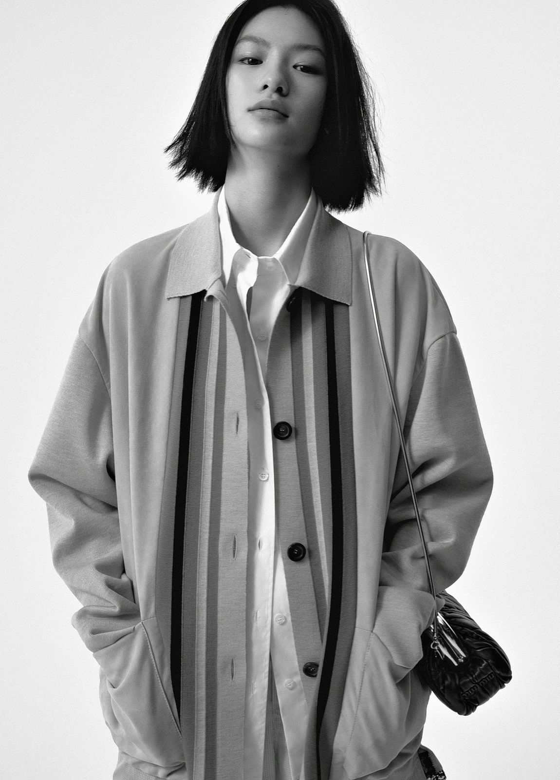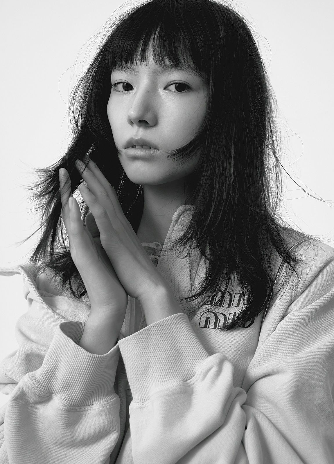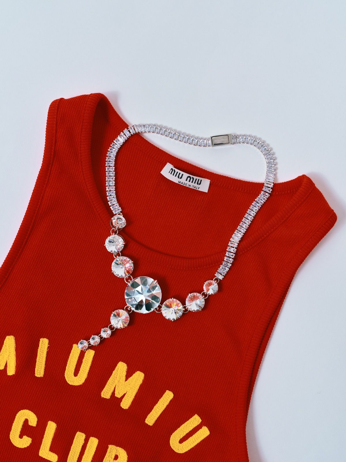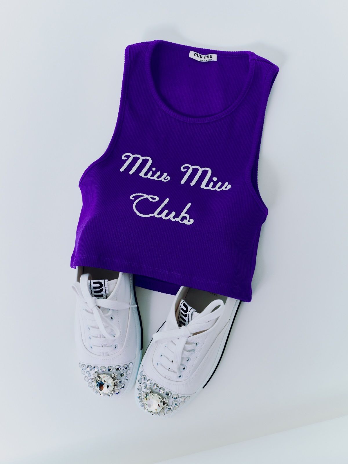 Actress Qiu Tan, teen idol Yifan Zhang, along with models Gu Xue and Yuru Zhang, make their debut as the faces of the brand wearing a mix of tailored pieces, sportswear and college style. Sweatshirts, wool crop sweaters, leather jackets, shorts, miniskirts and tops emblazoned with "Miu Miu Club" are spiced up with accessories. The Miu Belle and the Mini bag with their matelassé texture, the sneakers embellished with jewel details, the glittery slingbacks and the sparkling crystal necklaces give the looks a touch of femininity and irresistible exuberance.