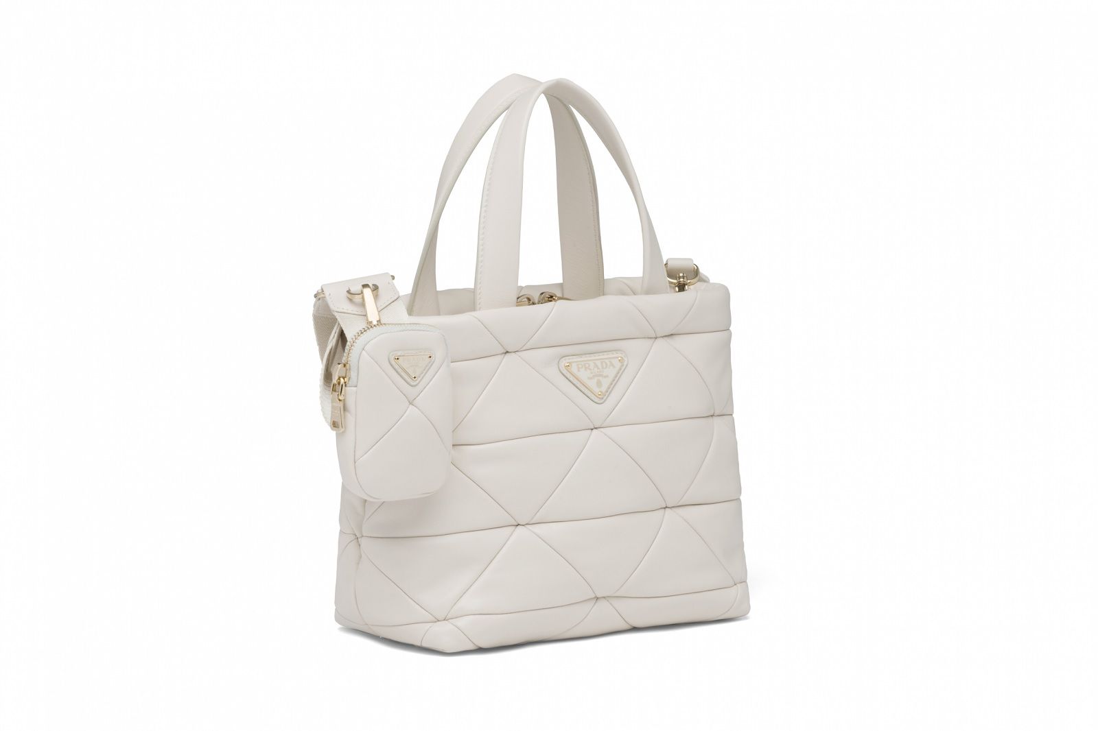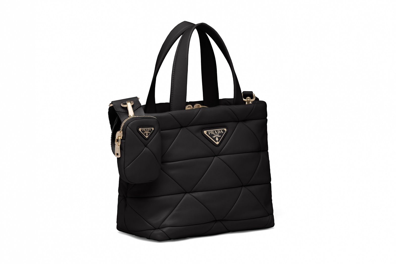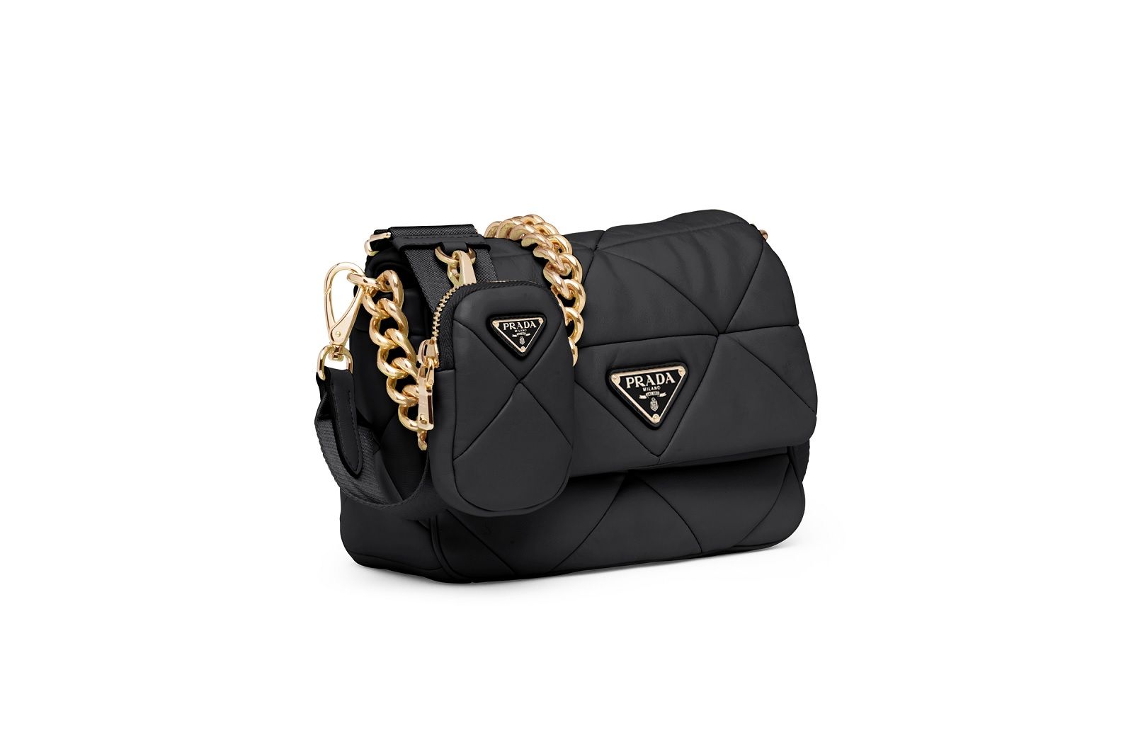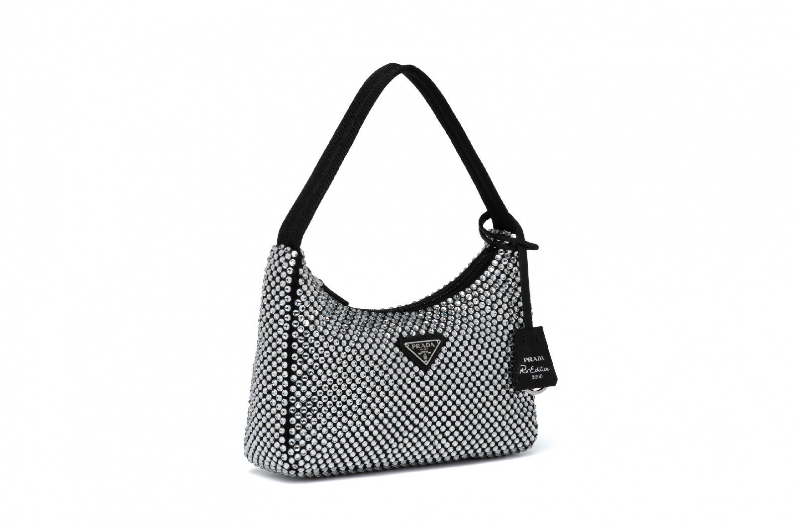 The SS21 offer is completed by the Dynamique bag, in leather with double handles and triangular metal logo, and the Re-Edition 2000 Nylon Mini Bag which features a version made of black nylon and embellished with rhinestones.