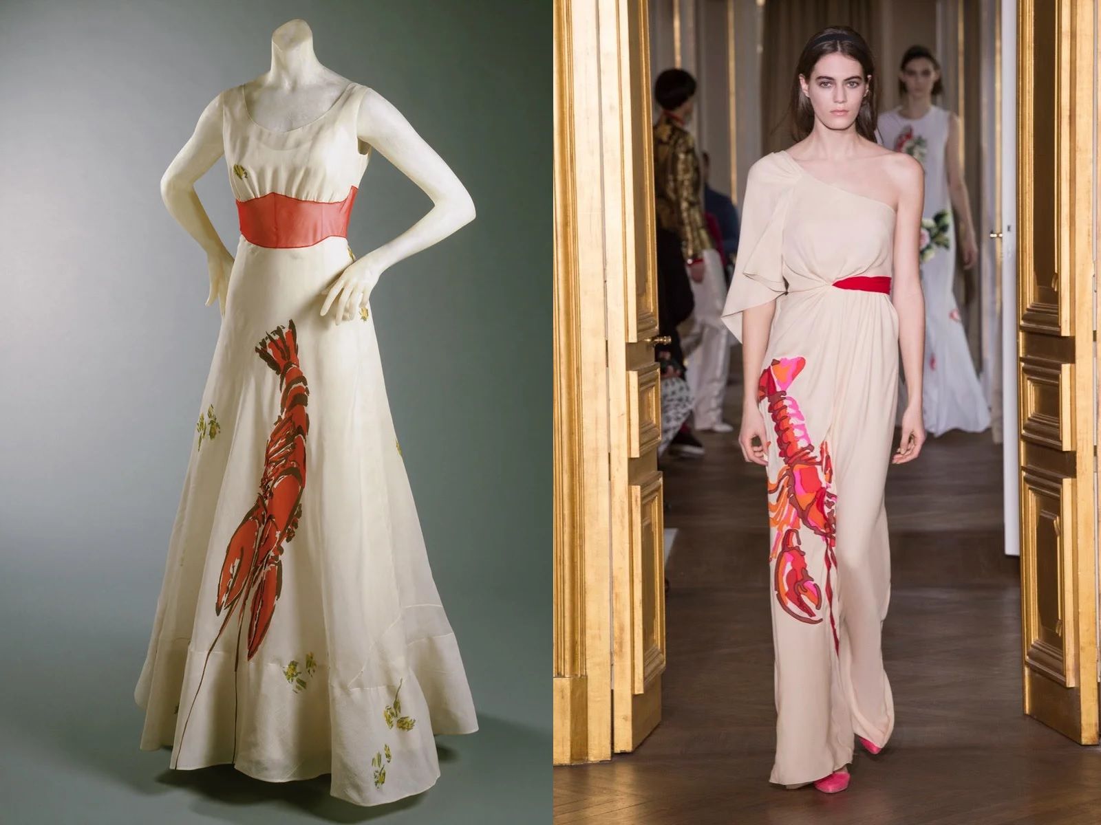 Elsa Schiaparelli and Salvador Dalì were two of the most influential artistic figures of the 20th century, so unique and important that they won not only a place on the cover of Time, but in the art history. They were bold, subversive, against the grain. He always said: "Drawing is the sincerity of art. There is no possibility of cheating. It's either beautiful or it's ugly." She replied with "Drawing clothes, it's not a job. It is an art. One of the most complex, difficult, daunting arts because a dress, when it is born, already belongs to the past." Together, driven by "l'esprit surréaliste", they made legendary outfits: from Shoe bags to the suit with pocket-boxes inspired by the Anthropomorphic Stipo; from phone-bags to the Skeleton Dress (later also revisited by brands such as Alexander McQueen or Christian Lacroix) which, thanks to a special technique, modeled the matelassé fabric by reproducing the ribs and other bones of the ribcage; from garments decorated with Mae West's lips to perfume bottles. Their most iconic creation, however, was the Lobster dress of 1937. It was a long dress in light, flowing silk organza, decorated with an illustration of the crustacean that occupied most of the skirt. At the time of its presentation, it was not so much the animal, which was considered an aphrodisiac and for Dalì was an explicit sexual symbol, that caused a big scandal, but the model wearing it in a series of photographs taken by Cecil Beaton, Wallis Simpson. The woman, divorced and American at the time, was at the center of one of the biggest scandals in history because Edward VIII had decided to abdicate the English throne in order to marry her. To celebrate the 80th anniversary of the dress, Bertrand Guyon presented a new version of the famous model in Schiaparelli's SS17 Haute Couture collection.