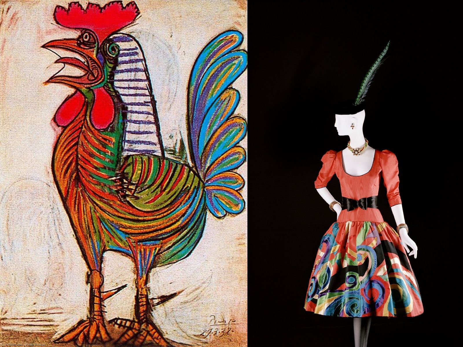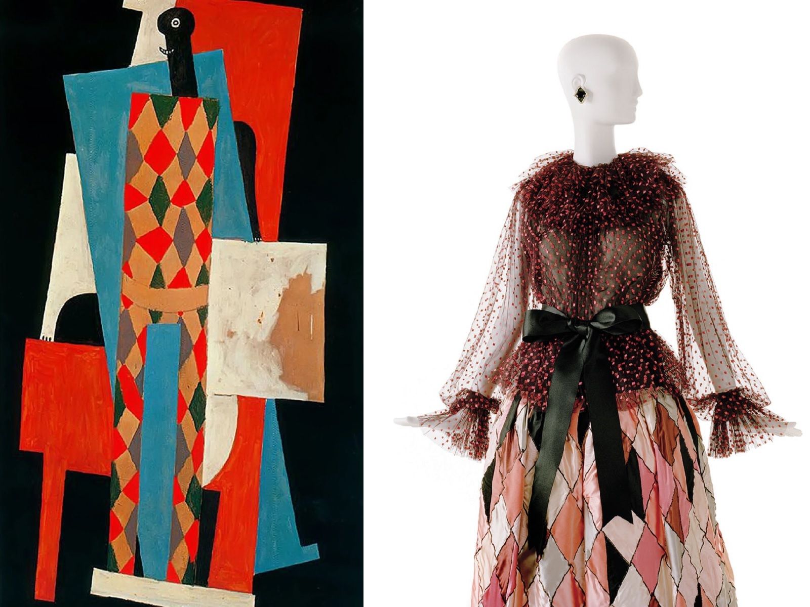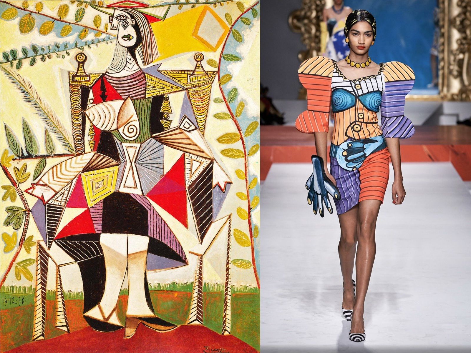 For Moschino's SS20, Jeremy Scott paid homage to the art of Pablo Picasso, creating a series of garments inspired by his most famous works, transforming Bella Hadid (in harlequin version) and the tall models into real living canvases: from Les Demoiselles d'Avignon of 1907 to Le Marin of 1943, from Guitar of 1914 to Femme au beret et a la robe quadrillee of 1937. This is only the most recent example of how fashion has been influenced over the years by one of the fathers of Cubism. The first designer to bring the Spanish genius' work to the runway was Yves Saint Laurent. Yves showed his great passion for art in the Haute Couture SS88 collection, during which he presented clothes influenced by Picasso, but also by Braque, Matisse and Van Gogh. Reworked by YSL's flair, guitars, violins, roosters, doves, vibrant colors and geometric graphics are transformed into wearable sculptures made of fabric and glamour. The love for Picasso didn't stop in the eighties, but marked many fashion weeks: from SS12 by Jil Sander to FW16 Haute Couture by Schiaparelli, from FW15 by Jacquemus to SS16 Haute Couture by Viktor & Rolf.