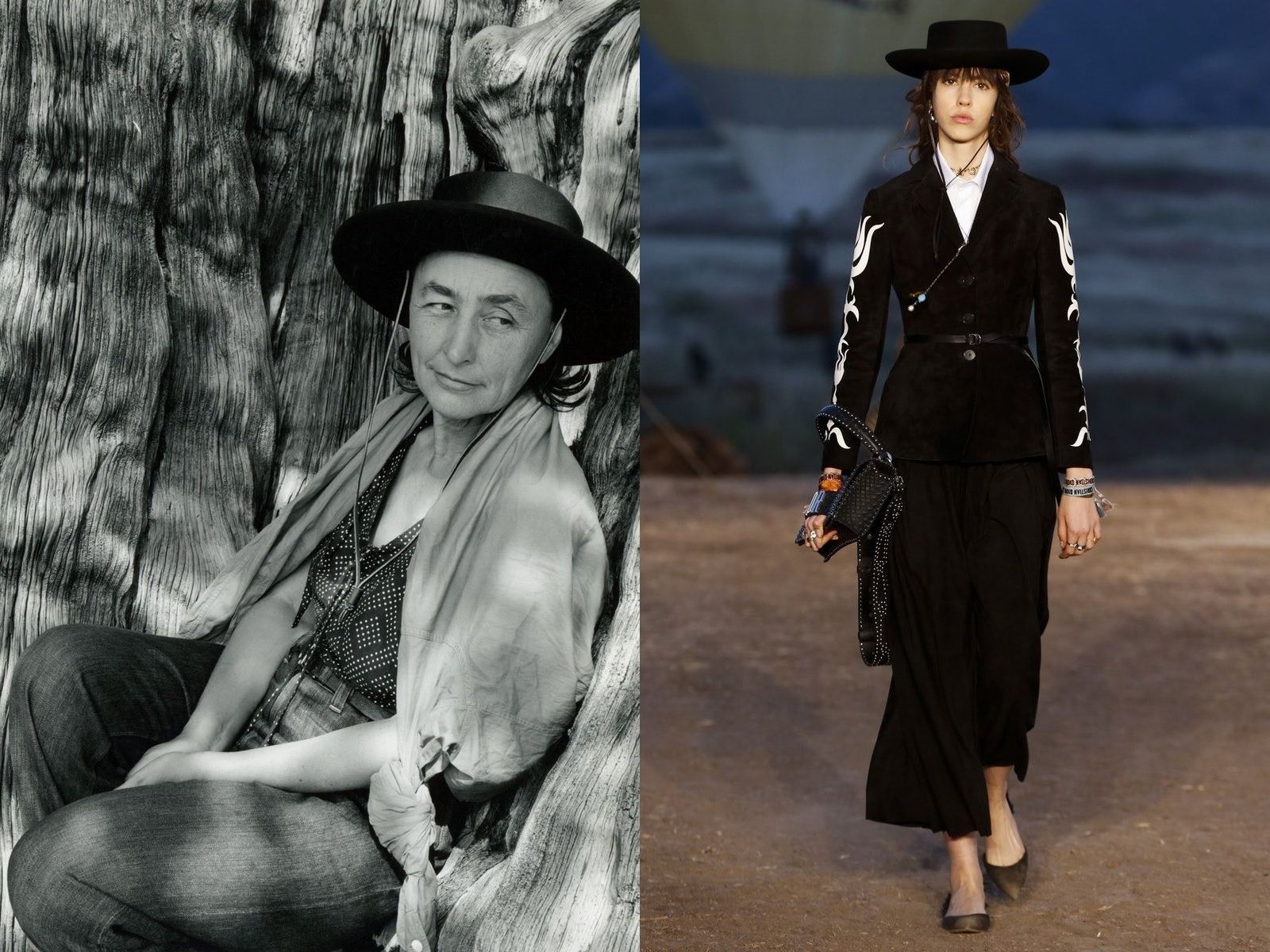 The Mother of American Modernism is a fashion icon. Her almost monastic style, which mixes black and white with the Southwestern aesthetic of the States, is still highly copied today. Just take a look at the collections brought to the runway in recent years: from Tome FW13 to Maria Grazia Chiuri's creations for the 2018 Christian Dior cruise. Not only the bolo ties, gaucho hats, white shirts and long skirts have turned into fashion, but also Georgia O'Keeffe's beautiful flowers, which bloom in an almost erotic way on the canvas, have become prints for the floating dresses of Michael Kors, Elie Saab and Gareth Pugh.