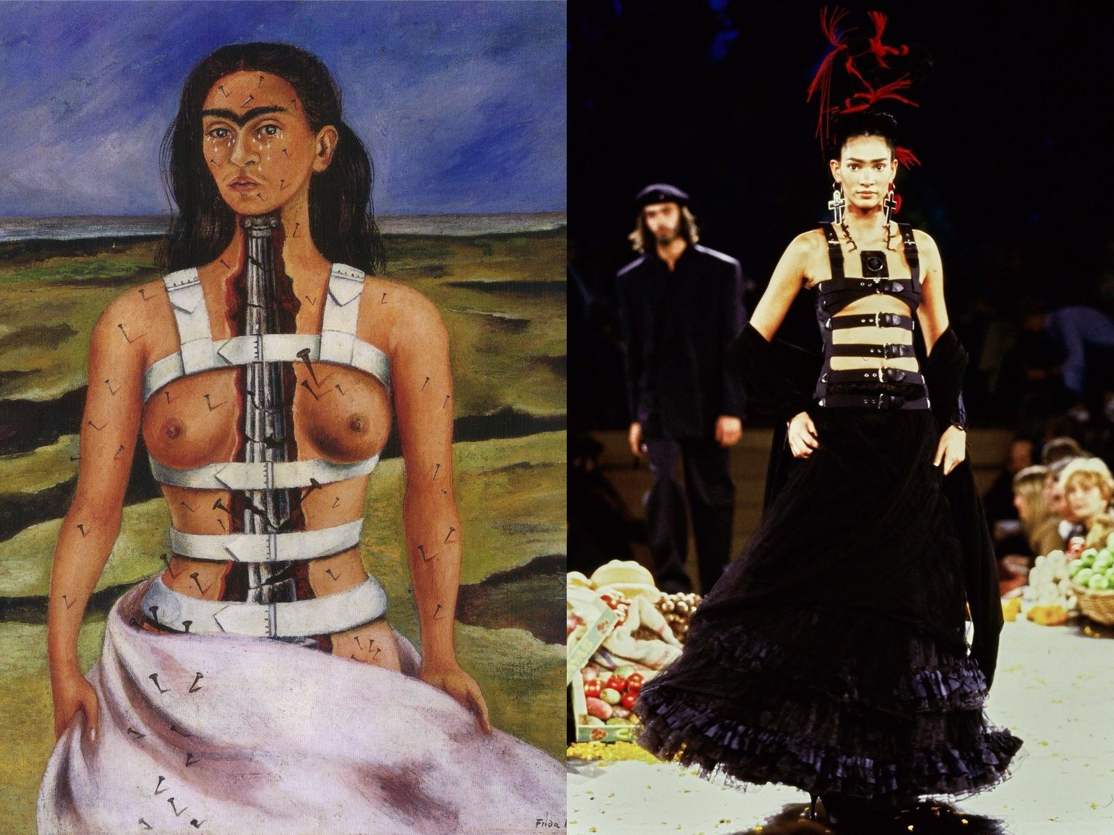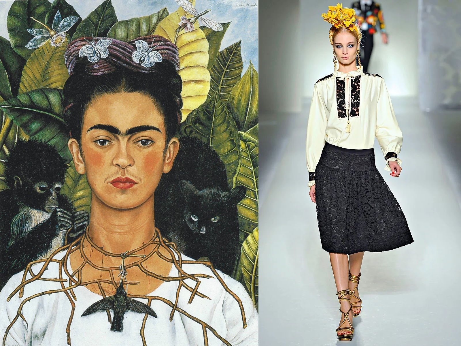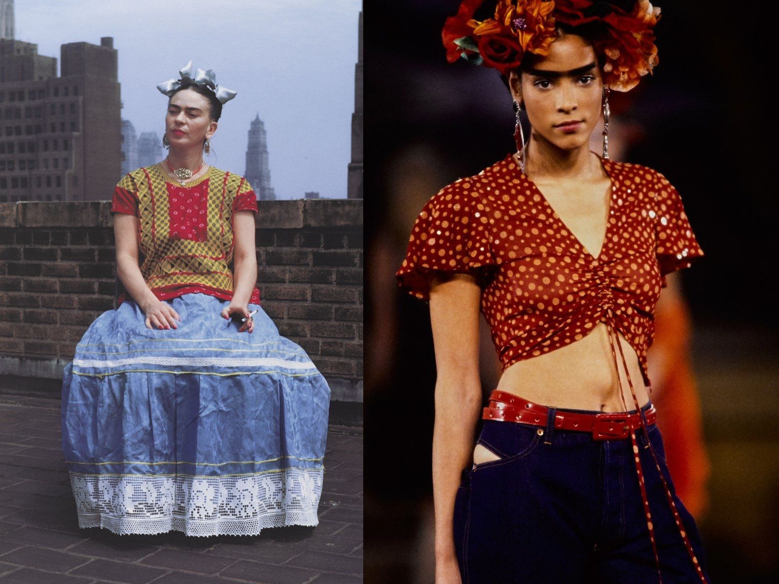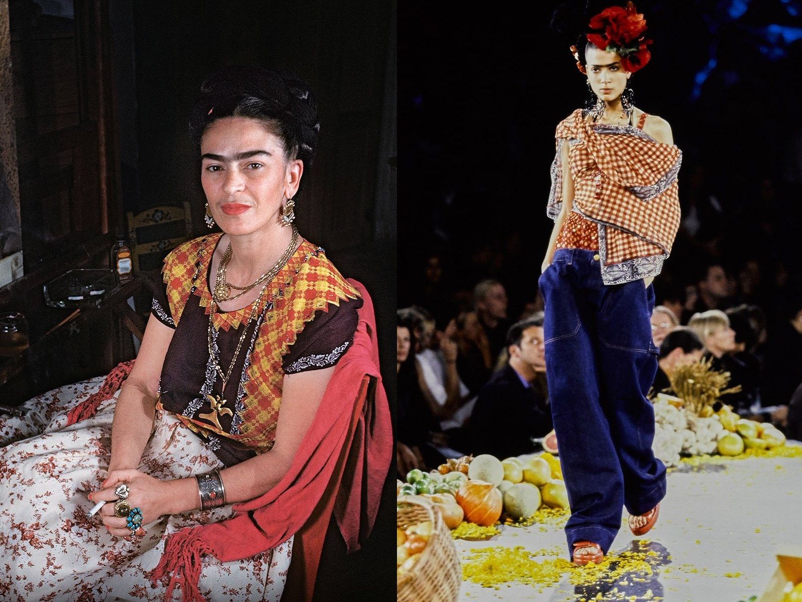 These words give just a small idea of how important the Mexican painter's impact on fashion was, not only through her artwork, but through her personal style. The unibrow, the braided chignon, the wreath of flowers in her hair, the colorful maxi skirts, the corset, the embroidered blouses, the traditional clothes of Mexico are all elements that, put together, have made her similar to a religious icon, very recognizable and influential, to which many designers have paid homage over the years. Jean Paul Gaultier has dedicated his entire SS98 collection to her, while among those who have referred to her are Comme Des Garçons, Valentino, Dolce & Gabbana, Alberta Ferretti and Moschino.