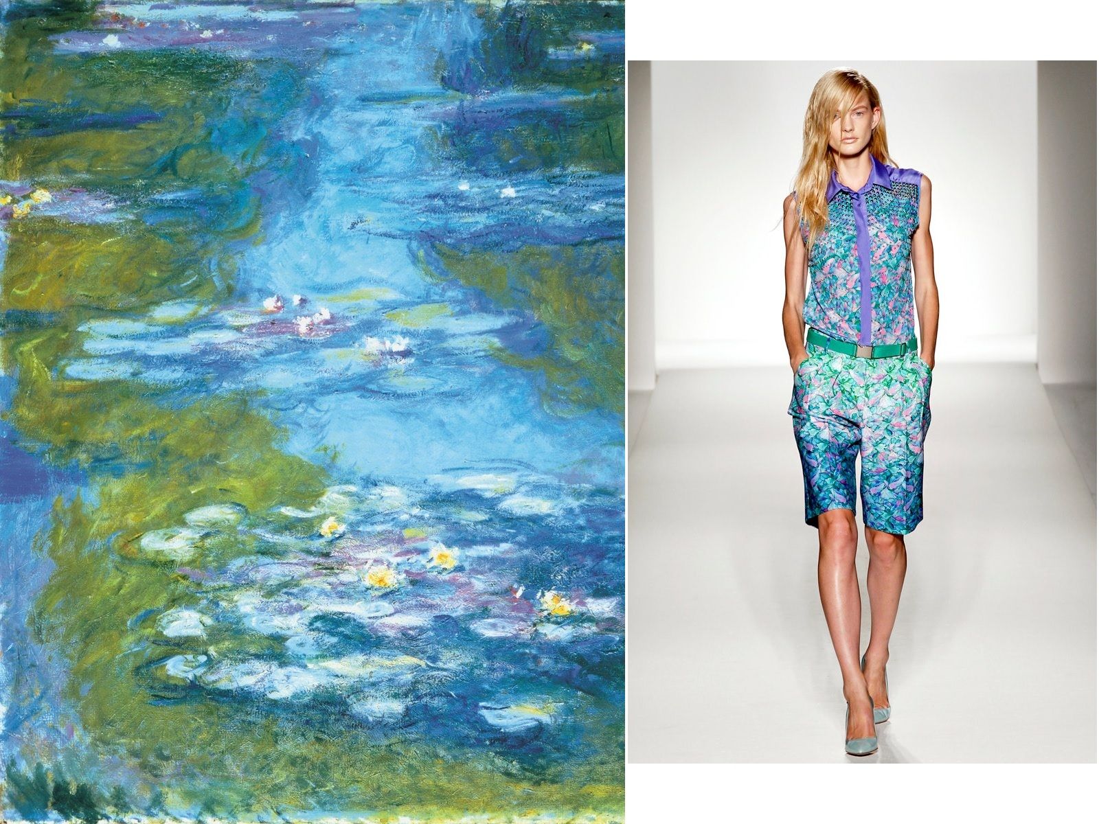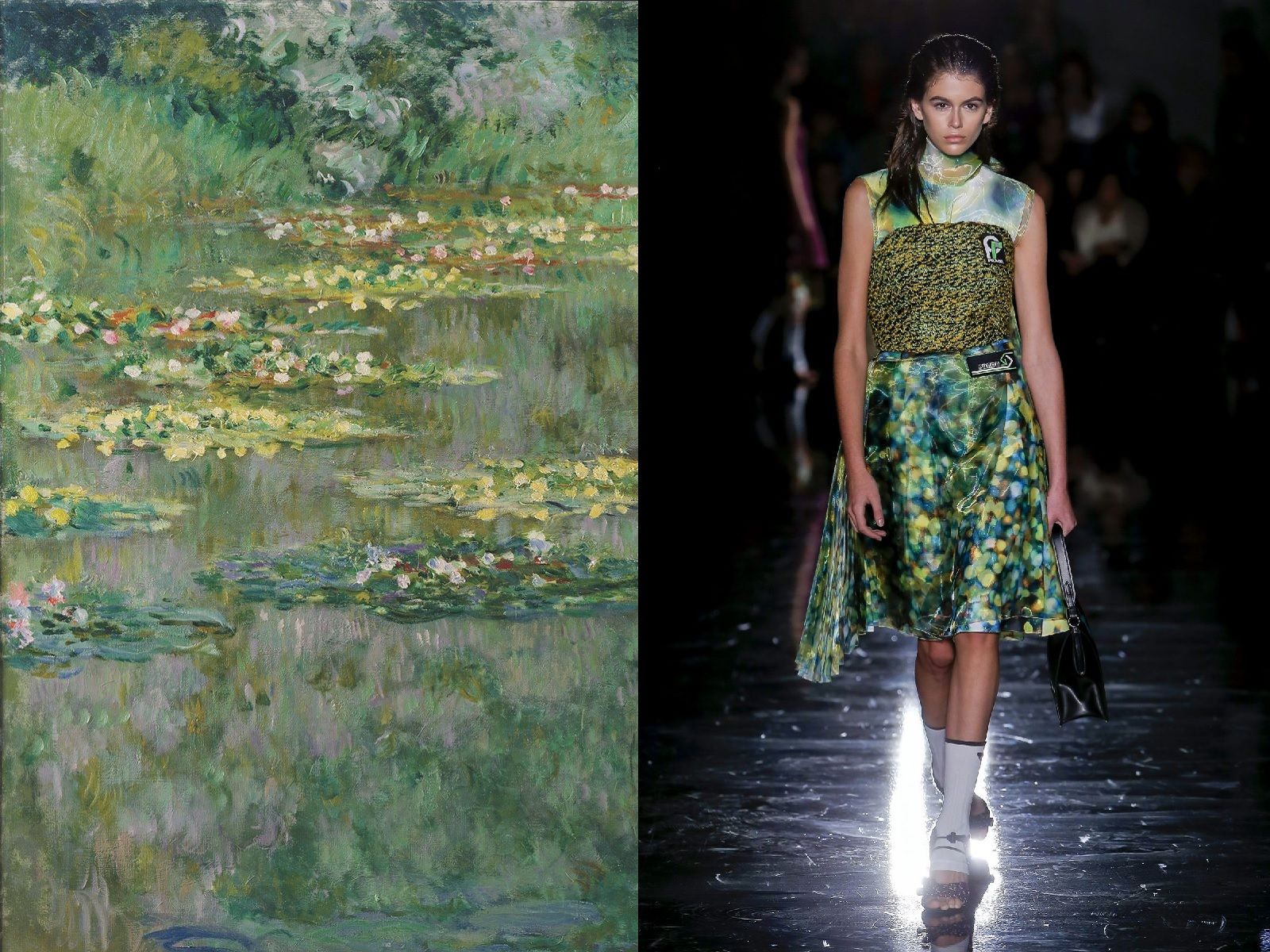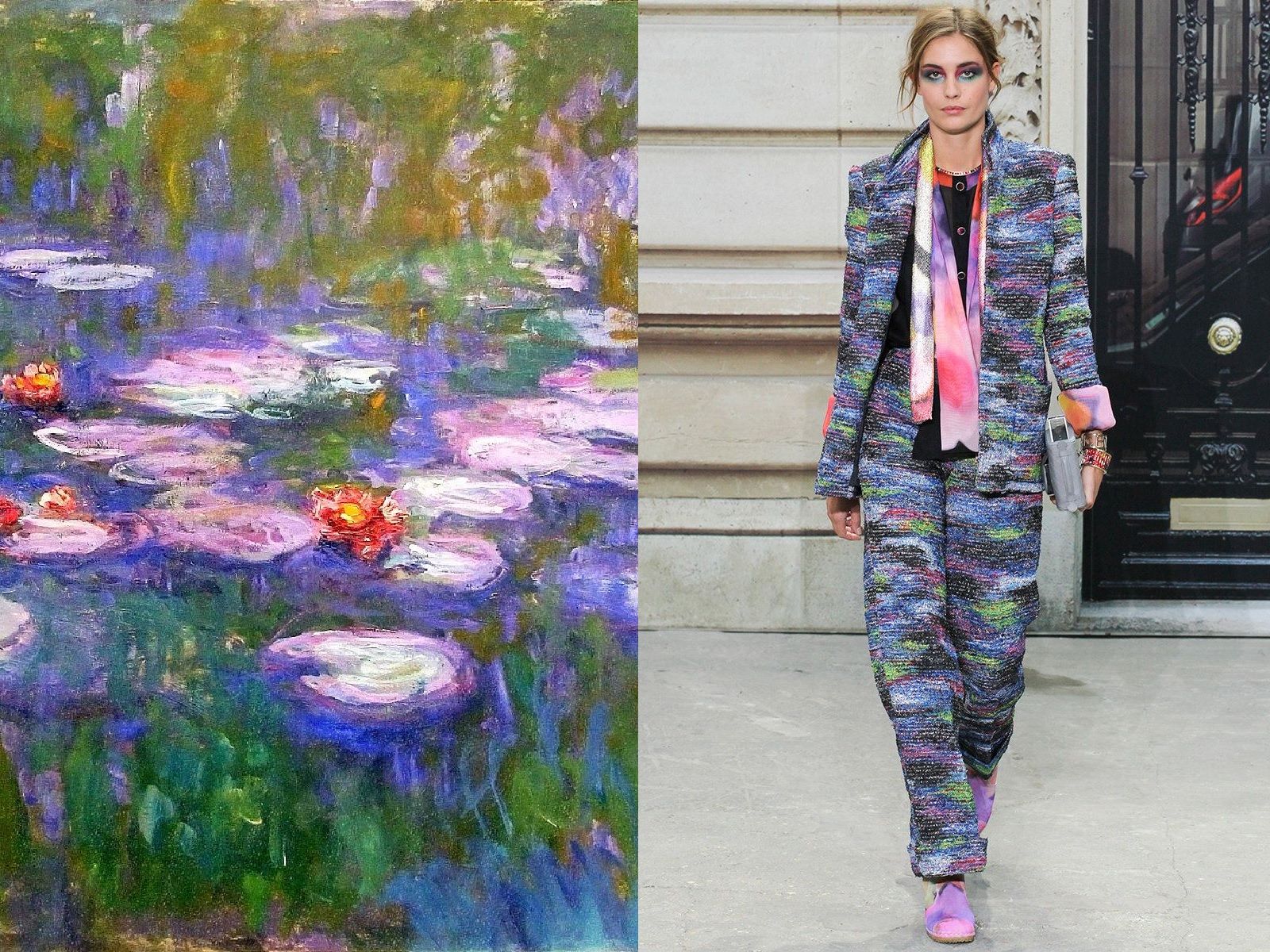 Claude Monet is definitely one of the most popular French painters in history and his works, such as the famous series of Water Lilies that the impressionist genius captured during various times and seasons of the day, seem to have been created to be printed on beautiful clothes. From Dolce & Gabbana to Chanel, there are many designers who have noticed the evocative power of his canvases, with their intense colors and nature blooming vividly. The leader of the impressionist movement, his enchanting landscapes, iris meadows, water lilies and the elegant ladies he portrayed have made the creations of Sportmax, Christian Dior, YSL, Prada, Akris and many other brands special.