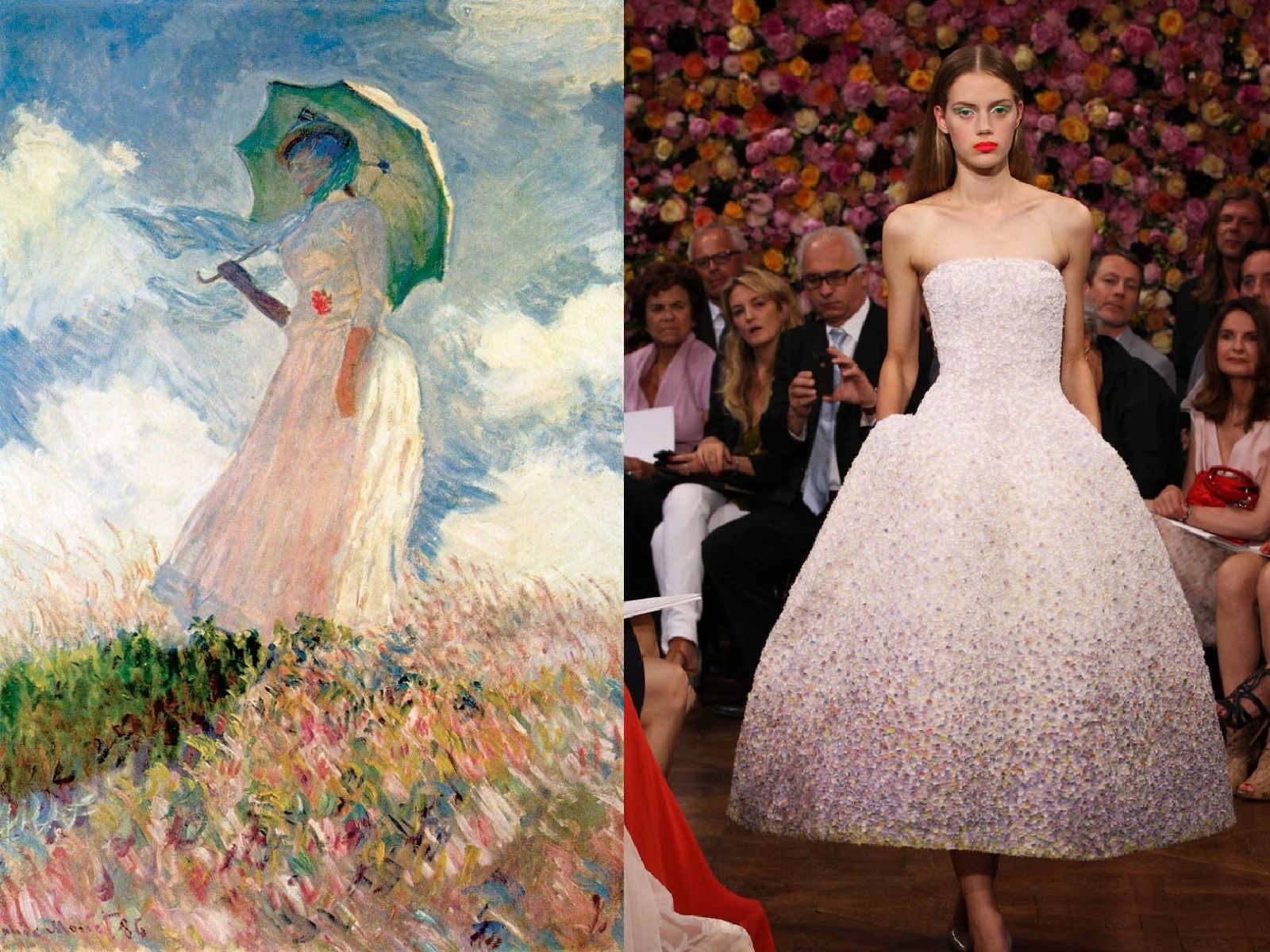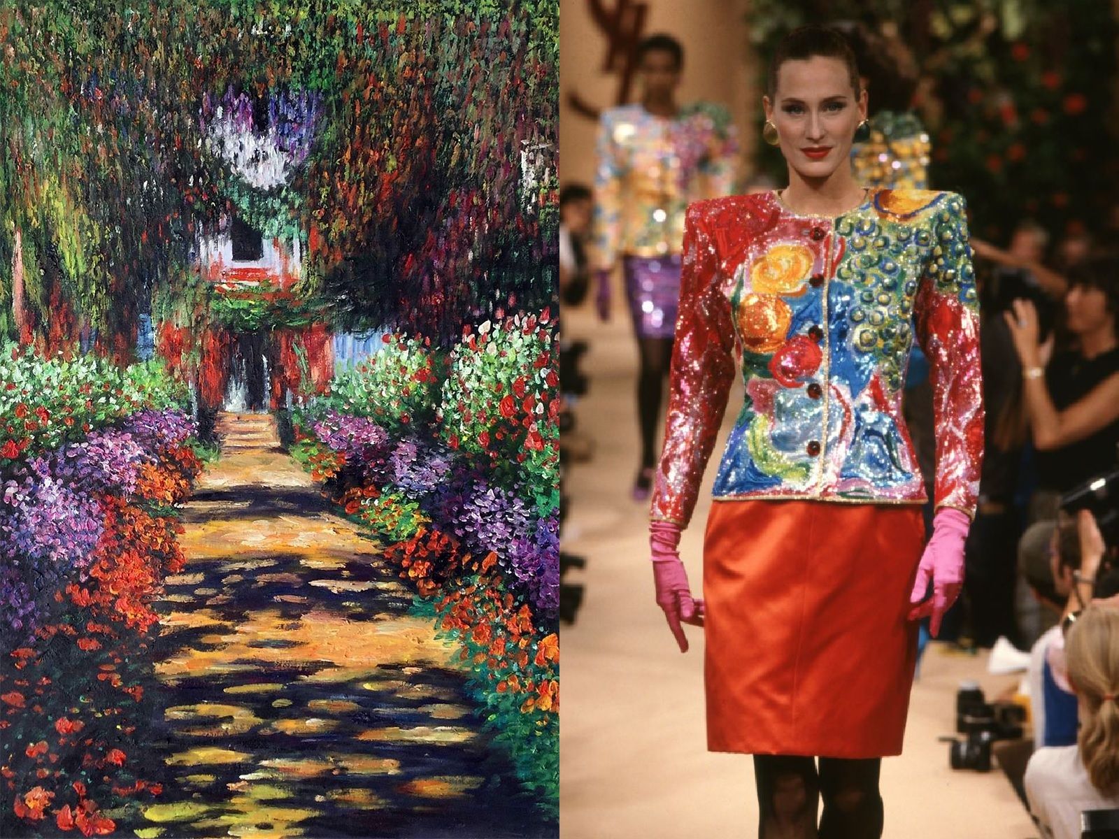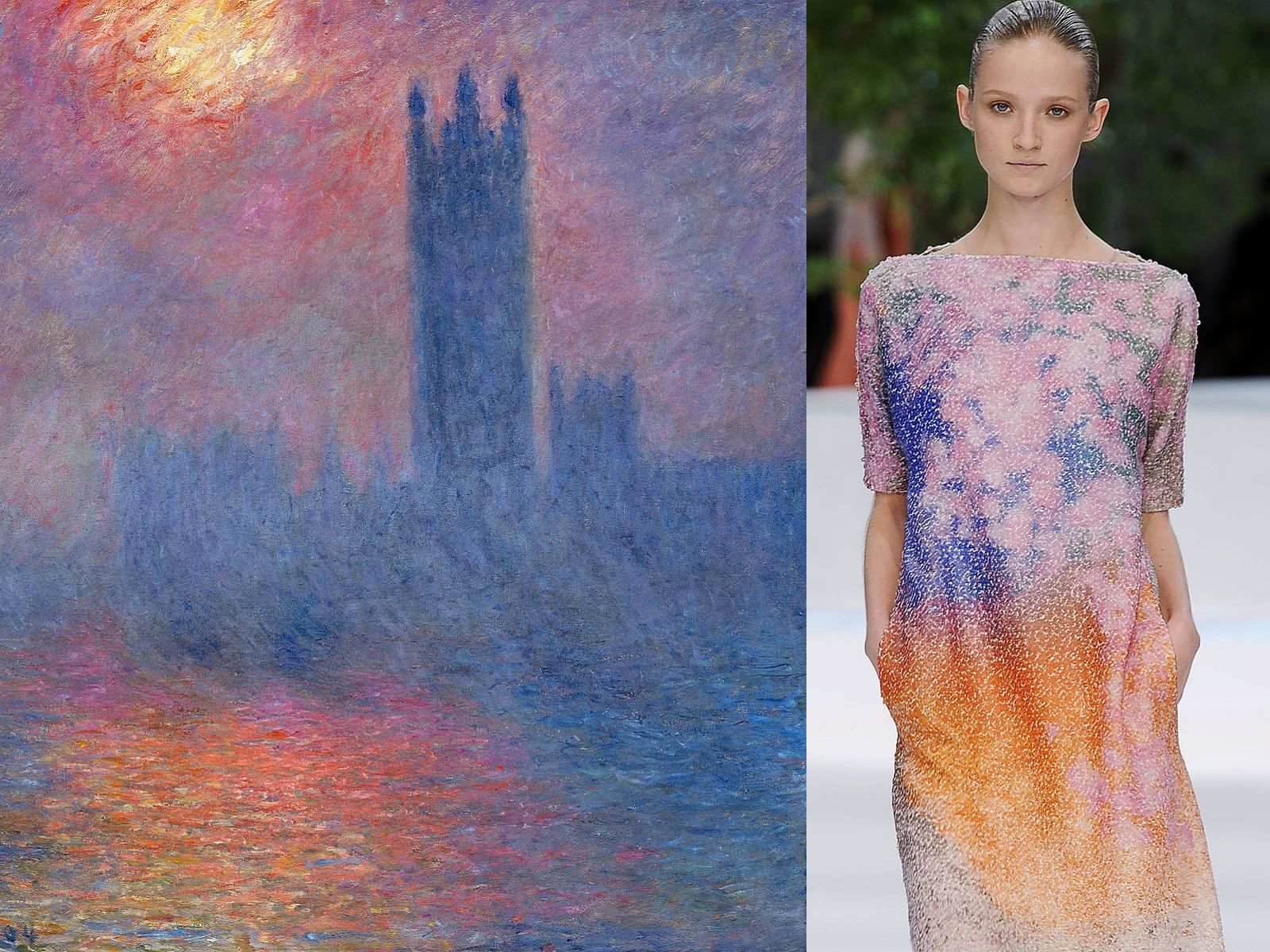 Claude Monet is definitely one of the most popular French painters in history and his works, such as the famous series of Water Lilies that the impressionist genius captured during various times and seasons of the day, seem to have been created to be printed on beautiful clothes. From Dolce & Gabbana to Chanel, there are many designers who have noticed the evocative power of his canvases, with their intense colors and nature blooming vividly. The leader of the impressionist movement, his enchanting landscapes, iris meadows, water lilies and the elegant ladies he portrayed have made the creations of Sportmax, Christian Dior, YSL, Prada, Akris and many other brands special.
