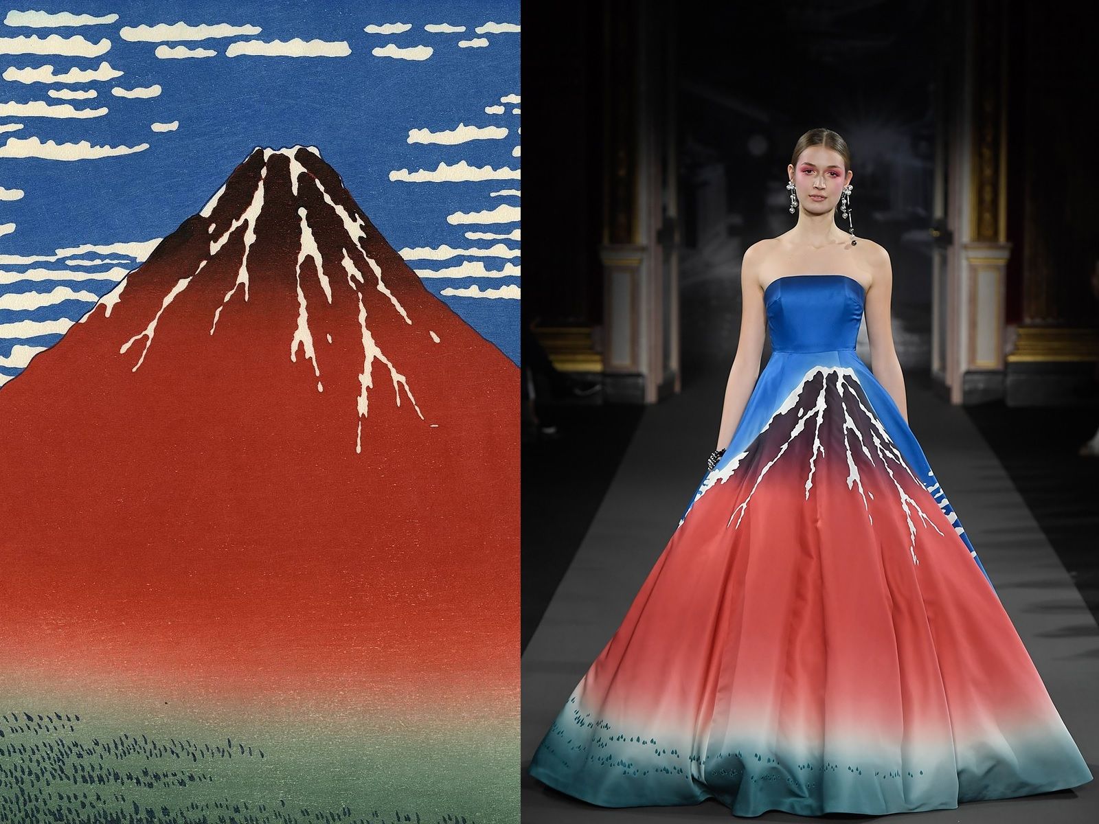 The Great Wave of Kanagawa, Katsushika Hokusai's most famous work, which was apparently conceived between 1829 and 1833 continues to influence art and fashion centuries after its creation. Alexander McQueen drew inspiration from this example of majestic nature for Givenchy's Haute Couture, as did John Galliano for Christian Dior's Couture.