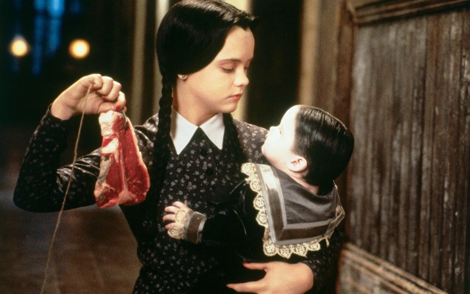 Wednesday is the daughter (younger or older depending on the TV or movie version) of Gomez and Morticia. Silent, melancholic, with a certain amount of aggression and sadism, she wears long braids, a little black dress with a white collar, spends her time guillotining her doll Marie Antoinette and torturing her brother Pugsley. Even Prada fell in love with this wacky little girl, so much so that it was inspired by her for the FW19 collection.
