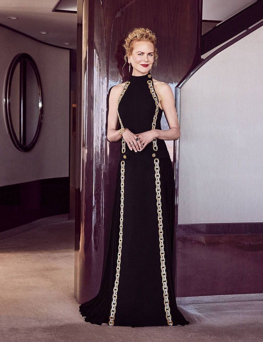 Movie awards become a way to peek into the mansions and routines of celebrities, creating a strange mash-up between comfy-chic and sparkling elegance. So Jodie Foster won as Best supporting actress in any motion picture and celebrates, in her pajamas, kissing her wife; Nicole Kidman, despite the fact that her The Undoing did not receive any award, appeared on screen in a black long dress with gold details by Louis Vuitton, next to her husband and two daughters; while Lily Collins was portrayed sitting on a gown in a gold and blue one-shoulder Saint Laurent dress.