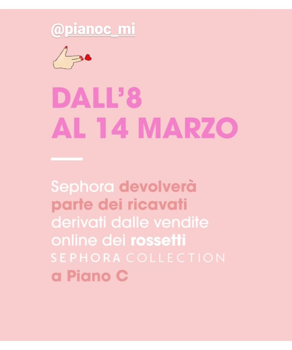 From March 8th to 14th, part of the revenues from the sales of Sephora Collection lipsticks on sephora.it will be donated to Plan C to support its initiatives. Furthermore, on March 8, all orders over € 50 on the site will receive a free box containing 3 mini-sizes of the cult brands Anastasia Beverly Hills, Fenty Beauty and Benefit, which have always been supporters of female empowerment.