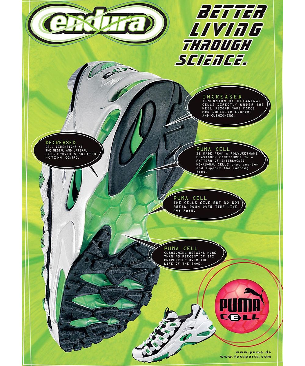 Last but not least, the Puma Cell Endura. To commemorate the 20th anniversary of its most innovative CELL technology, Puma reimagined the 1998 Cell Endura sneaker in 2018. In comparison to the original, the latest version has very few modifications. One of those changes was a slimmer toe box for a more modernized and sleek appearance. The upper, on the other hand, remains quite complex. Including the standout ingenious lacing system, and transparent bubbles that expose the cushioning in the midsole.