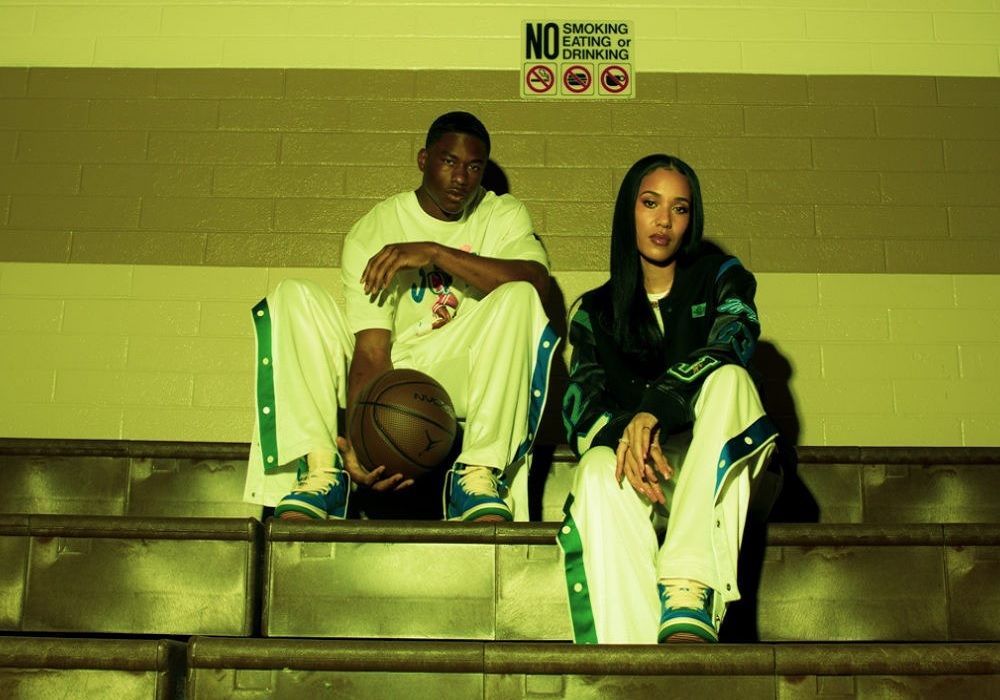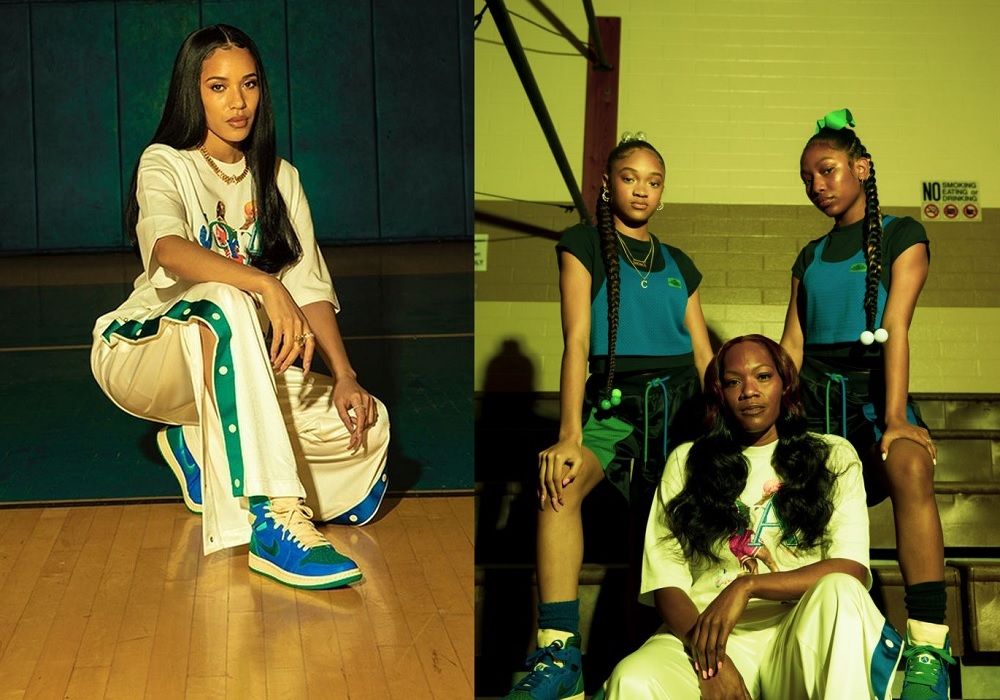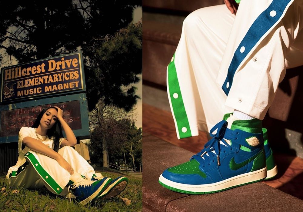 Following the first images of a new Air Jordan 1 Zoom CMFT leaked last February, Jordan Brand has announced the release in stores of the first apparel collection created by Aleali May. The new project, which consolidates a partnership that began in 2017, is called Califia, after the black queen who in the fifteenth-century saga Las sergas de Esplandián gave rise to the state of California, and is strongly connected with the designer's life. In an interview with her high school coach, Shanora Holloway, May anticipated that there will be two drops. The first, to be launched on April 22, mixes the colors of the Inglewood High School team that aleali trained with while attending Hillcrest Elementary, with Los Angeles style, varsity design and the way of basketball and skateboarding. The result of this mix of inspirations is a series of graphic tees, varsity jackets, pull-on pants, multi-layered cropped shirt and a pair of shorts, declined in white, green and blue. The highlight of the collection are definitely the sneakers, a model of Air Jordan 1 Zoom CMFT featured by the upper that alternates a bright green to a bright blue, broken by accents of beige and yellow sole, but also by a mix of materials such as leather and chenille.