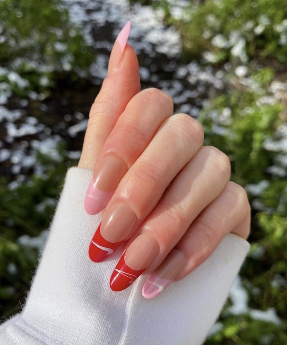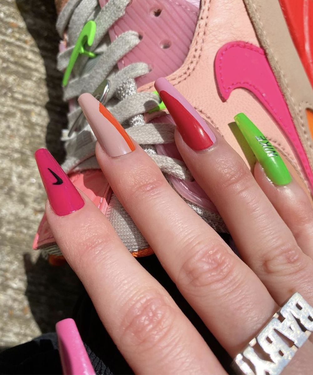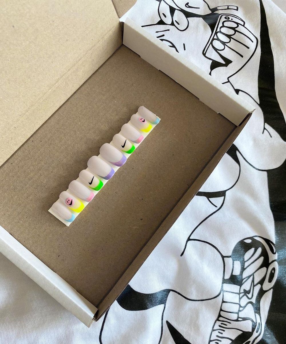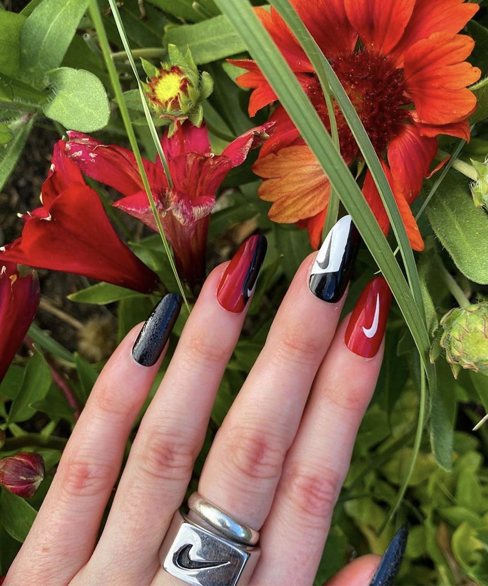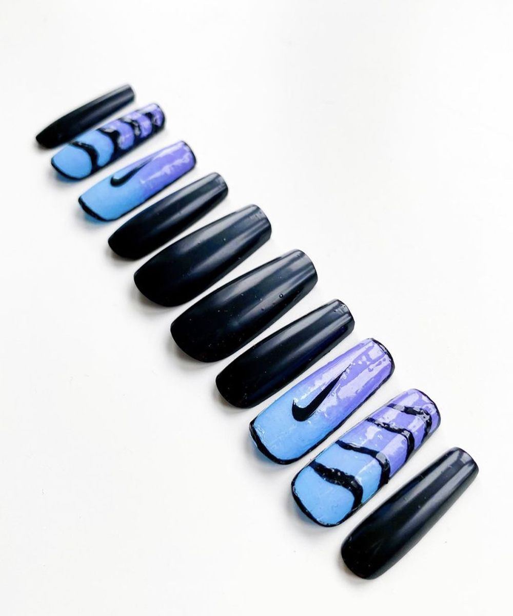 N1KE Nails, is located in London, and offers the cutest nail arts to go along with your Nike sneakers. This small nail business offers custom Nike-inspired press-on nails that can be applied to your nails from the comfort of your own home. Their extensive collection features sets like the J Balvin Jordan 1 inspired nails, which have a stunning blue to red ombré, as well as a Valentine's inspired set in bright pink and red with mini swooshes emblazoned on each tip. So if you want your nails to compliment your sneakers and elevate your outfit? N1KE Nails has you covered!
