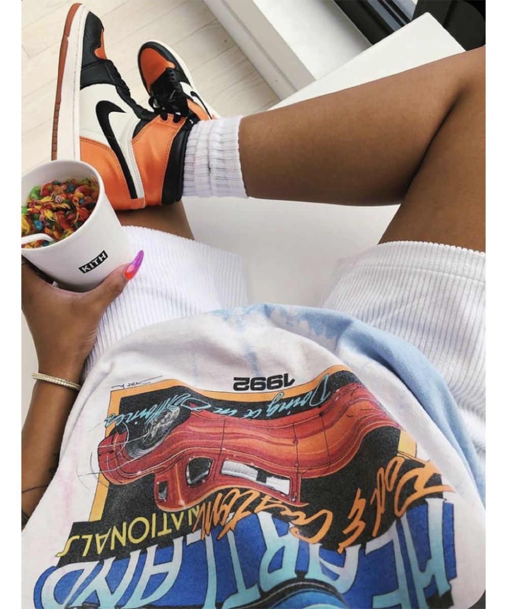 Sweatpants have evidently become the new uniform for many, as they can effortlessly be dressed up or down during the cold months. However, in the summer heat, sweatshorts are a smarter choice because they are just as comfy and easy to throw on, while allowing your legs to catch some sun, and are most popularly paired with an oversized graphic t-shirt.