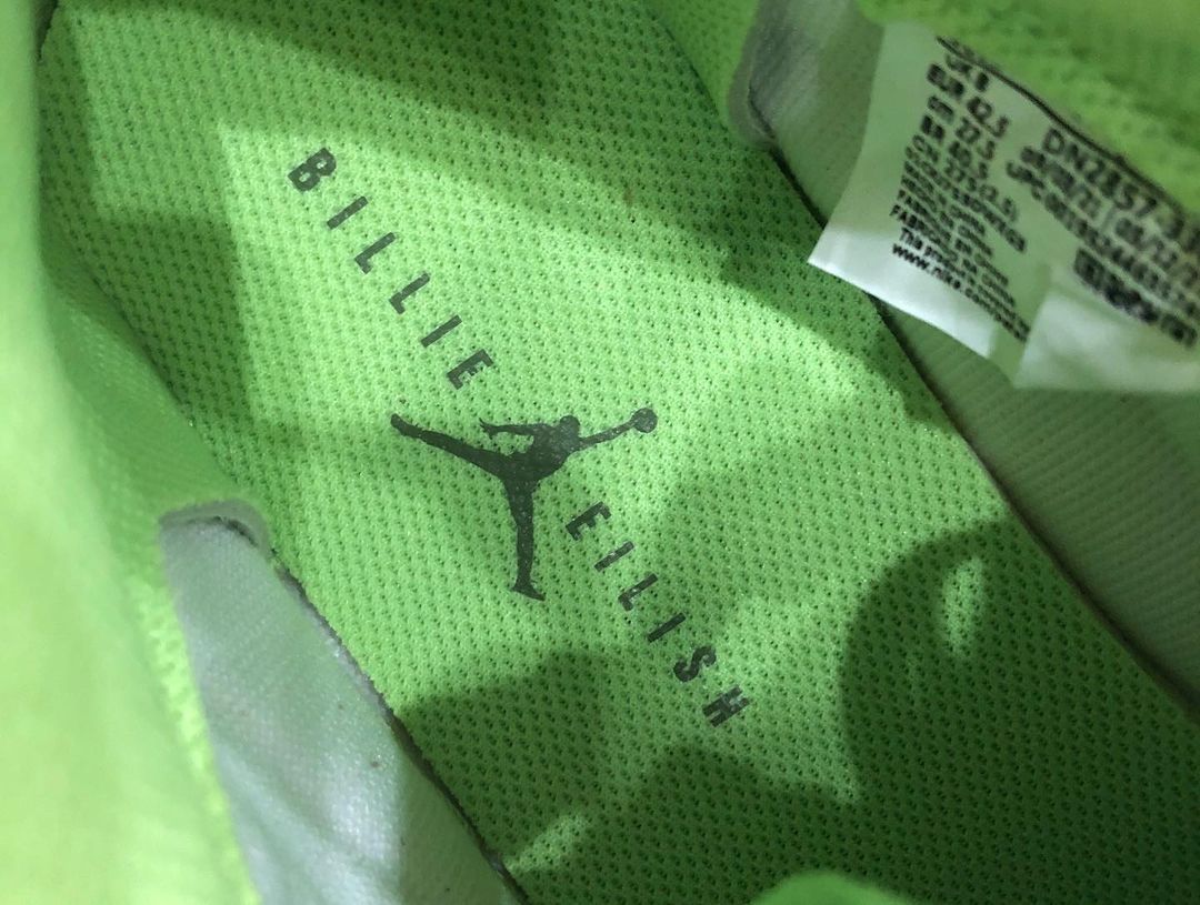 Billie Eilish x Air Jordan 1 High Volt features a neon green leather upper (the California singer's signature color), stitching that runs through the side and medial panels, and extra cushioning that gives it an eye-catching design. On the tongue, there is Eilish's Blohsh instead of the standard Nike Swoosh logo, while on the insole of the shoe there is the typical Jumpman surrounded by the words "BILLIE EILISH".