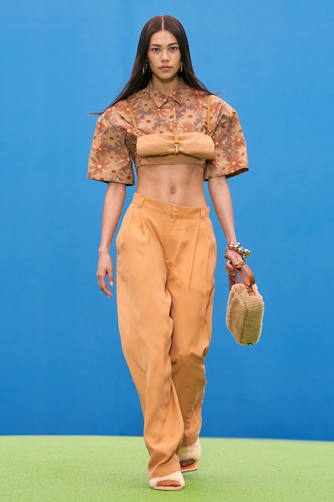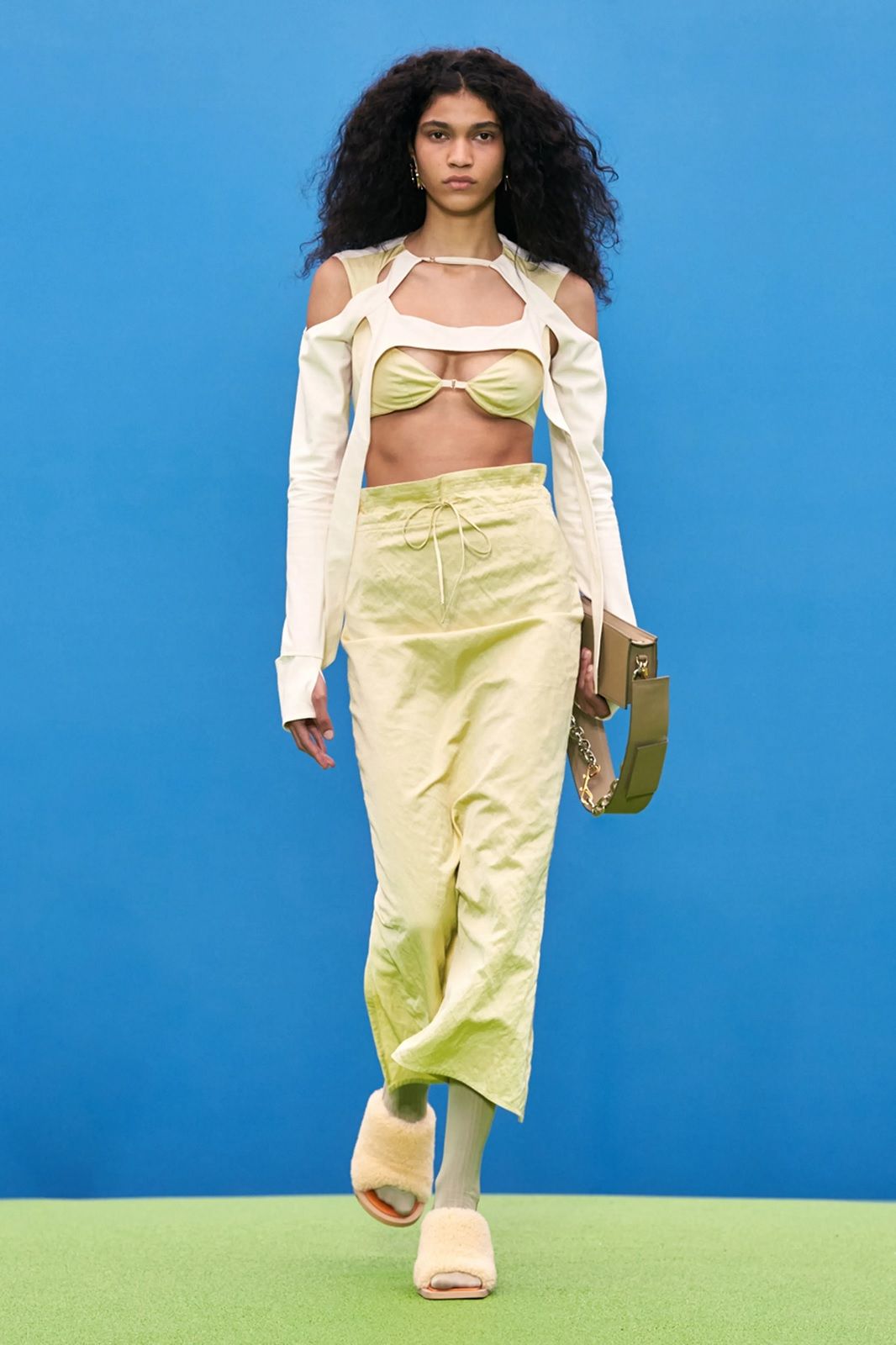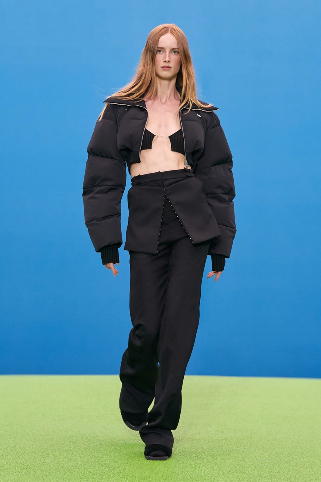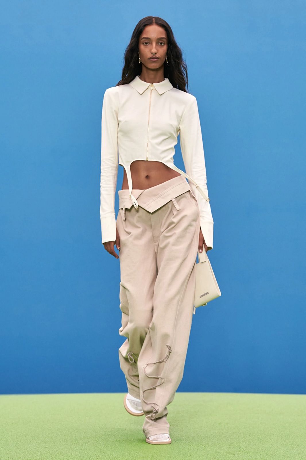 The result is a post-gorpcore take on the Jacquemus style. There are still all the signature items of the brand such as the Chiquito bag (becoming more and more mini), the bodycon dress with cut-out details, the crochet bralettes and, above all, the baby cardigans. The tops, whether simple tees, bra or blouses, are cropped, as are the outerwear. The lengths of shearling, down jackets and jackets become shorter and shorter and, as in the '90s, they are worn over bell-bottomed jazz pants or baggy pants. Also from the decade of Nirvana and Spice Girls, the skirt-pants combo is back in the spotlight.