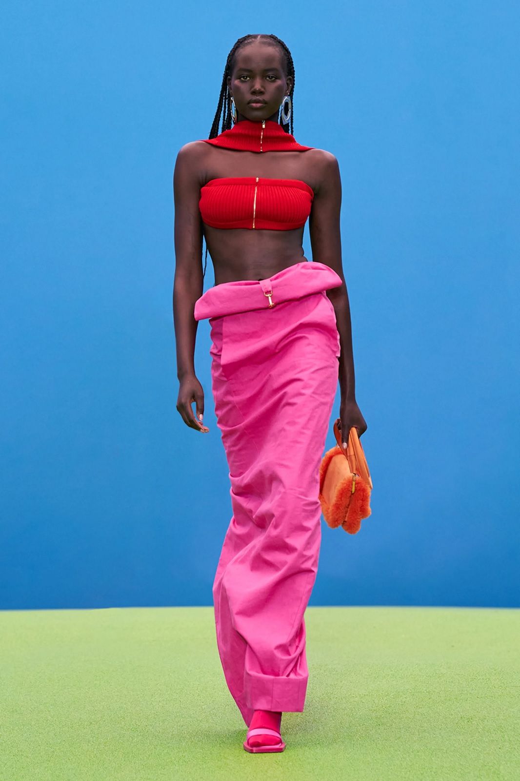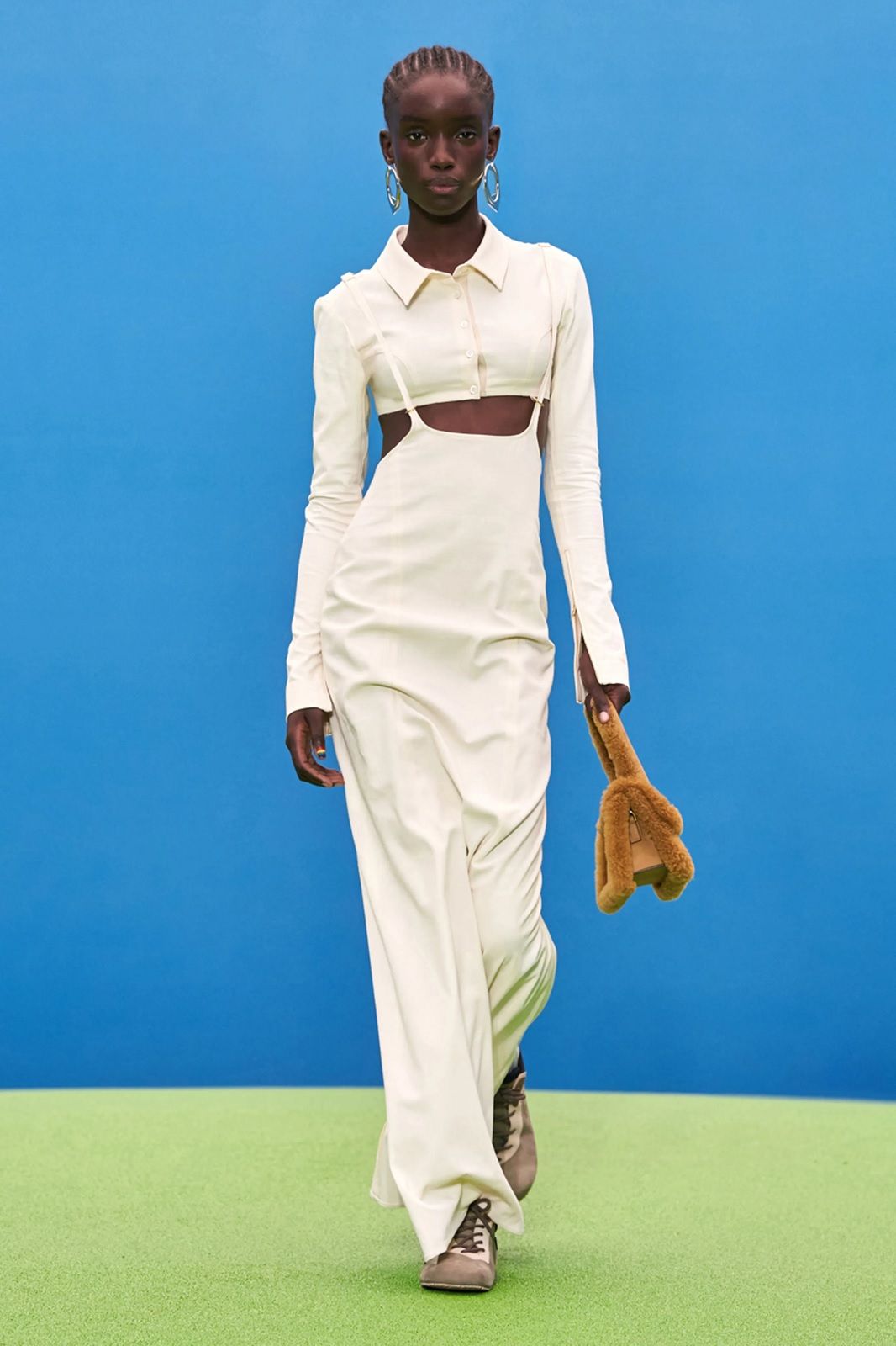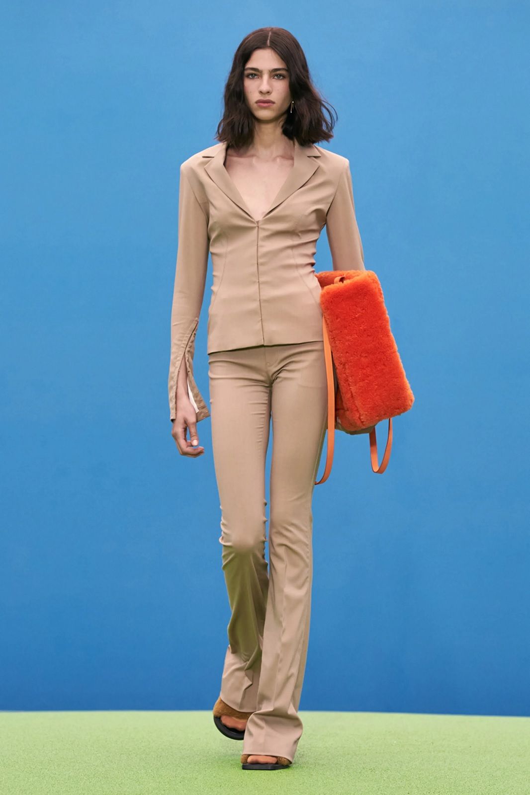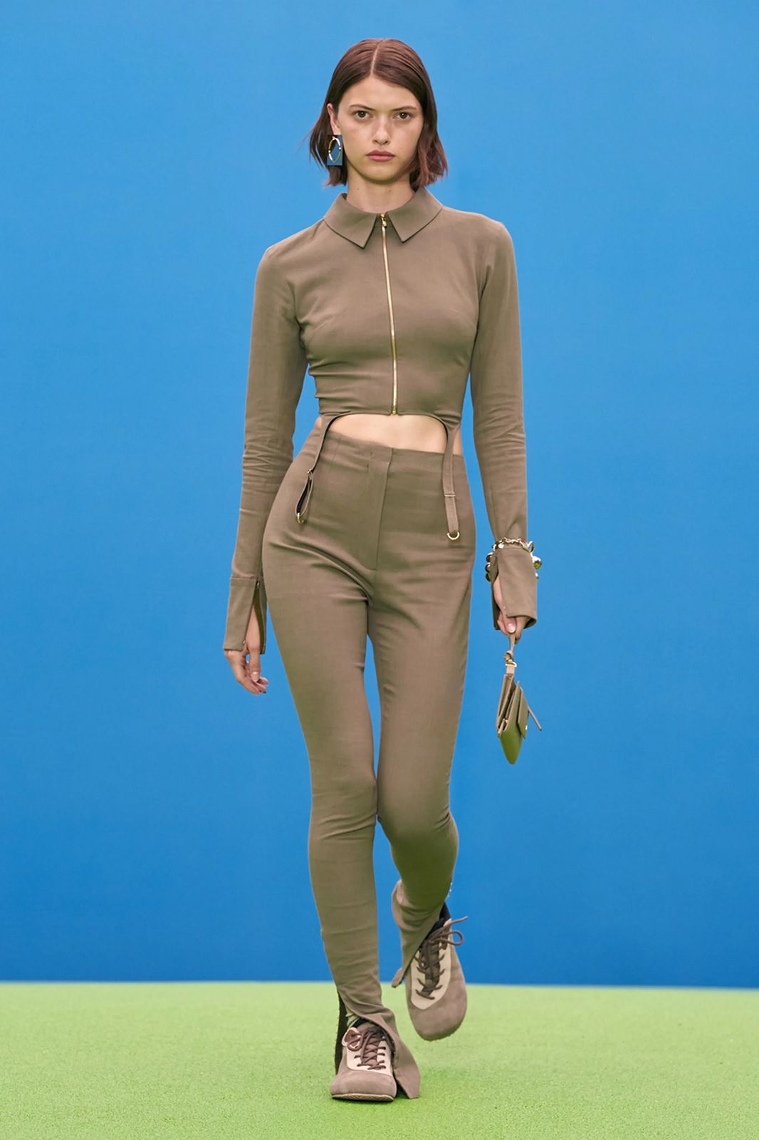 The result is a post-gorpcore take on the Jacquemus style. There are still all the signature items of the brand such as the Chiquito bag (becoming more and more mini), the bodycon dress with cut-out details, the crochet bralettes and, above all, the baby cardigans. The tops, whether simple tees, bra or blouses, are cropped, as are the outerwear. The lengths of shearling, down jackets and jackets become shorter and shorter and, as in the '90s, they are worn over bell-bottomed jazz pants or baggy pants. Also from the decade of Nirvana and Spice Girls, the skirt-pants combo is back in the spotlight.