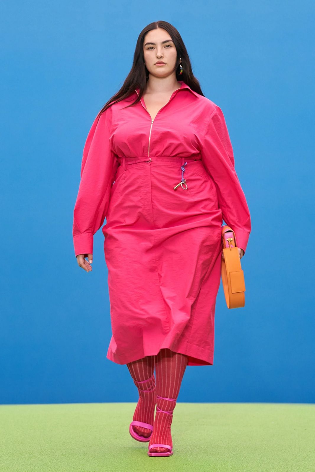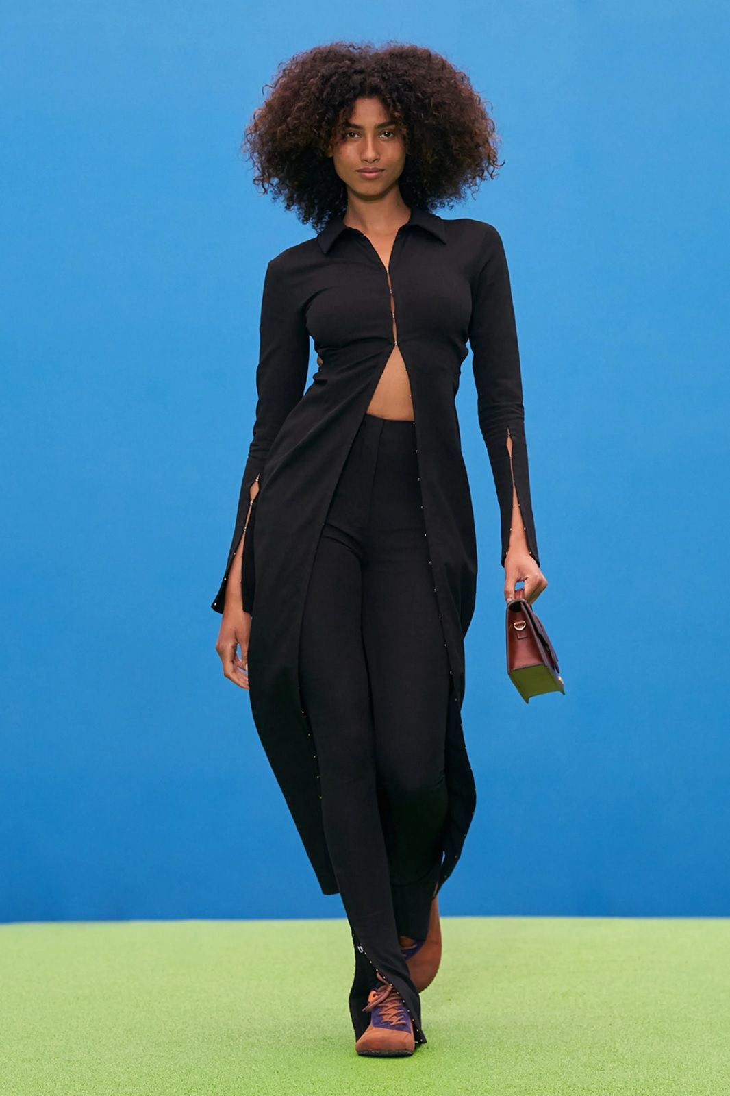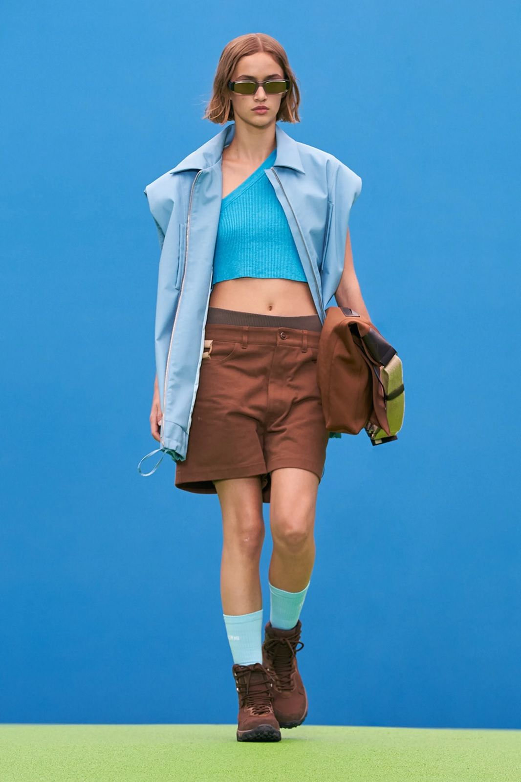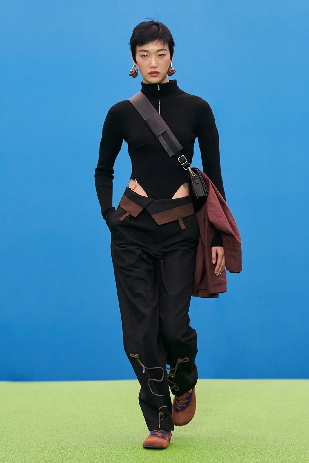 The result is a post-gorpcore take on the Jacquemus style. There are still all the signature items of the brand such as the Chiquito bag (becoming more and more mini), the bodycon dress with cut-out details, the crochet bralettes and, above all, the baby cardigans. The tops, whether simple tees, bra or blouses, are cropped, as are the outerwear. The lengths of shearling, down jackets and jackets become shorter and shorter and, as in the '90s, they are worn over bell-bottomed jazz pants or baggy pants. Also from the decade of Nirvana and Spice Girls, the skirt-pants combo is back in the spotlight.