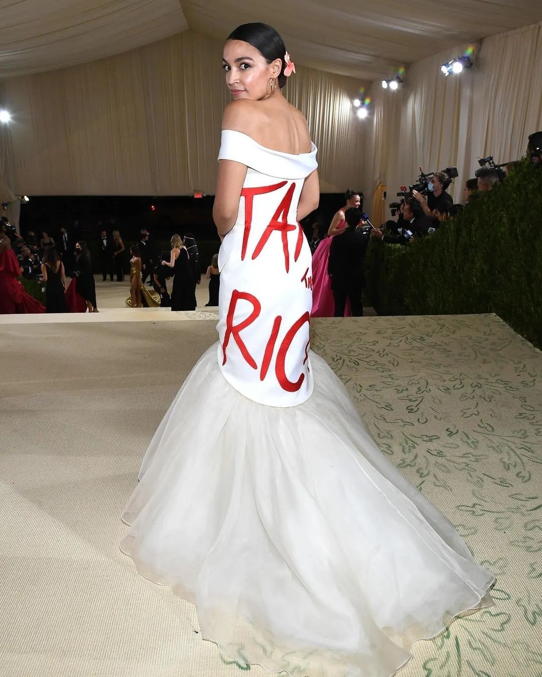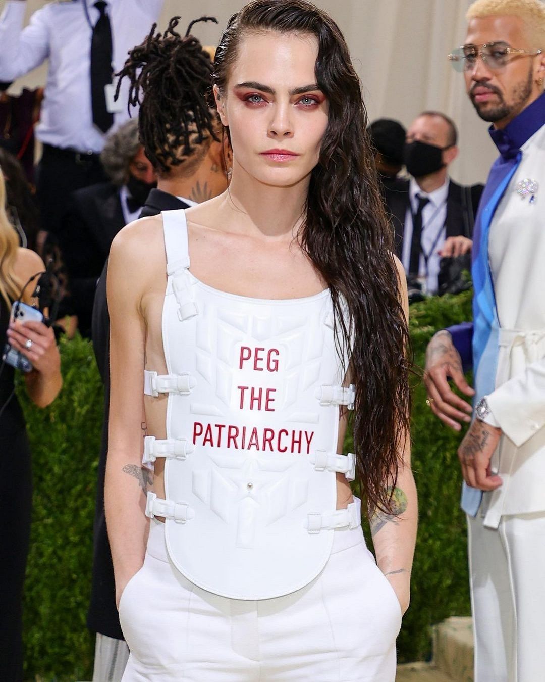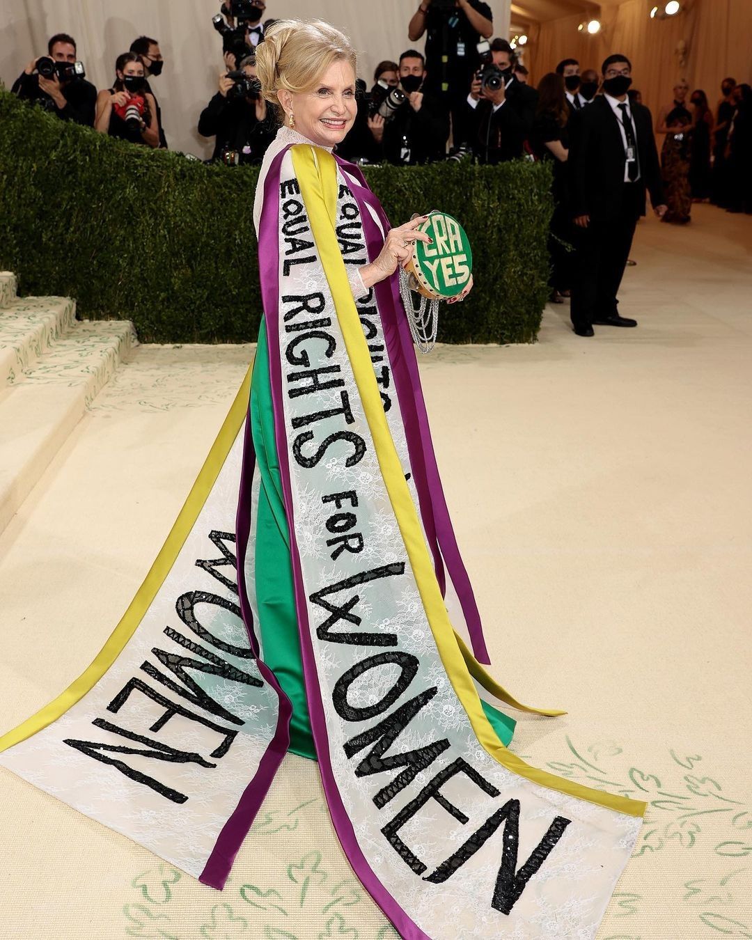 There were also several statement dresses with a strong political message such as Cara Delevigne's bulletproof jacket by Dior decorated with the phrase "Peg the Patriarchy", a message of female empowerment coined in 2015 by Luna Matatas. Highly contested were the outfits of Alexandria Ocasio-Cortez and Carolyn B. Maloney. The first attended her Met Gala in a white Brother Vellies dress, long to the feet, on which we read the slogan "Tax The Rich". The U.S. Congresswoman is fighting since 2019 to tax more heavily the population groups with the highest incomes and allocate those taxes to fund services such as health care or the Green Deal, but to many her presence at the gala seemed to be contradictory for the high cost of the ticket (35 thousand dollars!). Carolyn B. Maloney, on the other hand, attended the event wearing a dress with the typical colors of the suffragettes and the slogan "Equal Rights for Women". A choice that sounds a bit hypocritical given that, as @diet_prada also points out, in 2001, the Congresswoman dressed in a burqa to justify the invasion of Afghanistan in 2001.