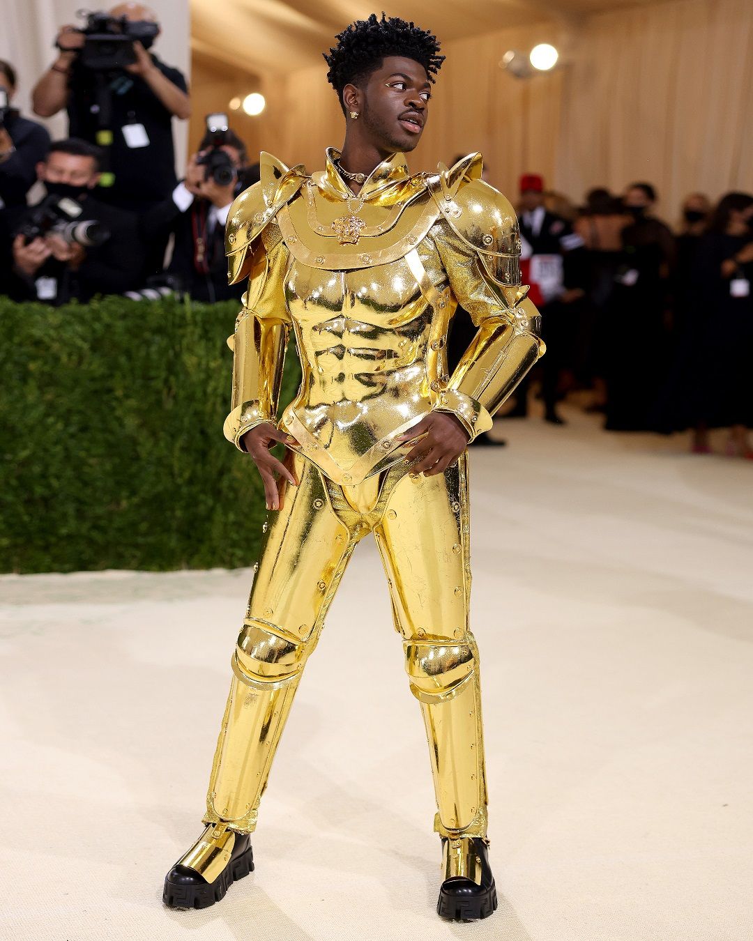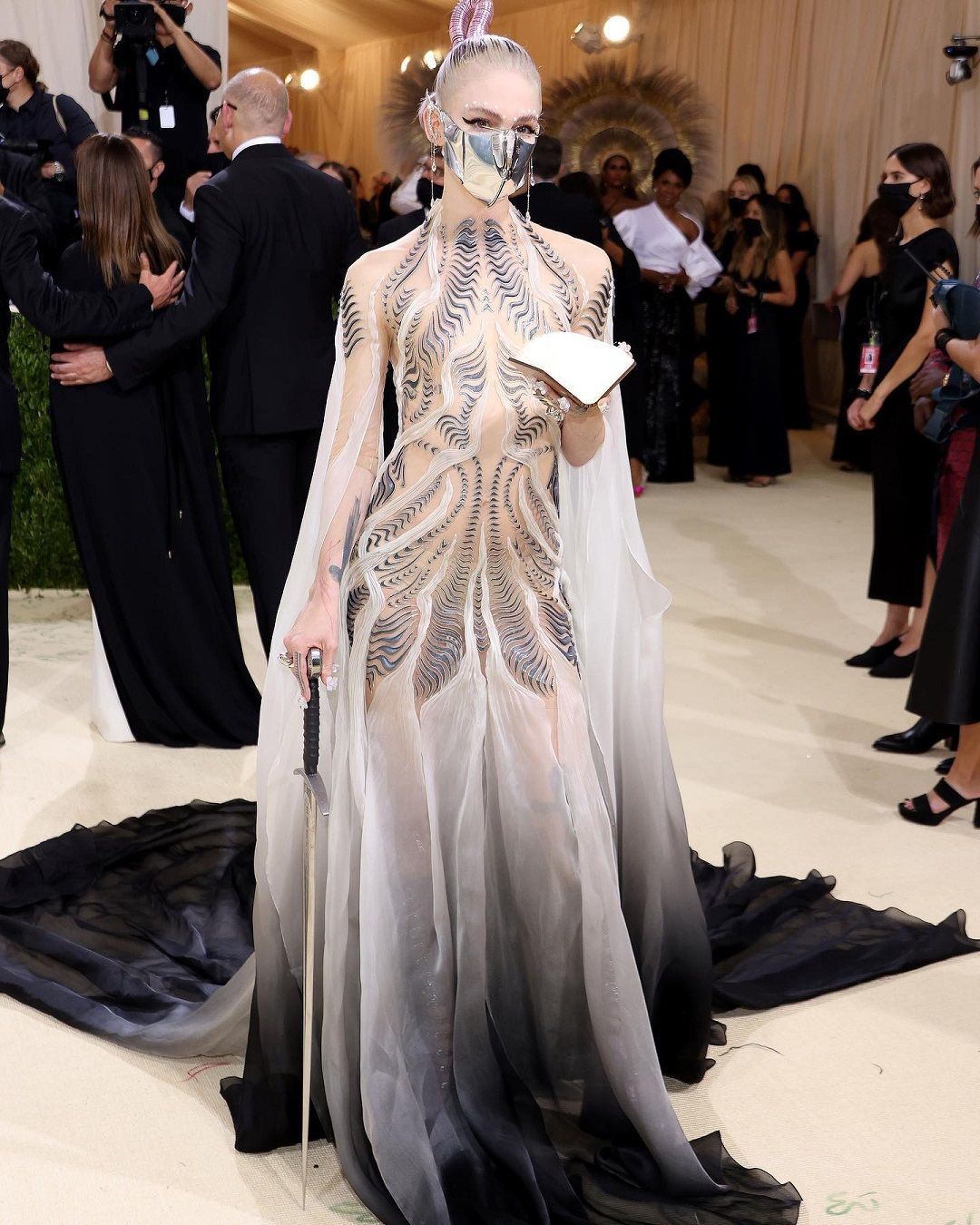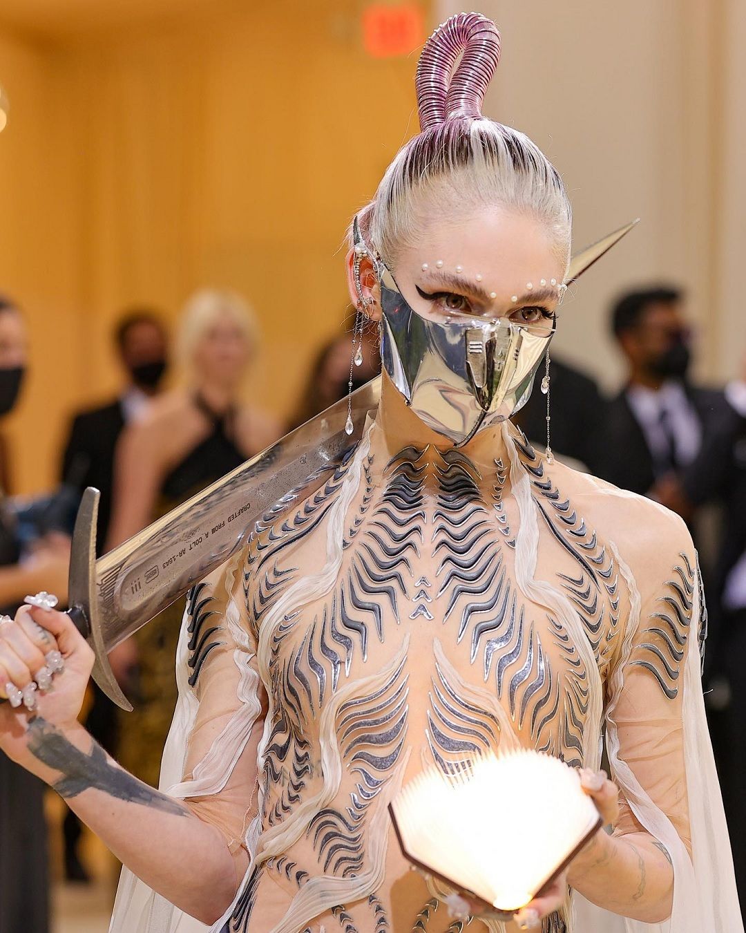 Kim's outfit is included in the list of "the weird ones", those stars who play with their image as Lil Nas X did in total gold Versace, Hunter Schafer in a very sci-fi Prada with a silver spider on the face, Grimes in knight version or Maisie Williams super dark in a look designed by her boyfriend Reuben Selby.