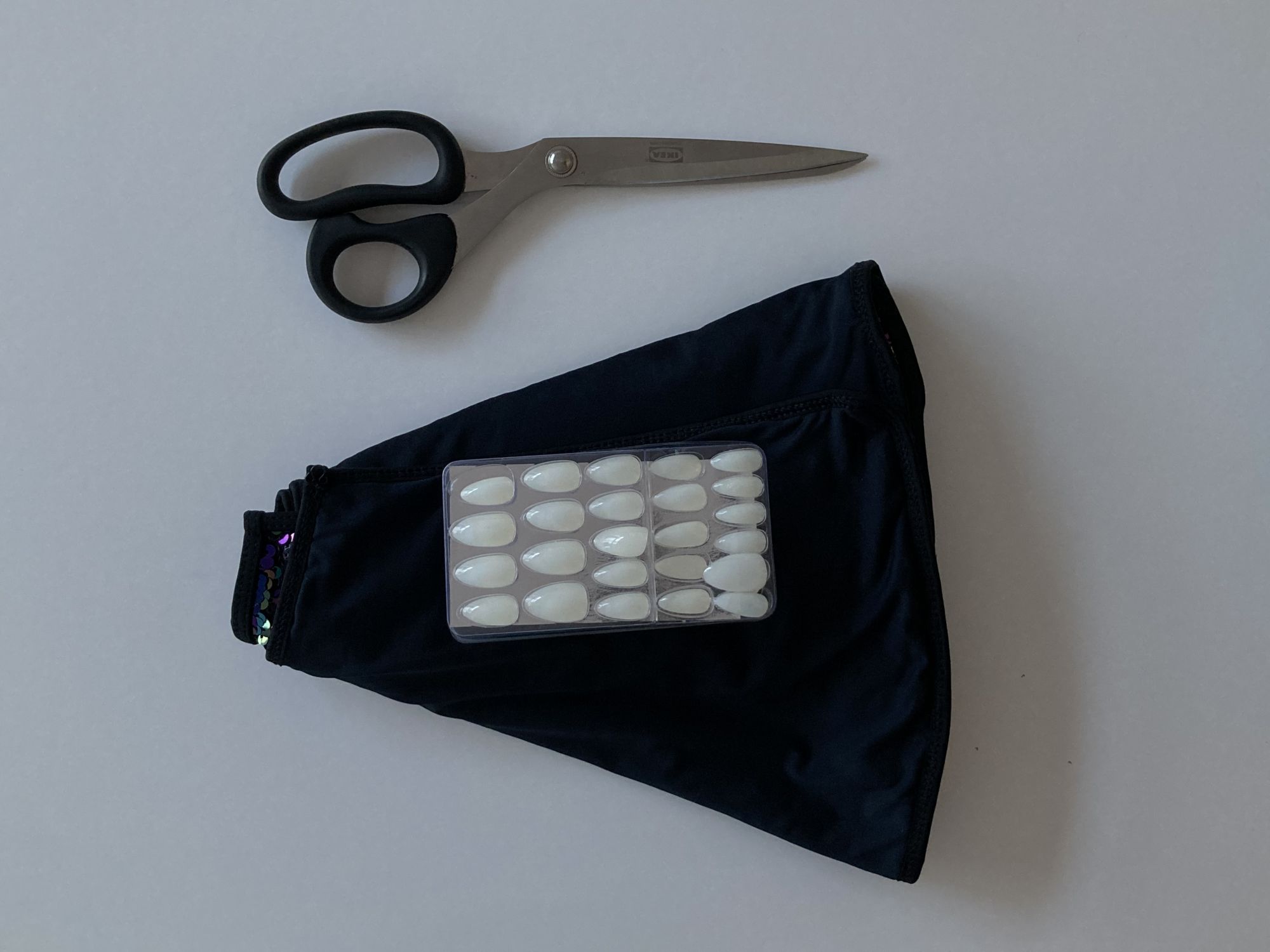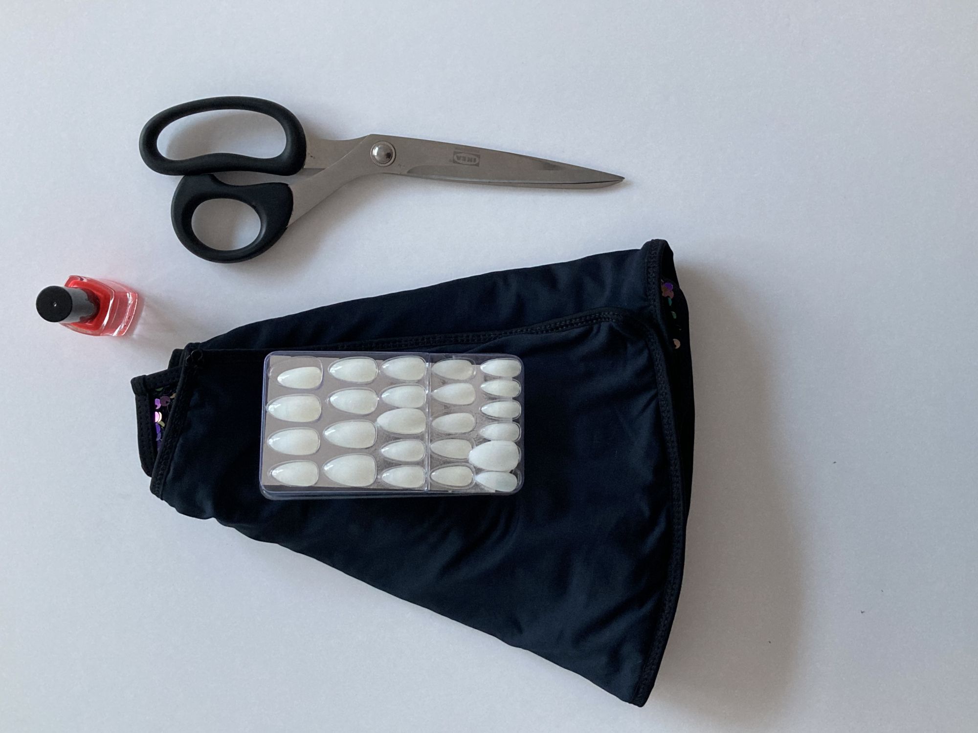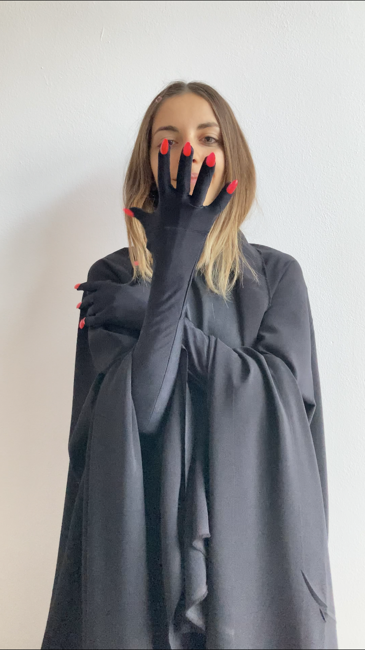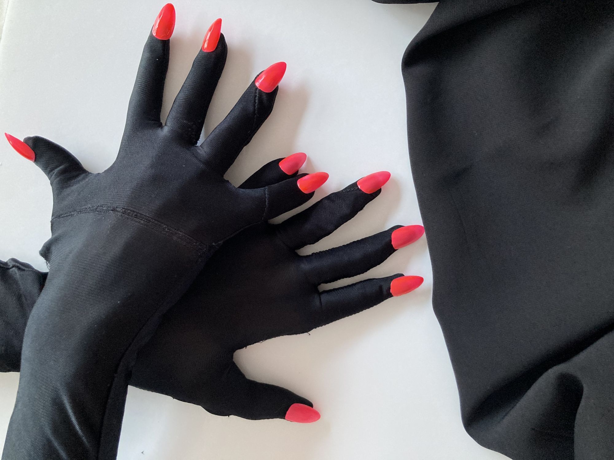 In the experiment, we made the gloves by recycling an old dress that is now out of fashion, shiny enough to give that slightly scary and kitschy style perfect for Halloween. Their size and length can vary according to needs and tastes, we have made them long, for the evening, in black satin. We then finished it off with red fake nails, macabre enough to be in line with the scary night.