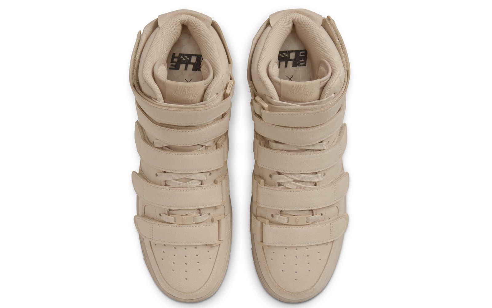 The result of this restyling is a monochromatic model, with the upper made up of 80% recycled materials, declined in premium beige suede, or rather "Mushroom", and a midsole made of Nike Grind. The new shoe differs from the OG version in its lacing system: five Velcro straps that start from the toe and go all the way down to the ankle. "Bloshsh", the Eilish logo, appears on the dubrae and on the shoe box, where we can read the same secret message that also appears on the cork insoles: "It's hard to stop it once it starts".