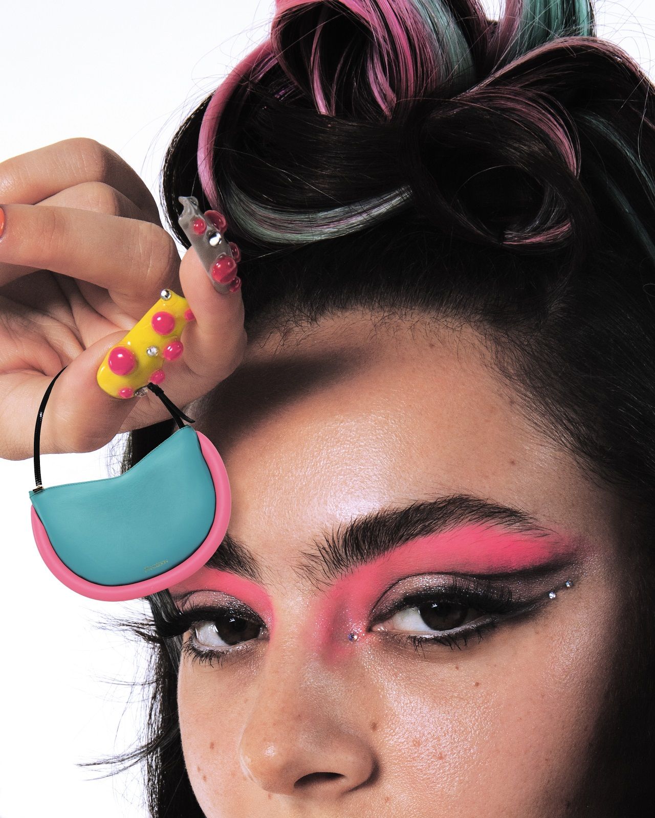 The images shot by Conor Cunningham are an explosion of color, a lesson in dopamine dressing in the Y2K mood. Every detail of the visual was designed by Anderson to enhance his creations, which reinterpret the minimalist silhouettes of clothes and accessories with a playful pop-surrealist twist. Not only Charli XCX's outfits, the Bumper Bag or the Bumper mules, but also beauty. For the British singer Danielle Kahlani, she created a high-impact, colorful and vibrant make-up where the focus is on the eyes. The make-up artist applied eye shadow in an irregular way, played with graphic eye-liner and added some eye gems. The products she used? For the pink @beautycreations.cosmetics, for the blue she chose Pat Mcgrath's Bridgerton palette. The plus of the look are the nails, created by @byjuanalvear, which echo the colour combos of the Bumper Bag.