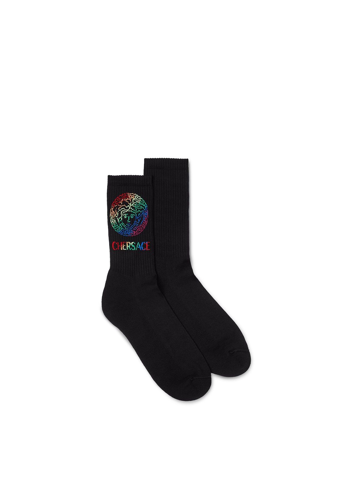 Each piece is totally black, illuminated by some rainbow details: the Medusa logo, the Chersace inscription, dedication and the signatures of the two style icons. The selection, available on versace.com from 7 June, also includes a baseball cap, a pair of socks and a limited edition tee hand-signed by Cher and Donatella and embellished with colored glitter that will only be on sale in the USA.