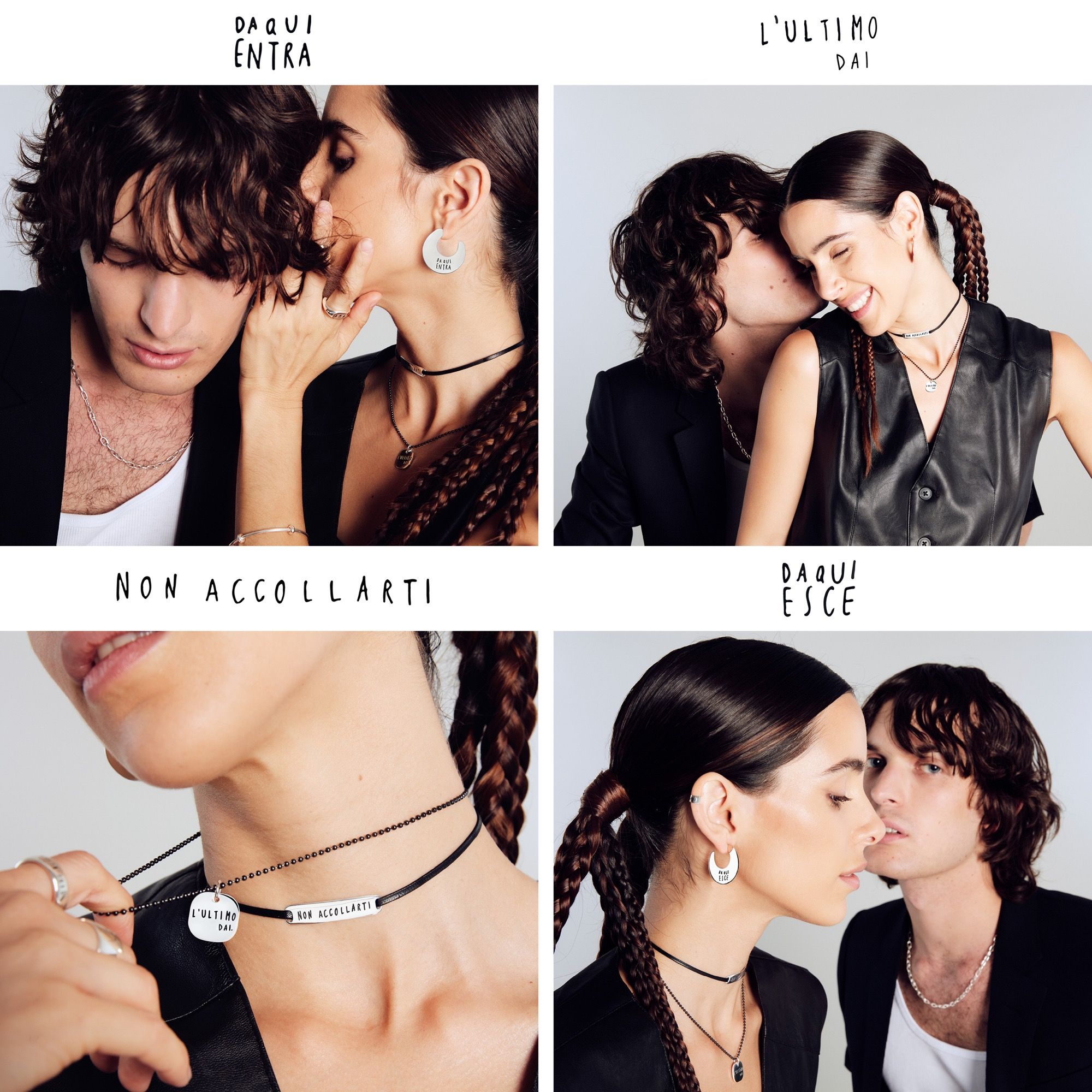 Silver acts as a blank canvas for the collection in which the artist has curated the lettering of the phrases, each handwritten, and is enriched in meaning by the emphasis given by the contrast of the brilliance of the material and the black enamel that blackens the engravings on the jewelry. Ylenia's messages revolve around the theme of the atavistic struggle between instinct and thought, head and heart, or verbal and nonverbal, and play with the interpretation of the message and the part of the body with which it is associated: the chevalier rings are engraved in such a way as to reveal only part of the phrase at first glance, such as the model engraved on the inside with "Il mio cuor è affamato" a message of which from the outside reads only "ama" with a play of volumes in the design. "Da qui entra" and "Da qui esce" are two phrases engraved on earrings with simple and irregular shapes, capable of wringing a smile from those who choose them as a gift to give or to self-give, and sparking an unexpected emotion in those who look at them. The aesthetic aspect and the sense of discovery are after all other elements that unite the world of tattoos and the world of jewelry, as well as the relationship with the body and gestures. Even the lanyard bracelet, wearable on the wrist as well as a choker or as a necklace, bears the phrase "don't take on" and the "silence" finger ring tell the same concept, fun and universal. Earcuffs, cuff bracelets, silver wedding rings and pendants work on the same idea, to communicate everyone's uniqueness without engraving anything on the skin, but having the same meaning.