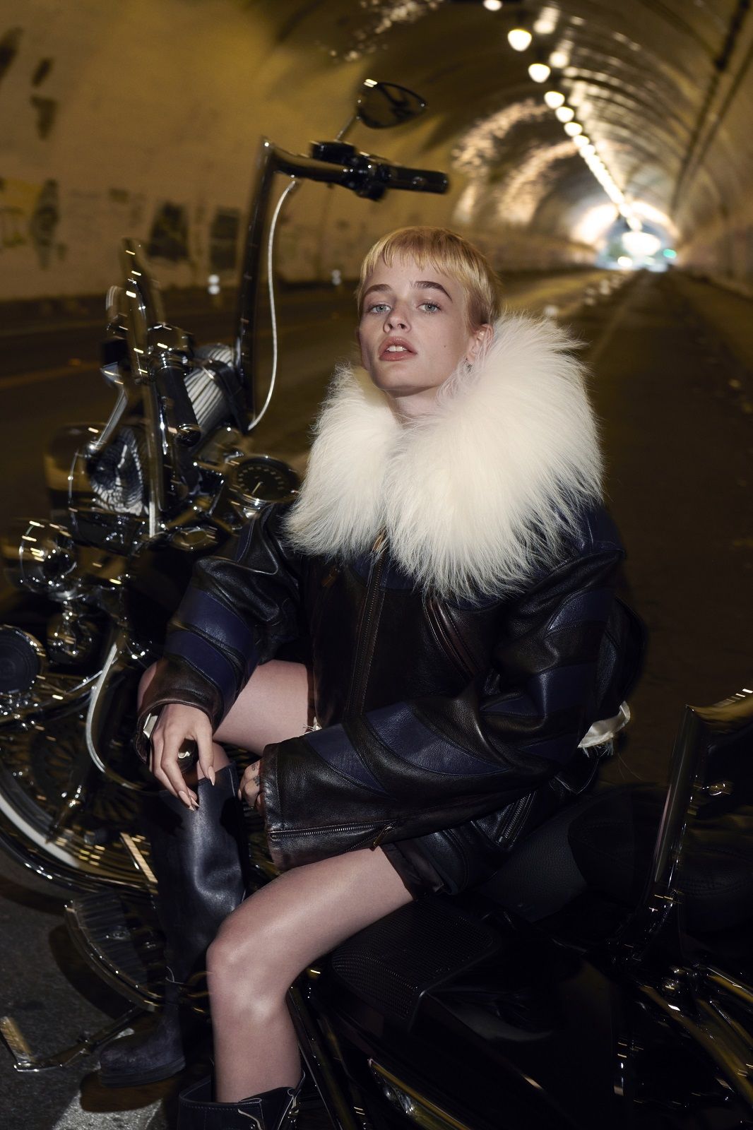 The campaign, shot by Kitajima Keizo with creative direction by Lina Kutsovskaya and styling by Lotta Volkova, is in full Motomami style and, like the entire collection, plays to debunk the preconceived notion of a leather jacket as a trope of men's fashion. Wearing the new Miu Miu garments, amid vintage motorcycles, gleaming metal, ink-black rubber an anonymous urban underpass, are actresses and models Esther McGregor, Ever Anderson and Mame Bineta Sane.