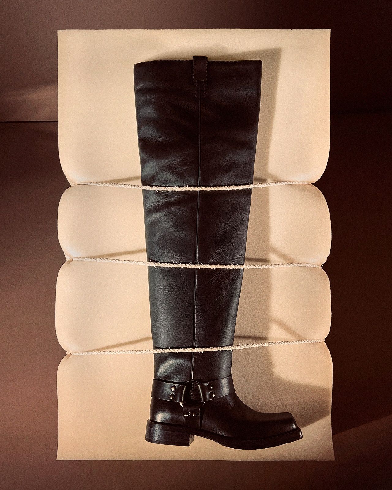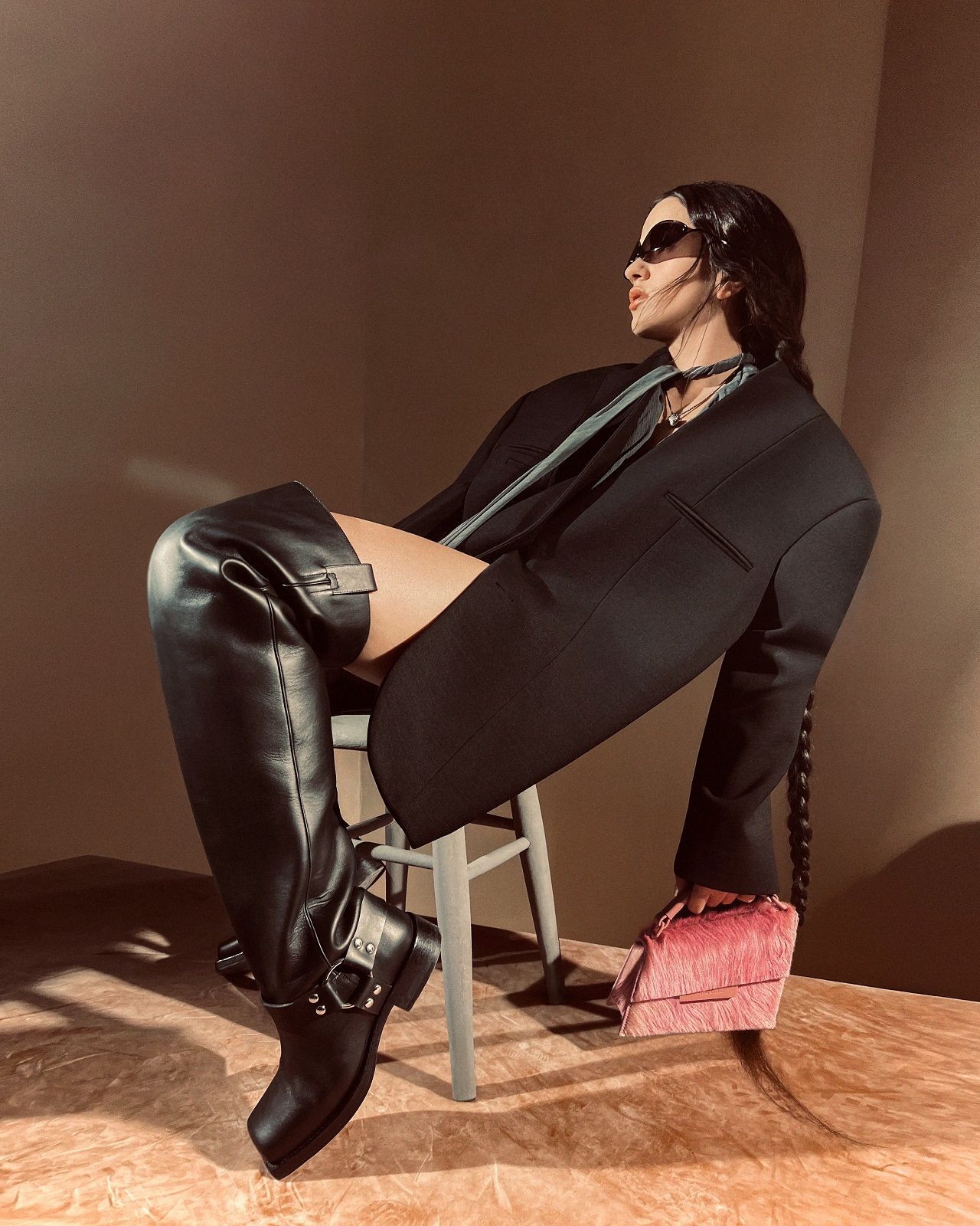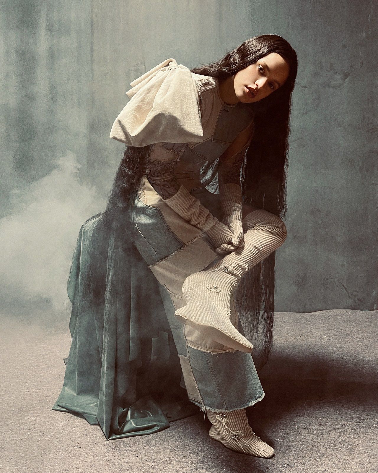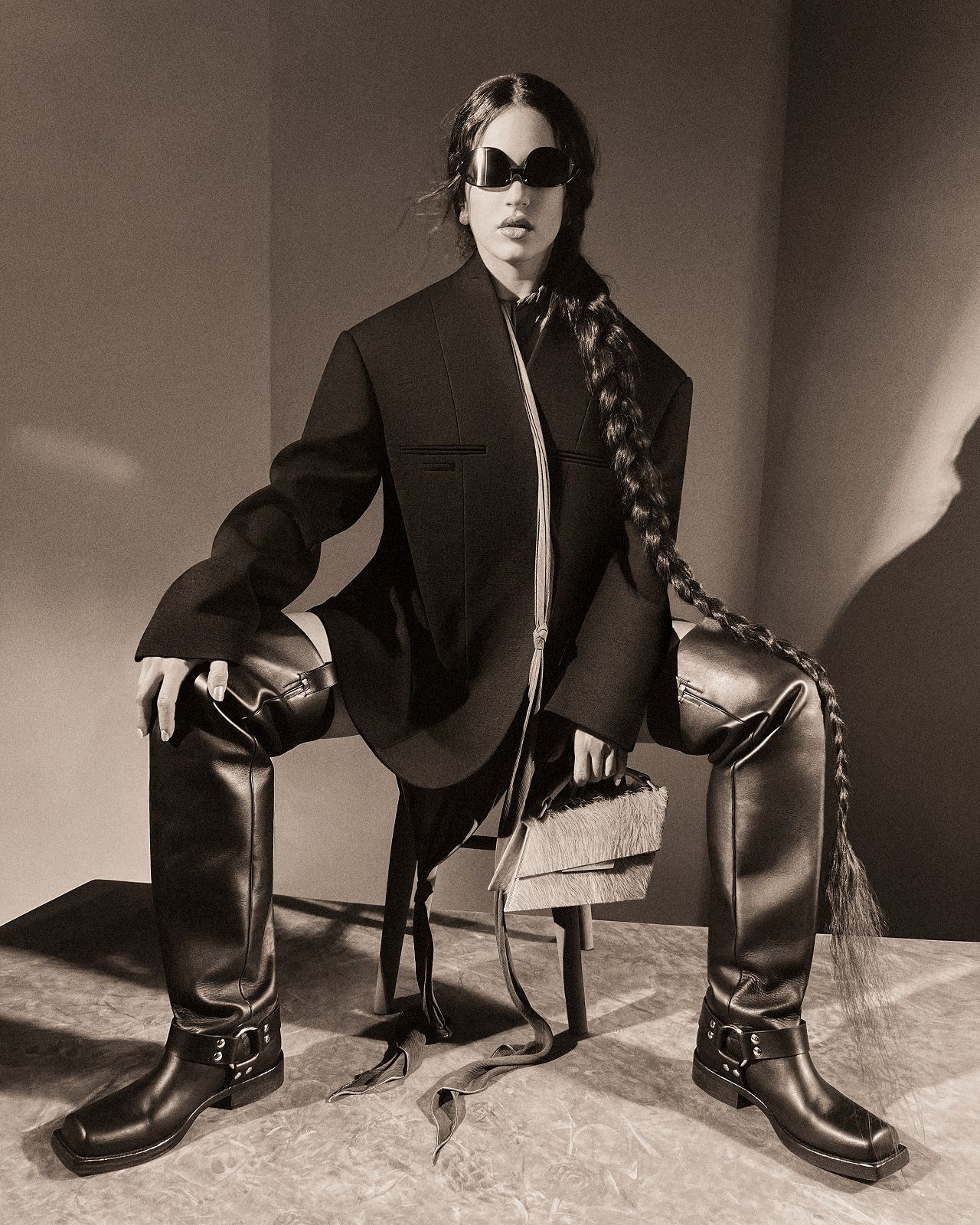 Rosalía transforms herself into a historical and trans-temporal muse for Acne Studios' new campaign. In front of the lens of Dutch artist Paul Kooiker, the singer, currently touring around the world with her third studio album Motomami, wears the most emblematic garments from the Scandinavian brand's fall/winter 2022 collection, all characterized by experimental materiality that is expressed in the fabrications and new interpretations of denim, jersey and leather garments. The favorites of the talented Catalan who loves Acne Studios for the way it takes care of fabrics, colors, and textures in a flawless and fresh way? The jersey boots and sunglasses.