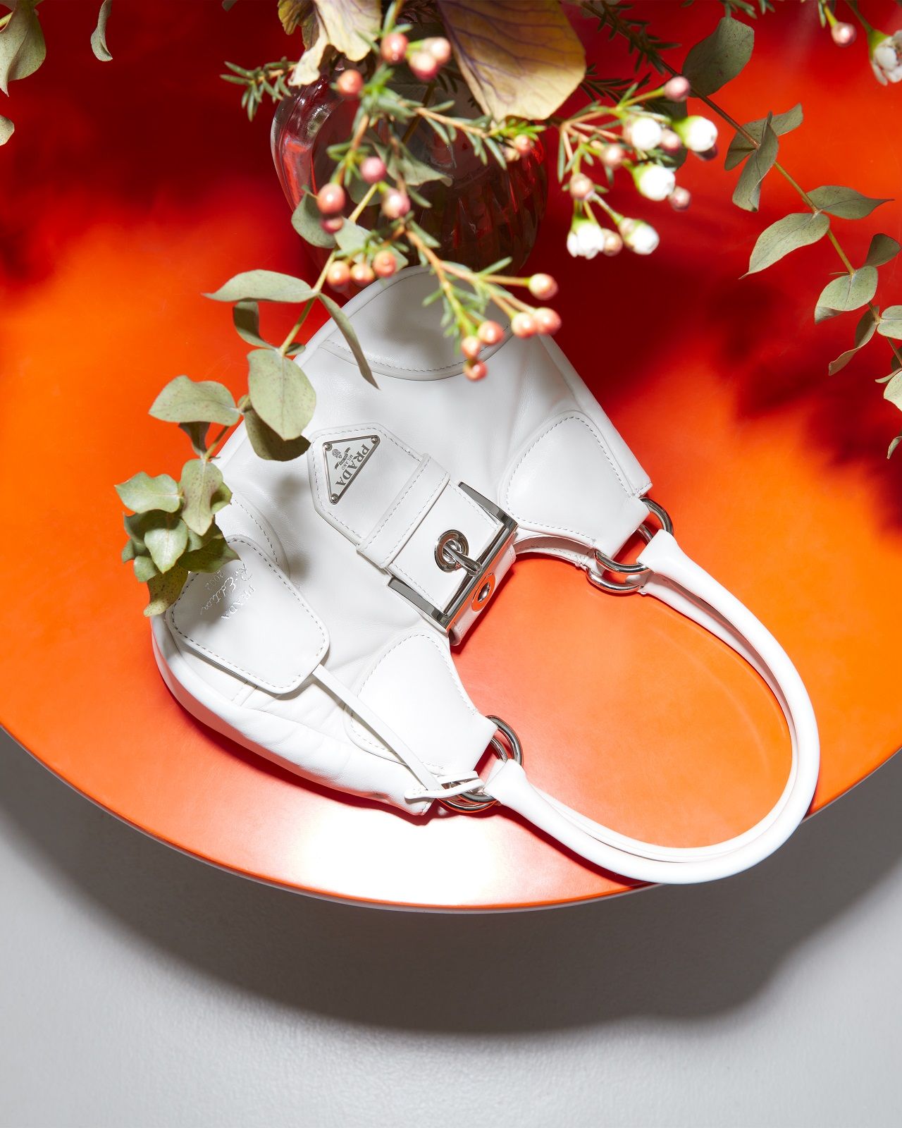 Versatile, colorful, small in size and a design that combines tradition and contemporaneity. Miuccia Prada and Raf Simons have revisited the iconic model from the early 2000s to breathe life into the season's new must-have accessory, which fascinates with its very name: Moon Bag. Debuting at the SS23 fashion show, the bag captivates with its curved, bold silhouette and ultra-soft nappa leather that has been treated ad hoc to give it a slightly rounded look that emphasizes the lightness of its shape. The secret of its appeal is the details that hark back to the history and craftsmanship of the Milanese brand. The first and most obvious is the large central metal clasp, which made its debut in the Spring/Summer 2002 collection and is now emblazoned with the triangular Prada logo in enameled metal, followed by the eyelet, an element from the world of sailing, offered in metal with a silver finish on the new object of desire. As usual with the brand's bags, the structured handles, detachable shoulder strap and tonne sur tonne key ring are not missing.