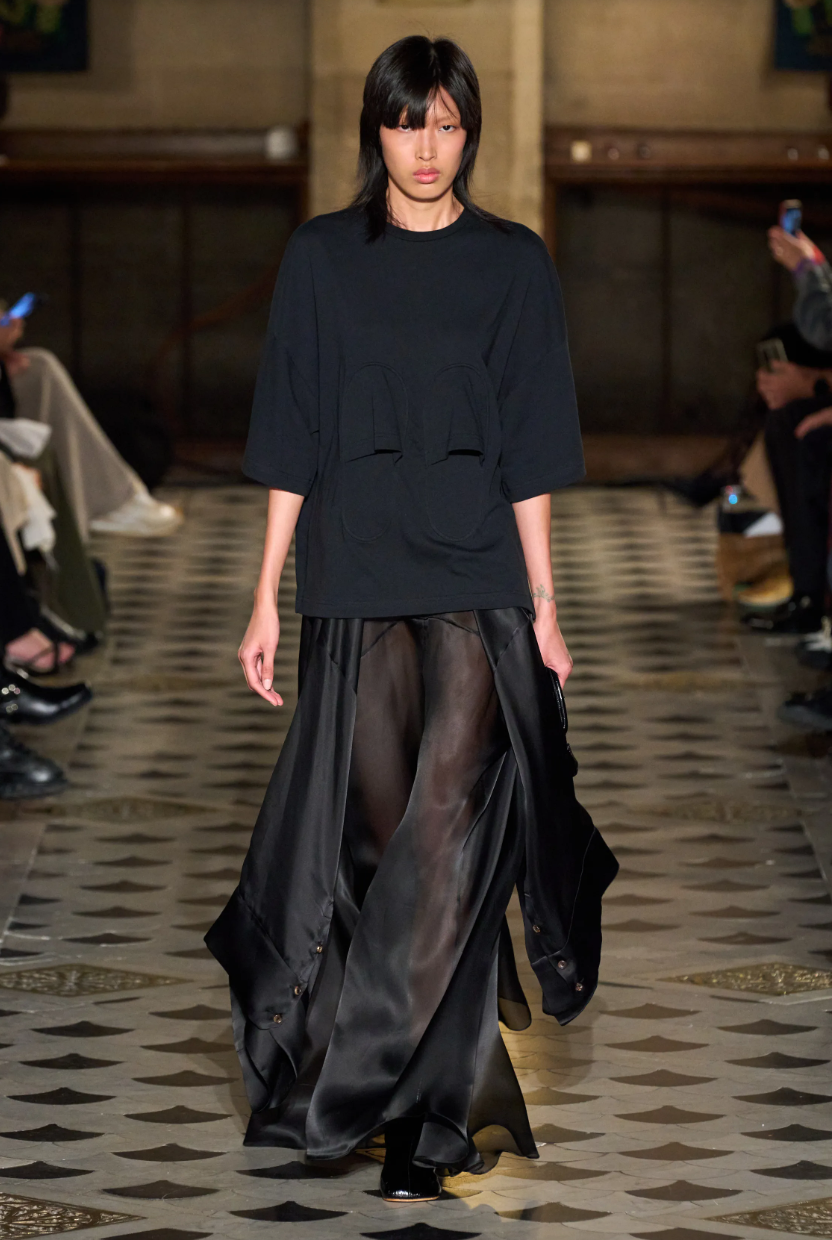 At the SS23 shows, sheer skirts were seen on the catwalks by: A.W.A.K.E MODE, where a delicate black was paired with an oversized tone-on-tone T-shirt; Cucculelli Shaheen's sumptuous Shaheen, which was studded with luminous embellishments, crystals and the like; Eckaus Latta's between micro fretwork paired with a metallic glitter top; Marni's in a purifying total white with a skirt with a more than dizzying slit and a crop top; and Paco Rabanne's that mixed pink, black and silver with absolute harmony.