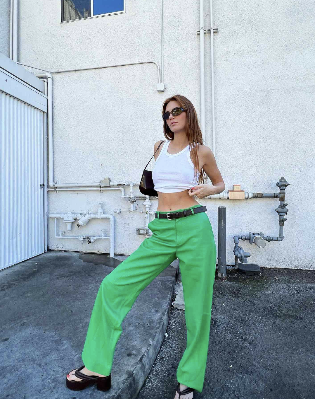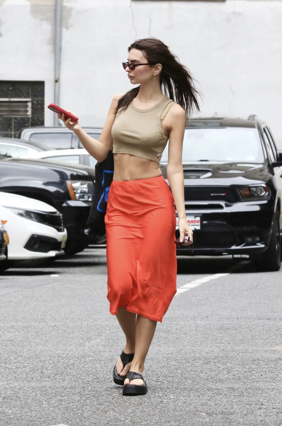 Celebrities and influencers spotted wearing chunky shoes include Kendall Jenner in maxi-soled flip-flops, which she wore with green trousers and a white tank top, and Emrata in black sandals, an orange midi skirt and a nude micro top; DuaLipa in black chunky flip-flops and a knee-length dress in lightweight jersey with strategic cut-outs; Annacarla Dall'Avo in green Suicoke and a fluttery mini dress; Pernille Teisbaek in beige chunky sandals, black trousers and a natural shirt and jacket.